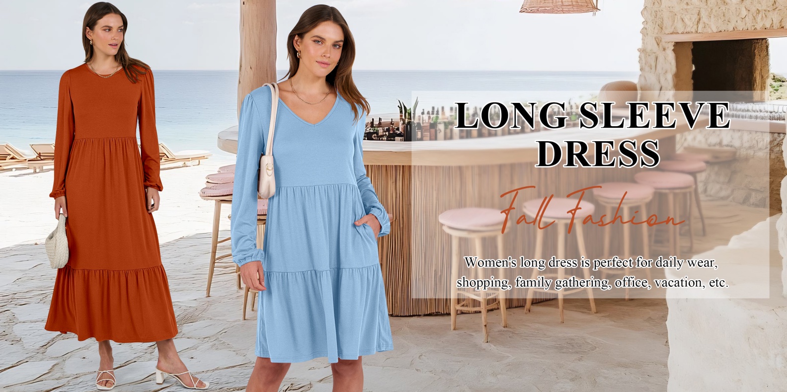 ANRABESS Womens Long Sleeve Dress 2025 Fall Casual V Neck Tiered Flowy Short Dresses Beach Travel Vacation Outfits(Navy Blue)