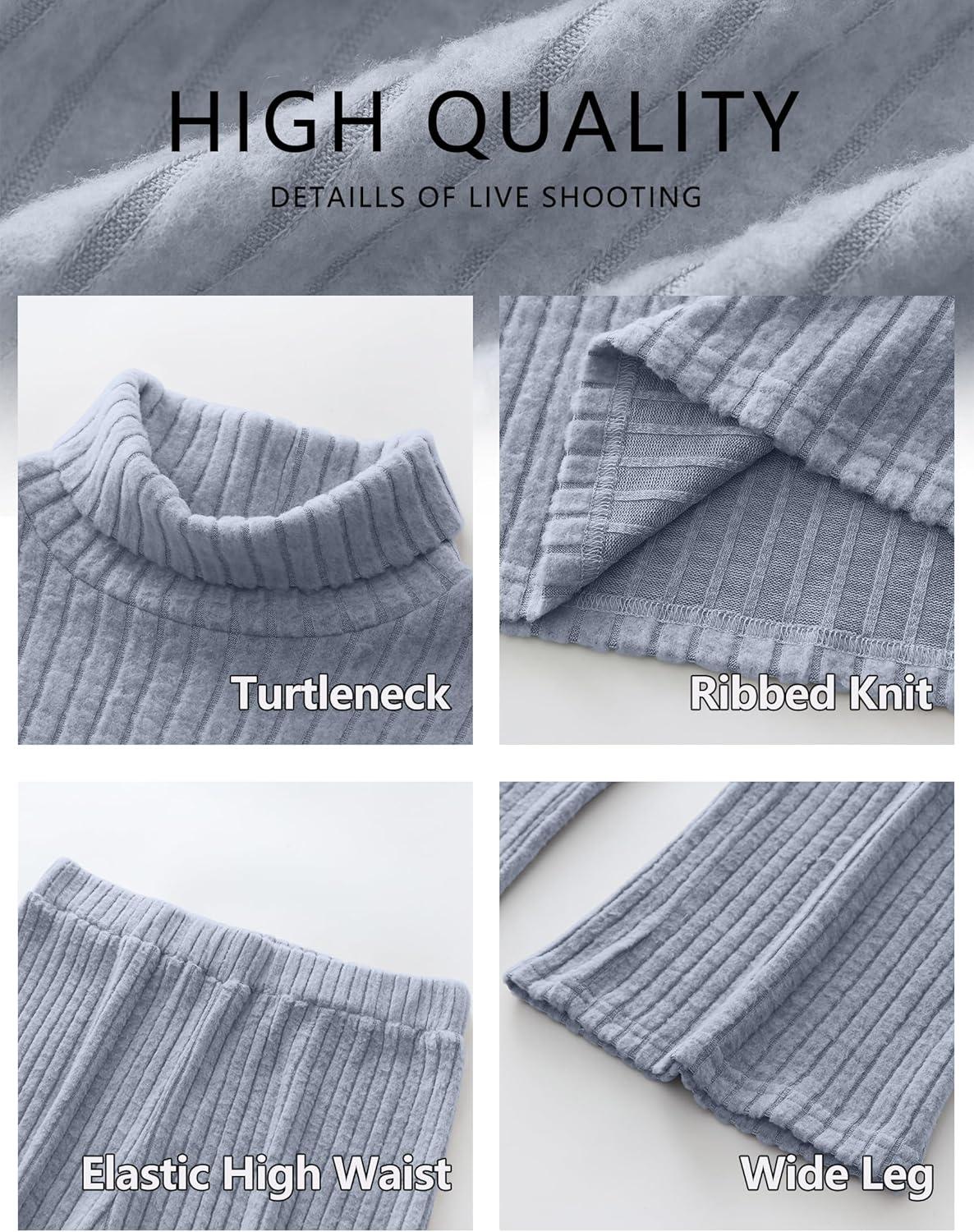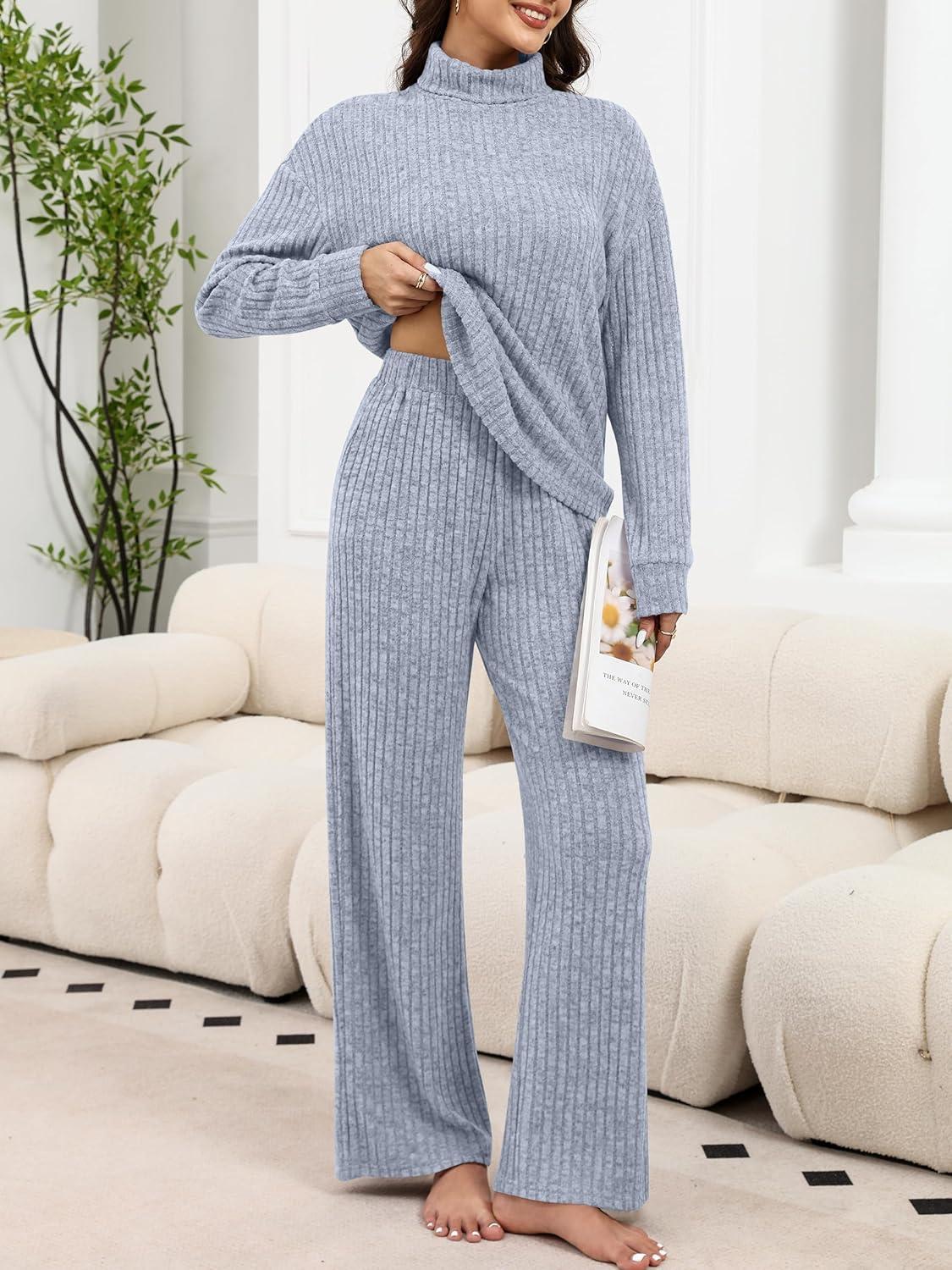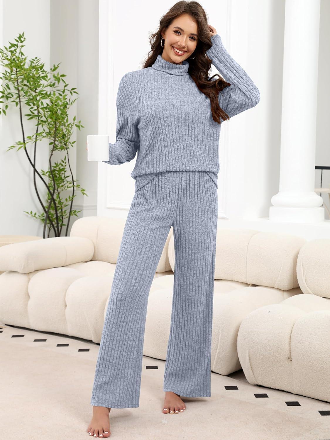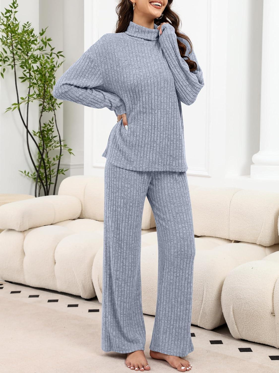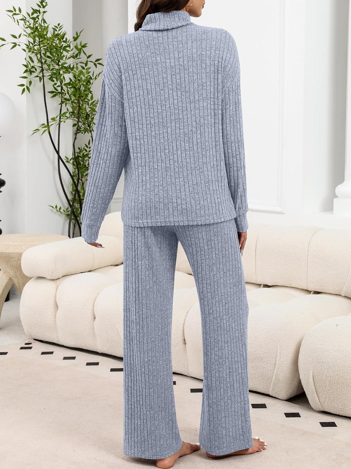 ANRABESS 2 Piece Lounge Sets for Women Turtleneck Pajama Knit Long Sleeve Tops Pants Matching Pj Set Casual 2025 Fall Clothes(Dusty Blue)
