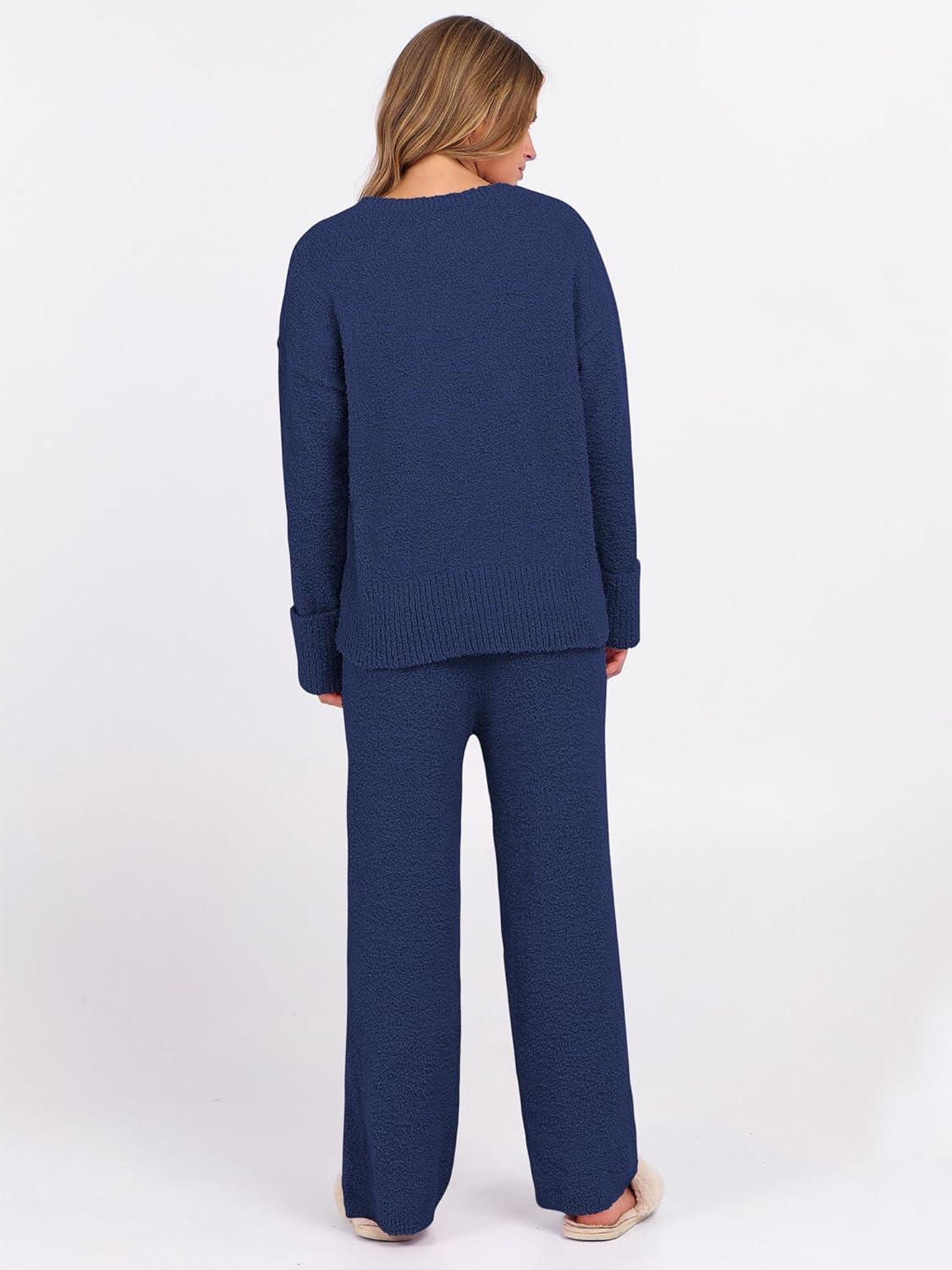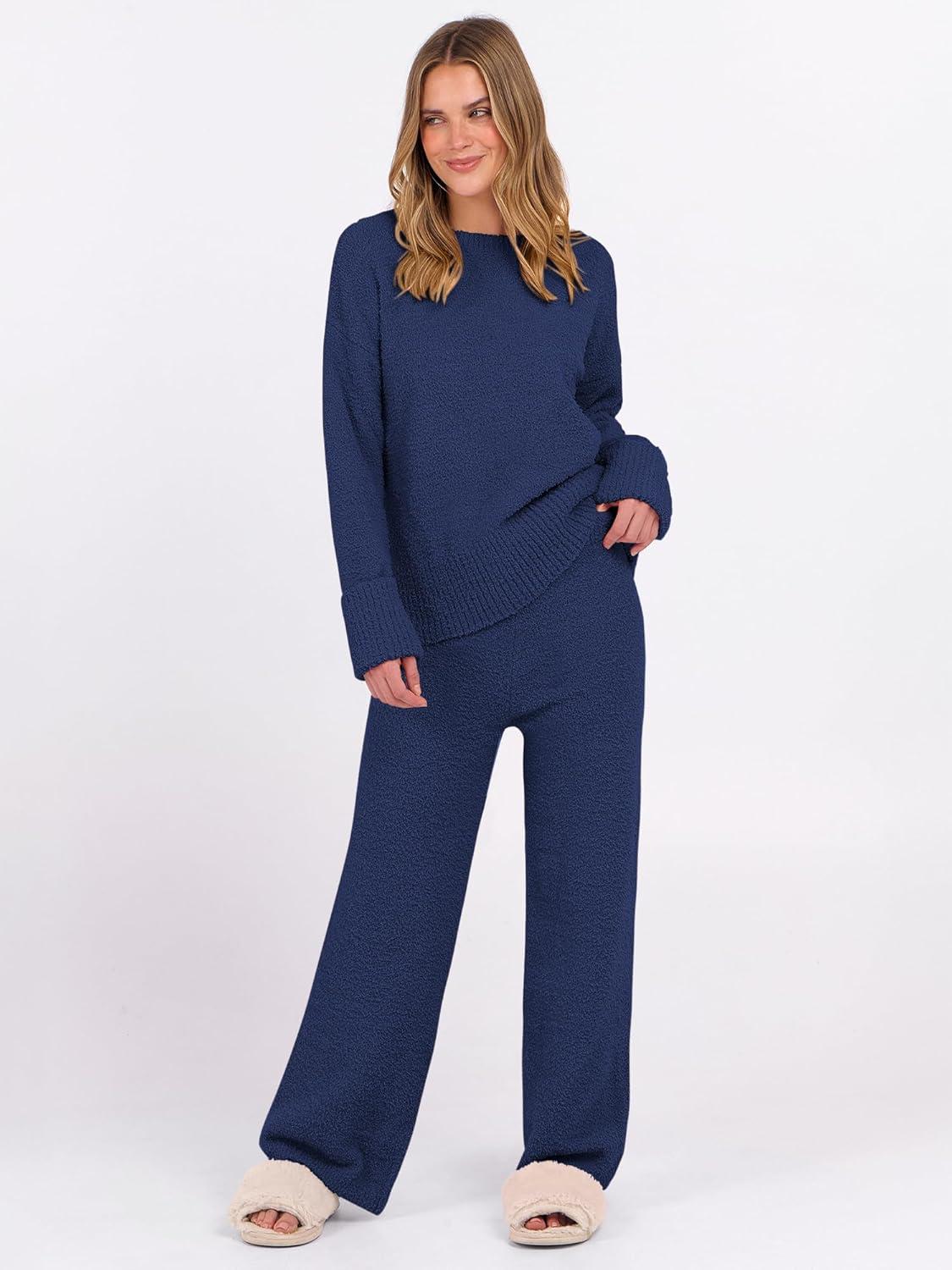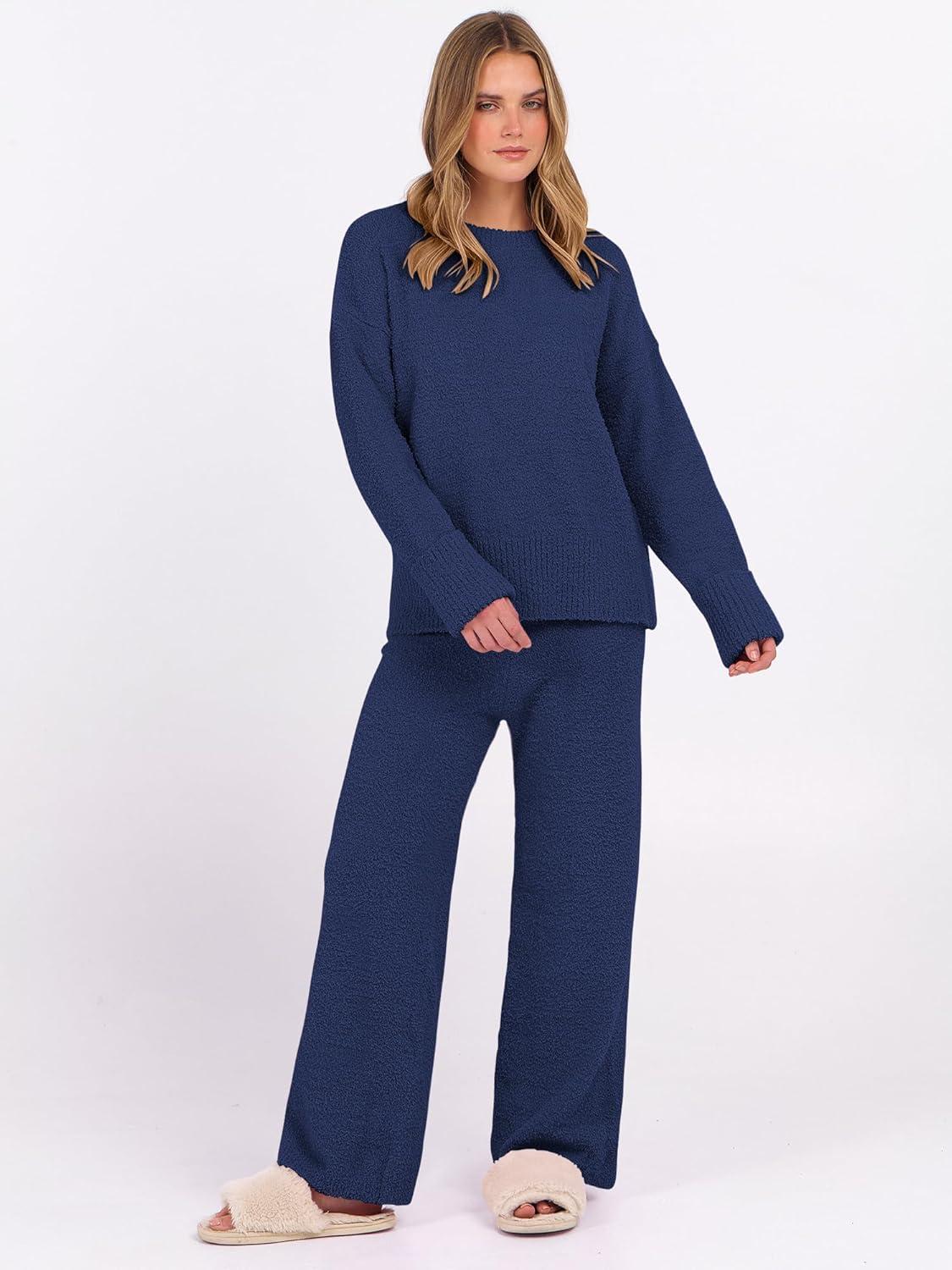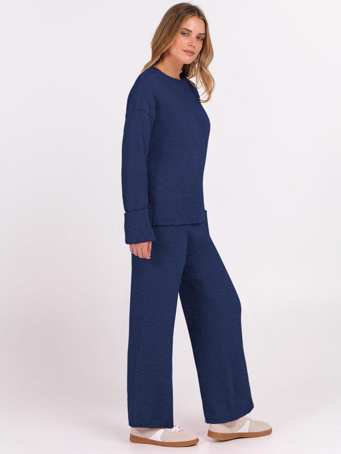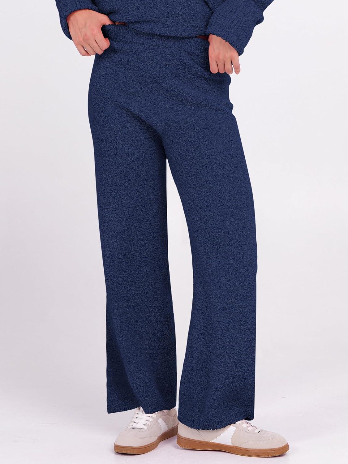 ANRABESS 2 Piece Sets for Women Fall Fuzzy Fleece Pajama Sweater Knit Top Wide Leg Pants Loungewear 2025 Winter Cozy Outfits(Navy Blue)
