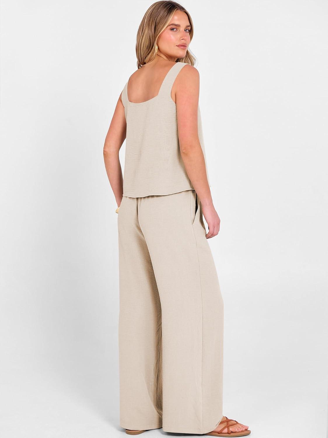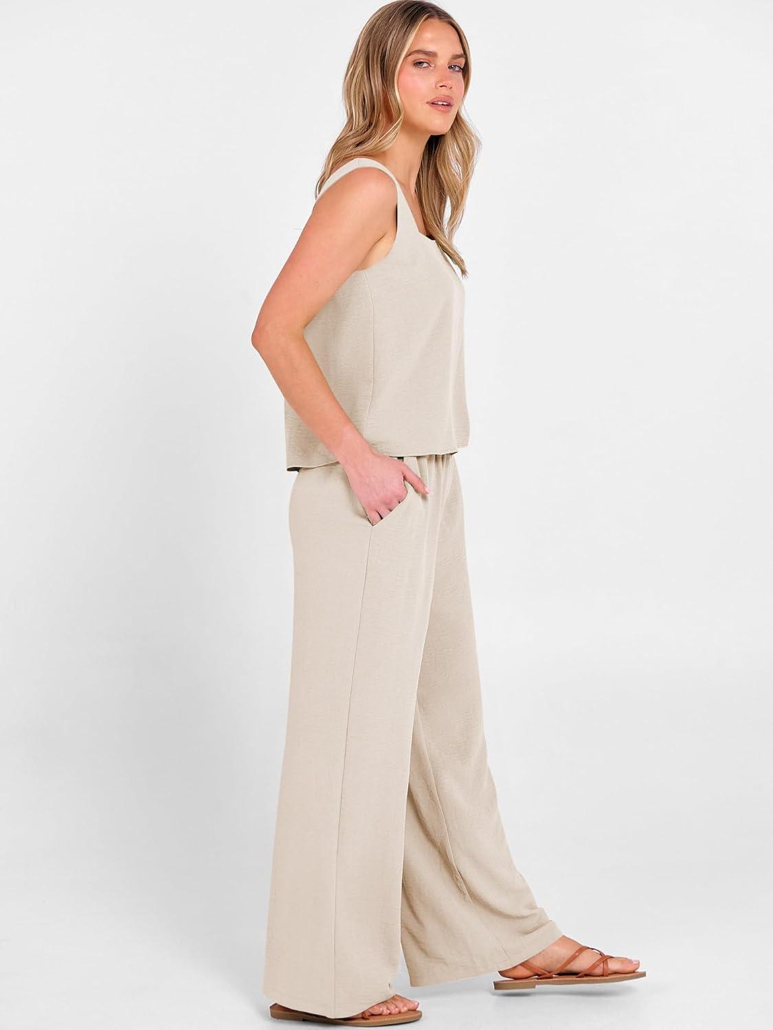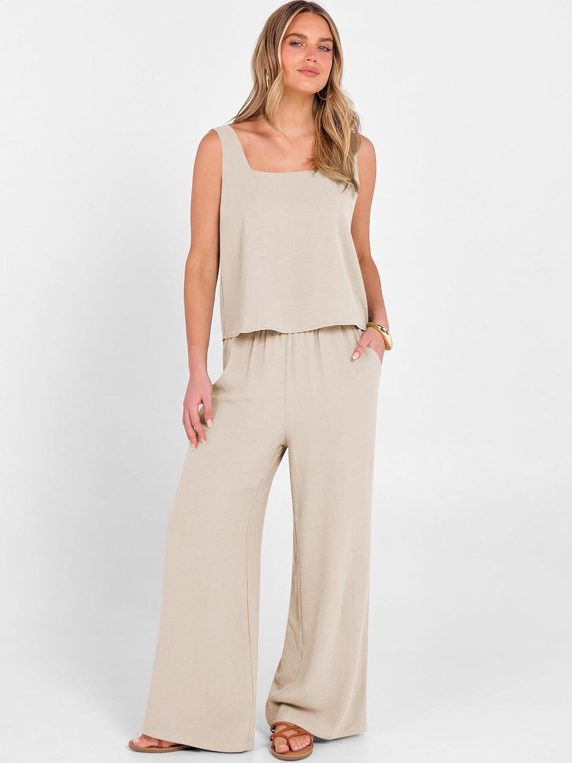 ANRABESS 2 Piece Sets for Women Outfits Lounge Matching Casual Travel Wide Leg Pants Crop Top Summer Vacation Beach Clothes(Beige)