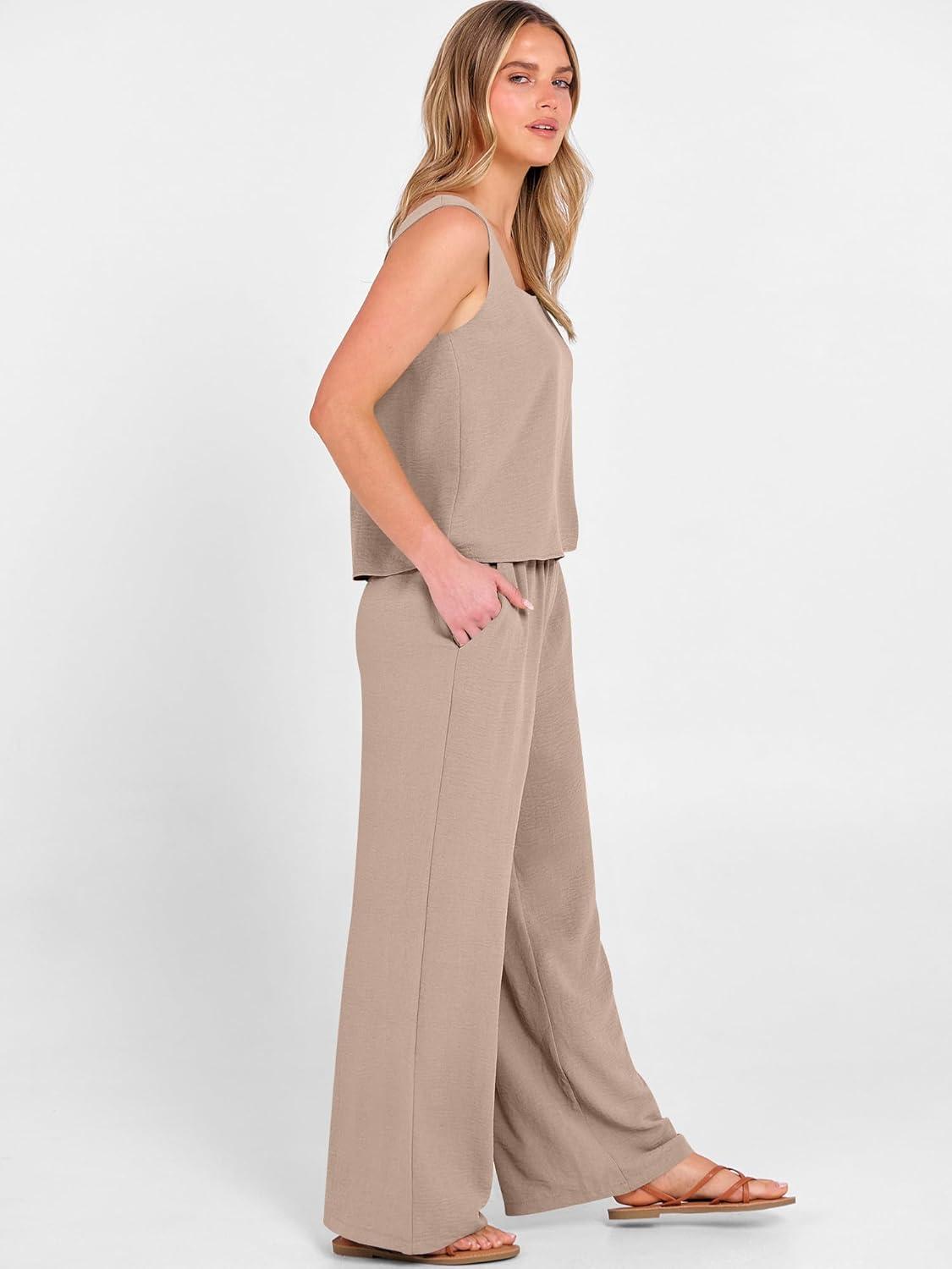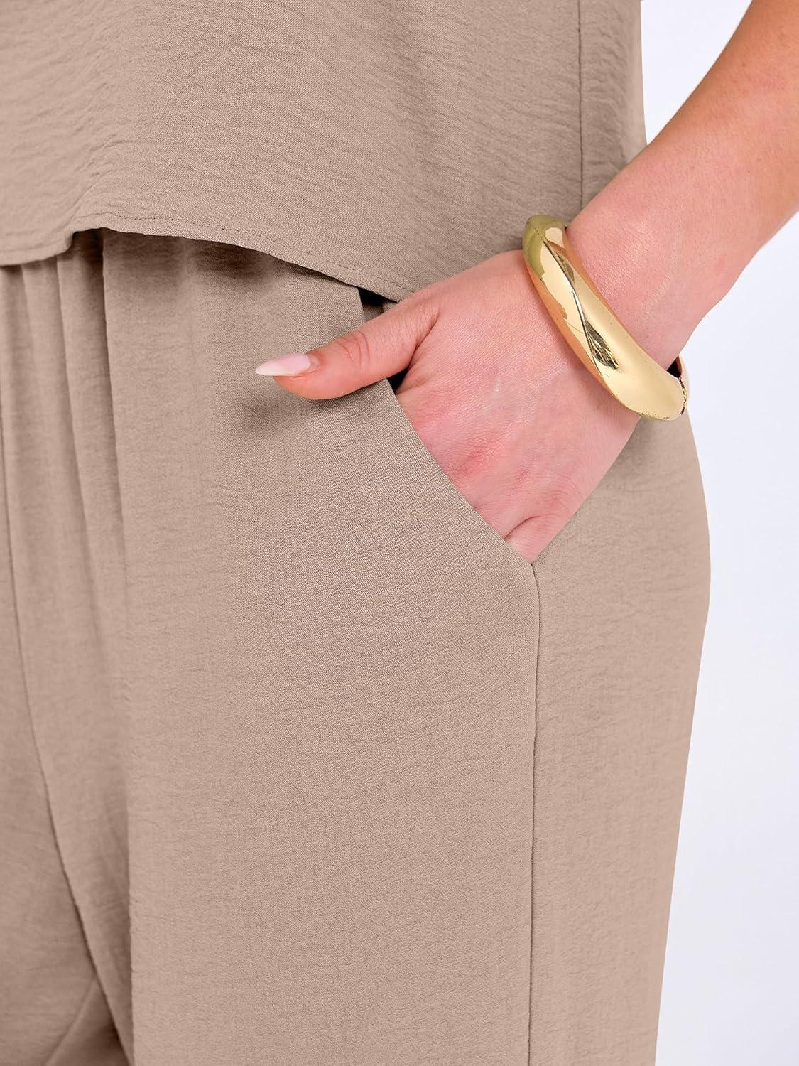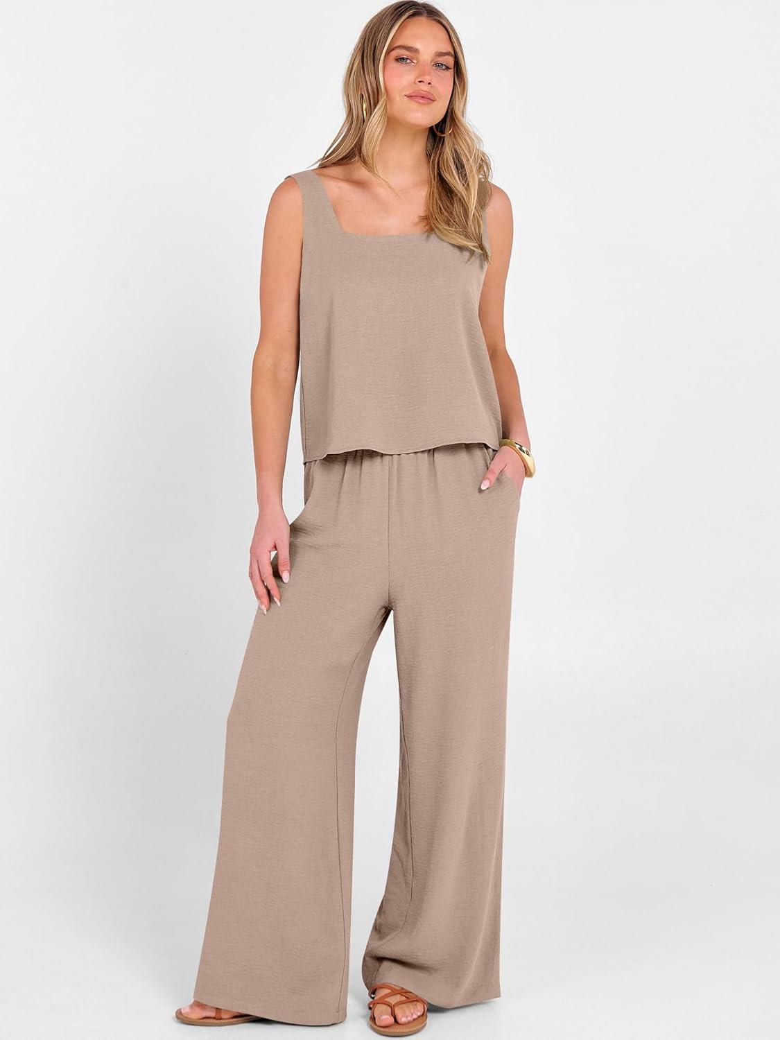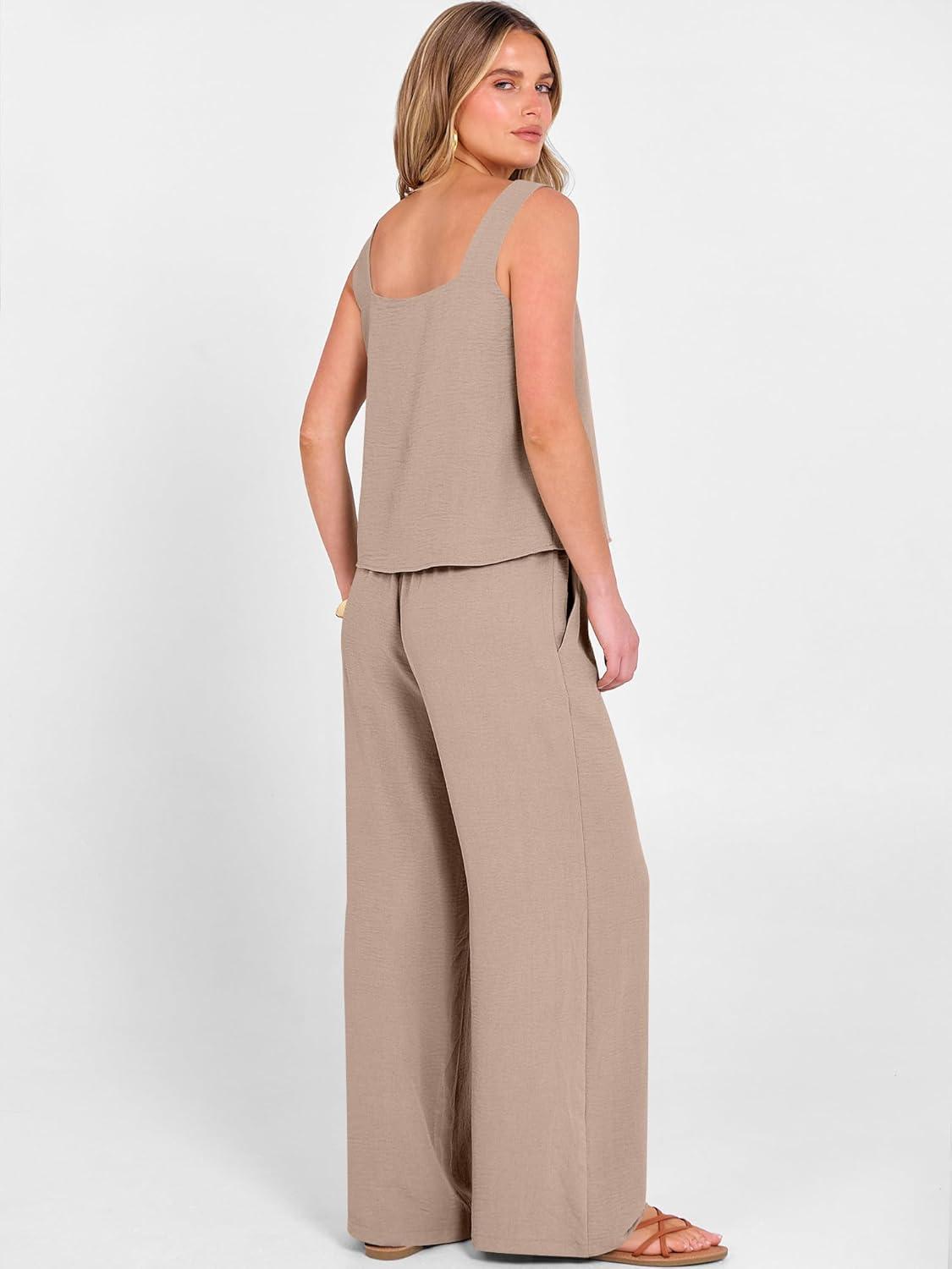 ANRABESS 2 Piece Sets for Women Outfits Lounge Matching Casual Travel Wide Leg Pants Crop Top Summer Vacation Beach Clothes(Brown)