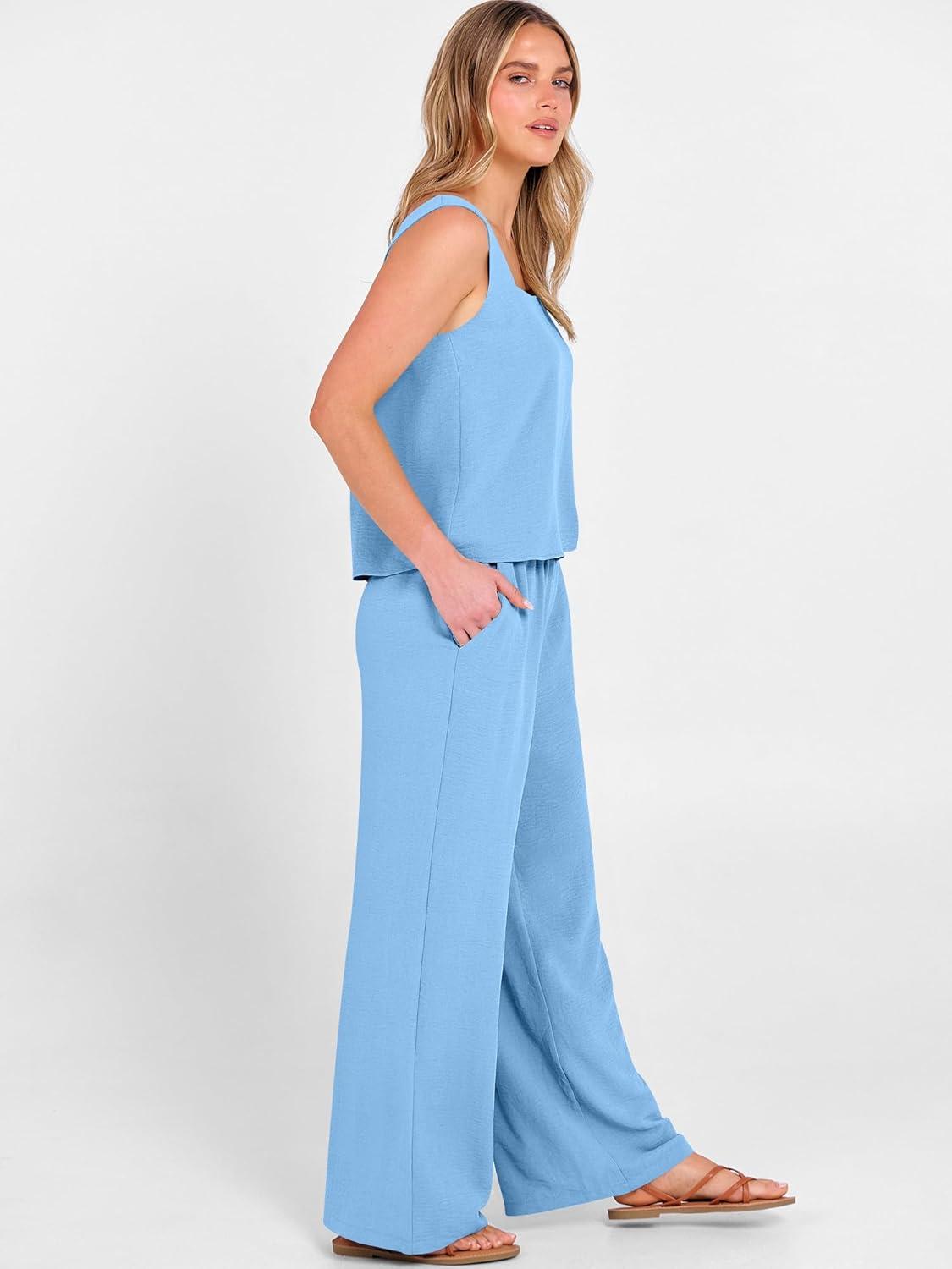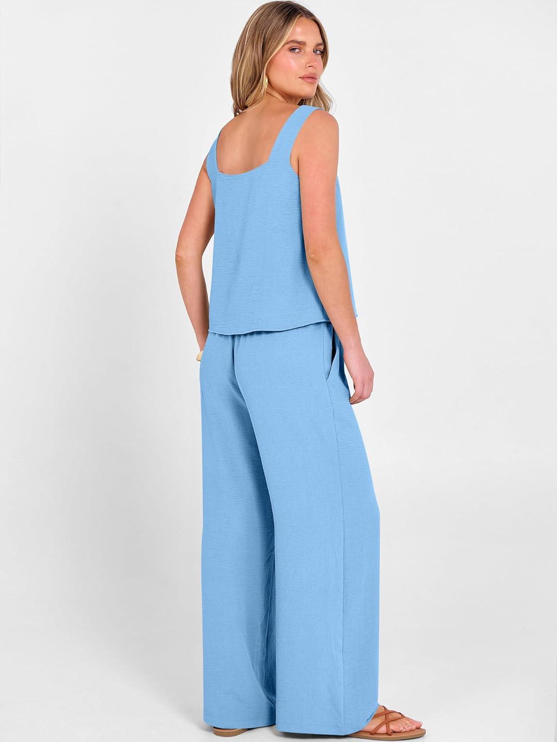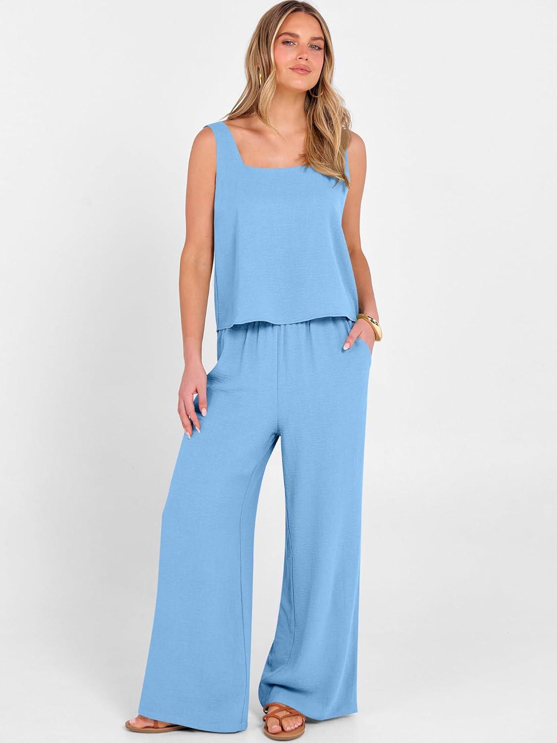 ANRABESS 2 Piece Sets for Women Outfits Lounge Matching Casual Travel Wide Leg Pants Crop Top Summer Vacation Beach Clothes(Sky Blue)