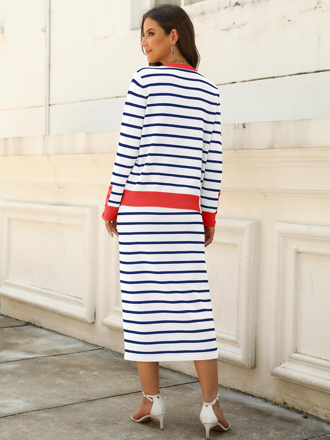 ANRABESS 2 Piece Skirts Sets For Women Fall Fashion 2025 Striped Sweater Midi Dress Knit Lounge Travel Outfits Winter Clothes(White Blue Red)