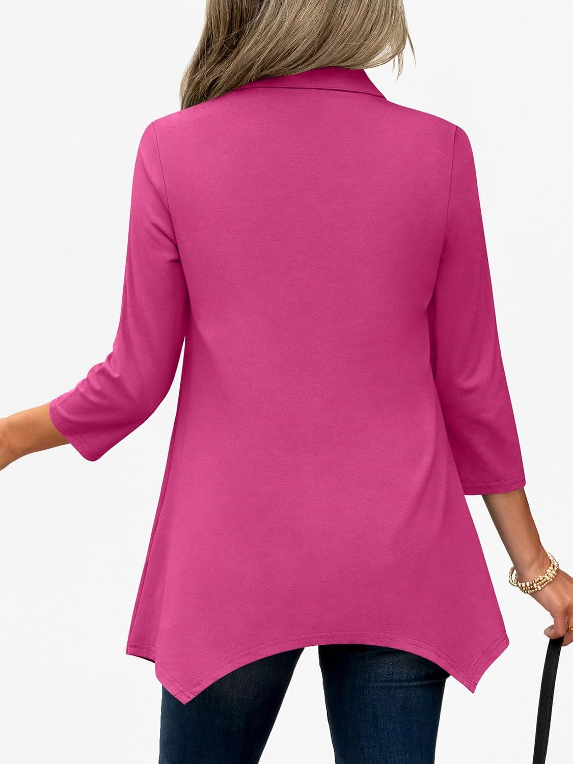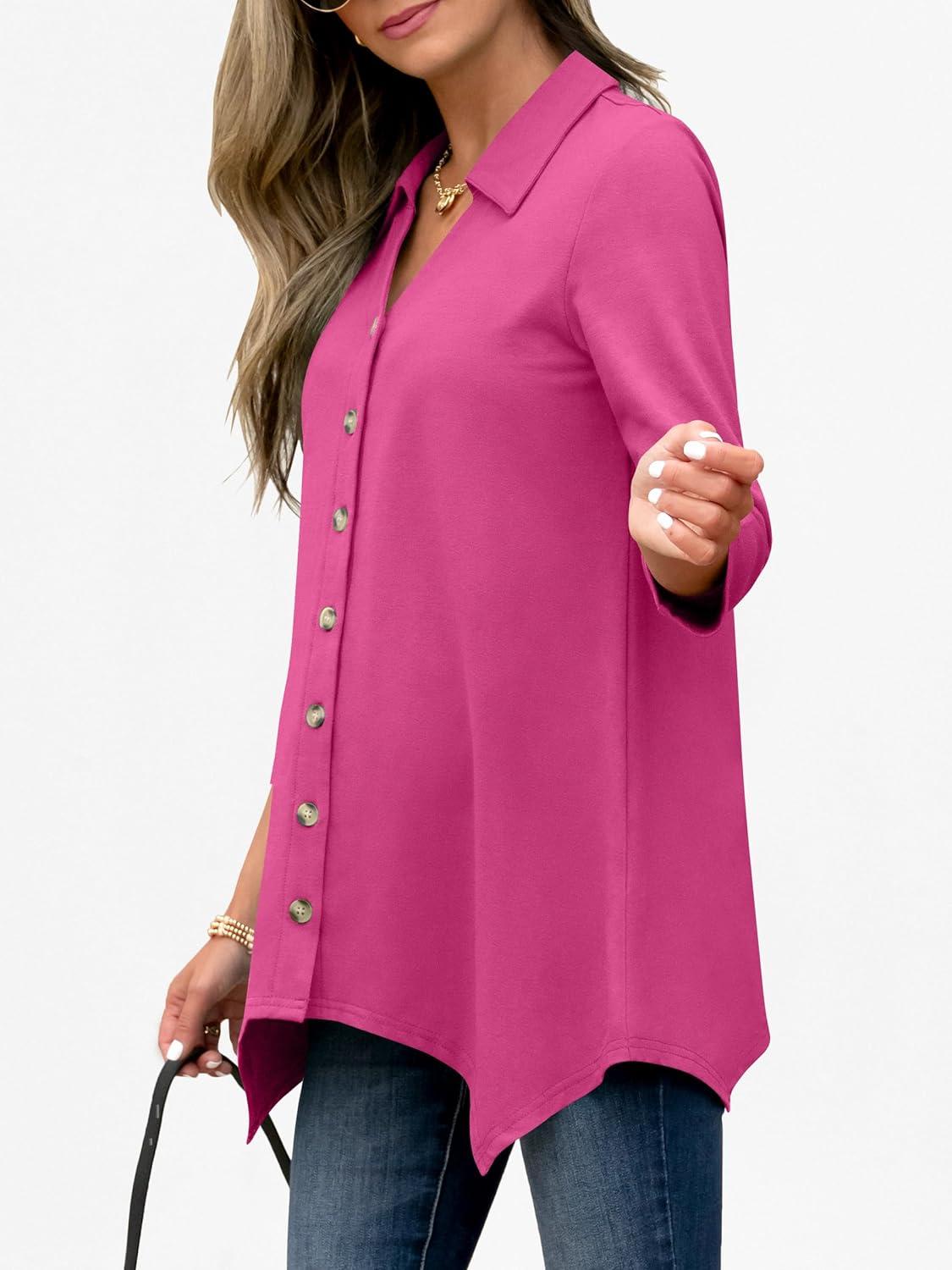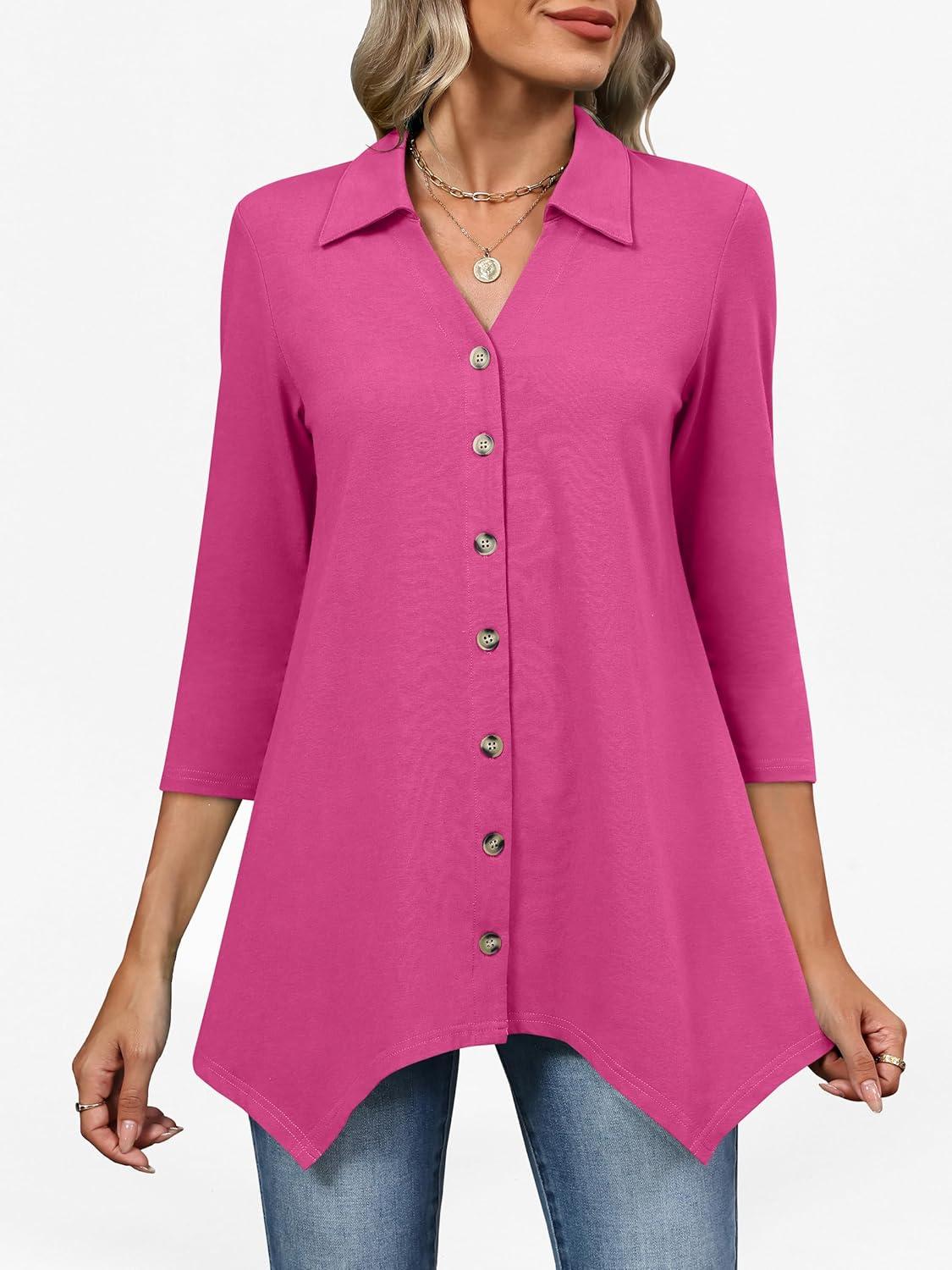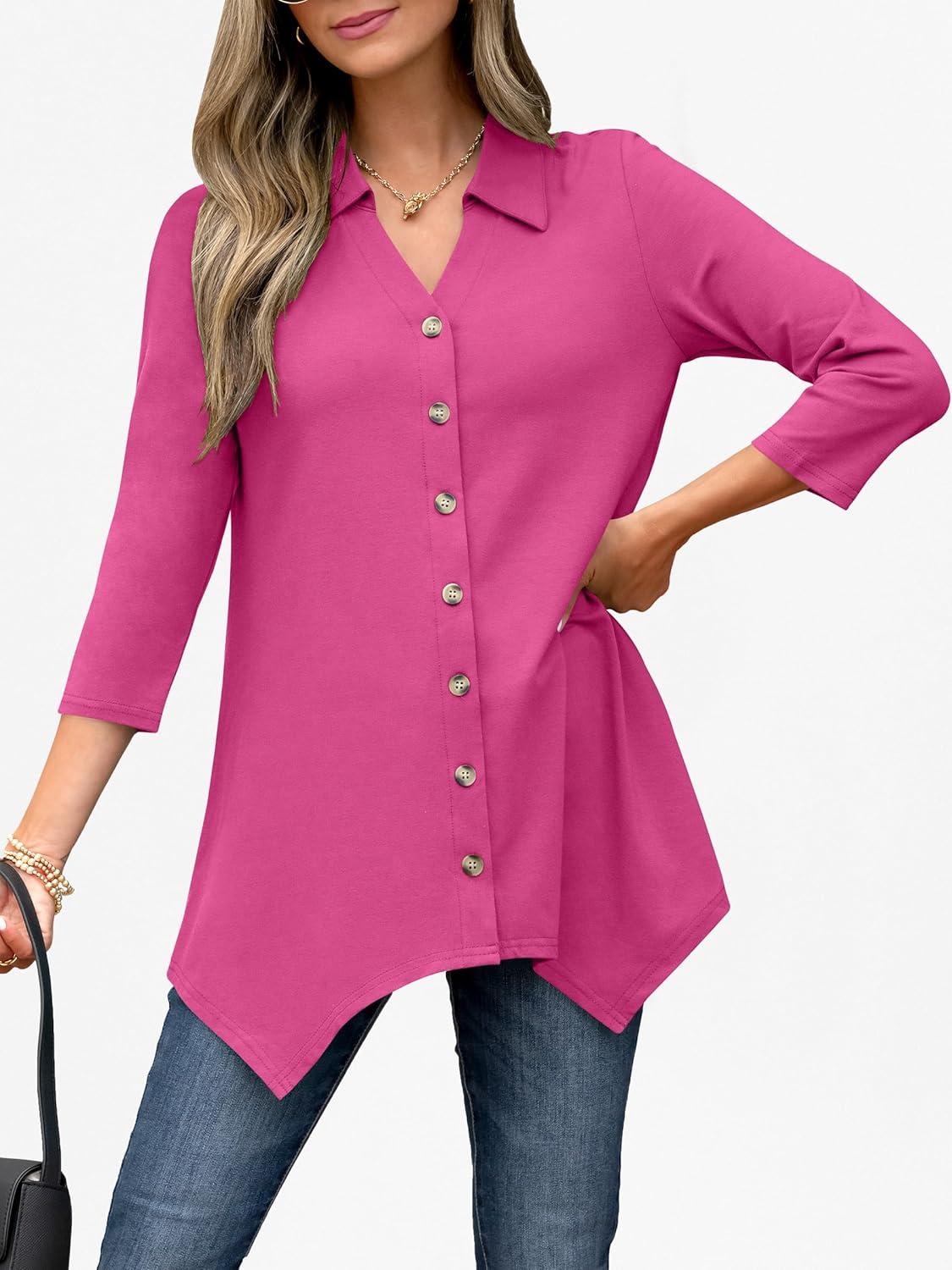 ANRABESS 3/4 Sleeve Tunic Tops for Women Lapel V Neck Button Down Shirts Business Dressy Casual Blouse with Asymmetrical Hem(Hot Pink)