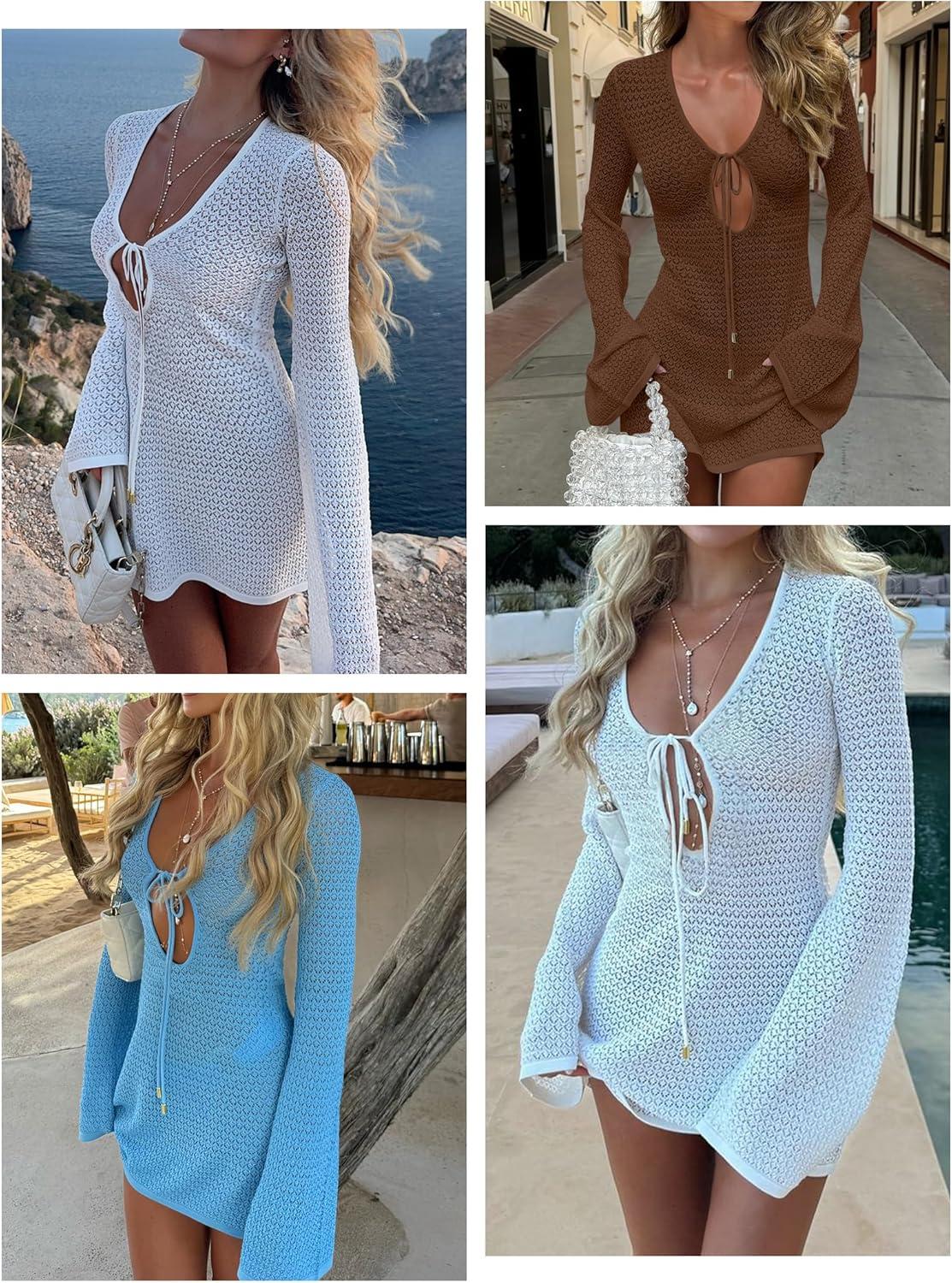 ANRABESS Beach Cover Ups for Women Crochet Swimsuit Bathing Suit Swimwear Bikini Mesh Knit Dress 2025 Summer Vacation Outfits(Brown)