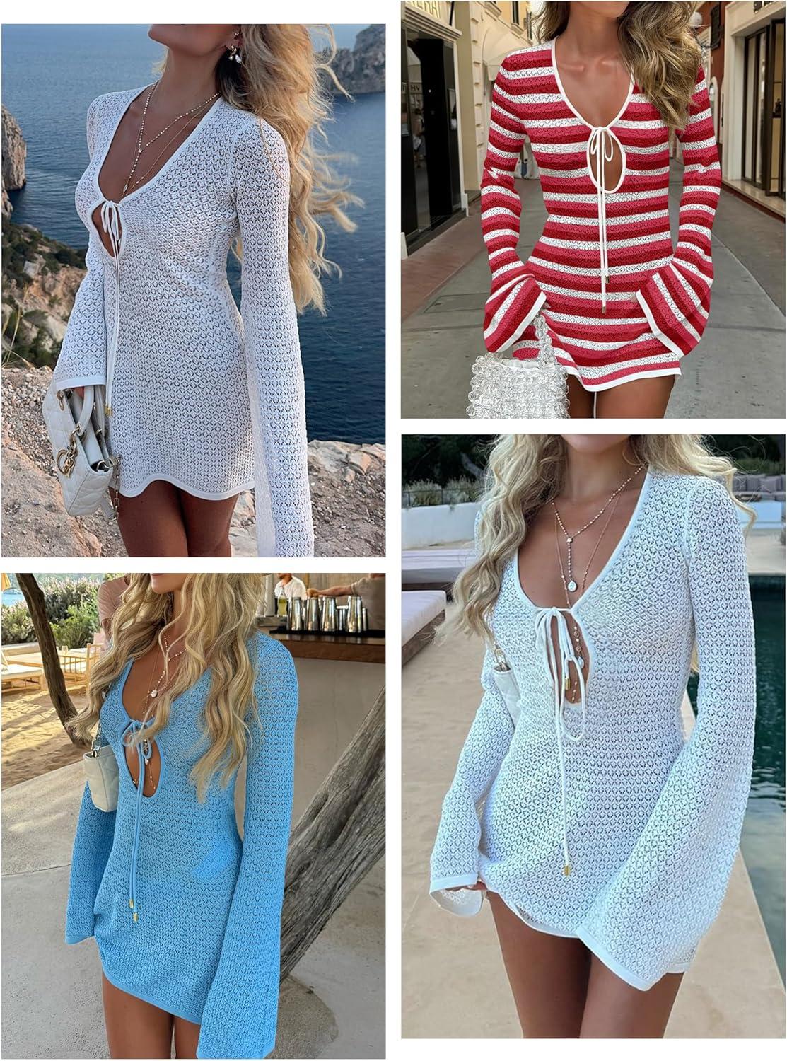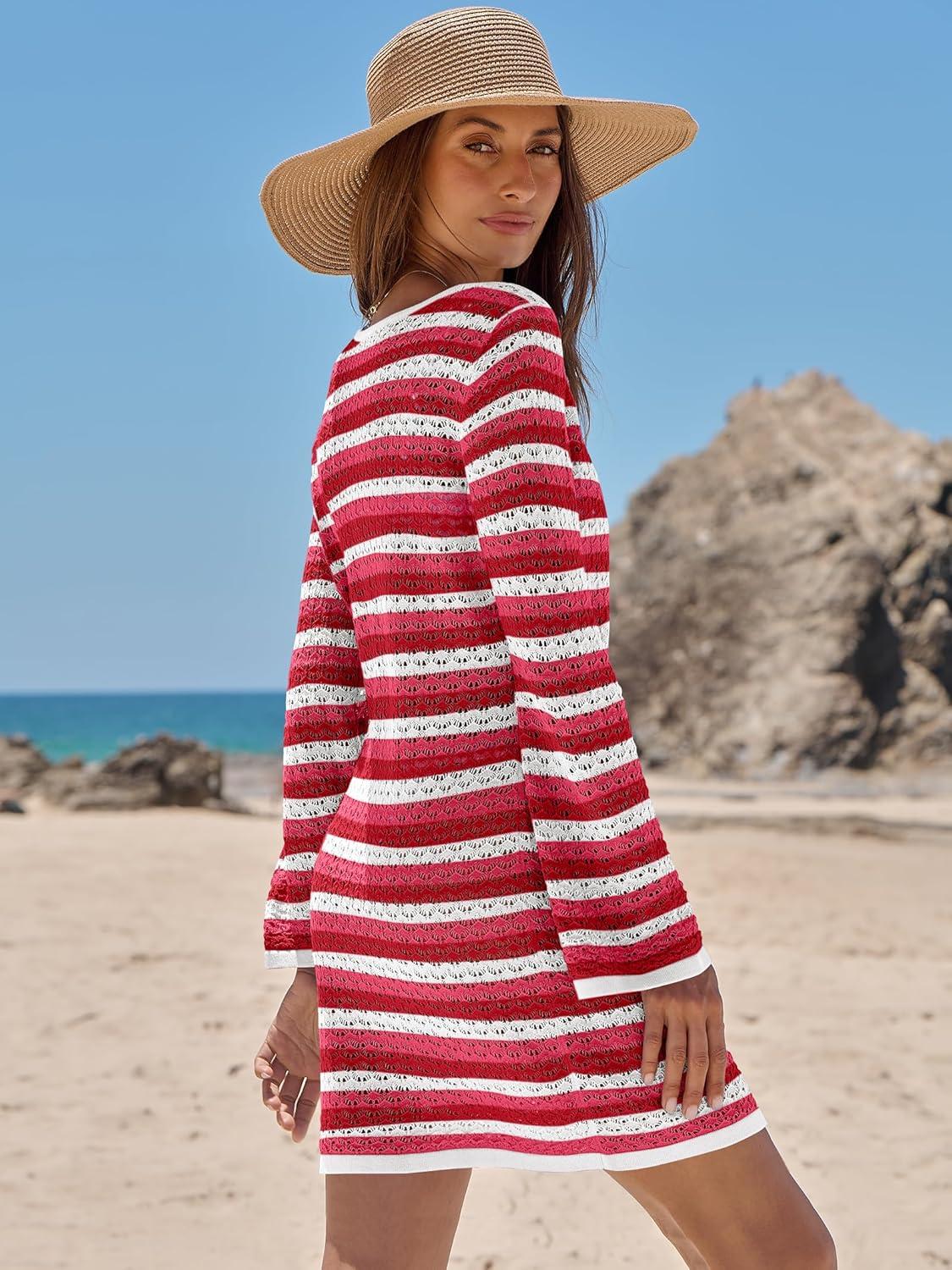 ANRABESS Beach Cover Ups for Women Crochet Swimsuit Bathing Suit Swimwear Bikini Mesh Knit Dress 2025 Summer Vacation Outfits(Red White Stripe)
