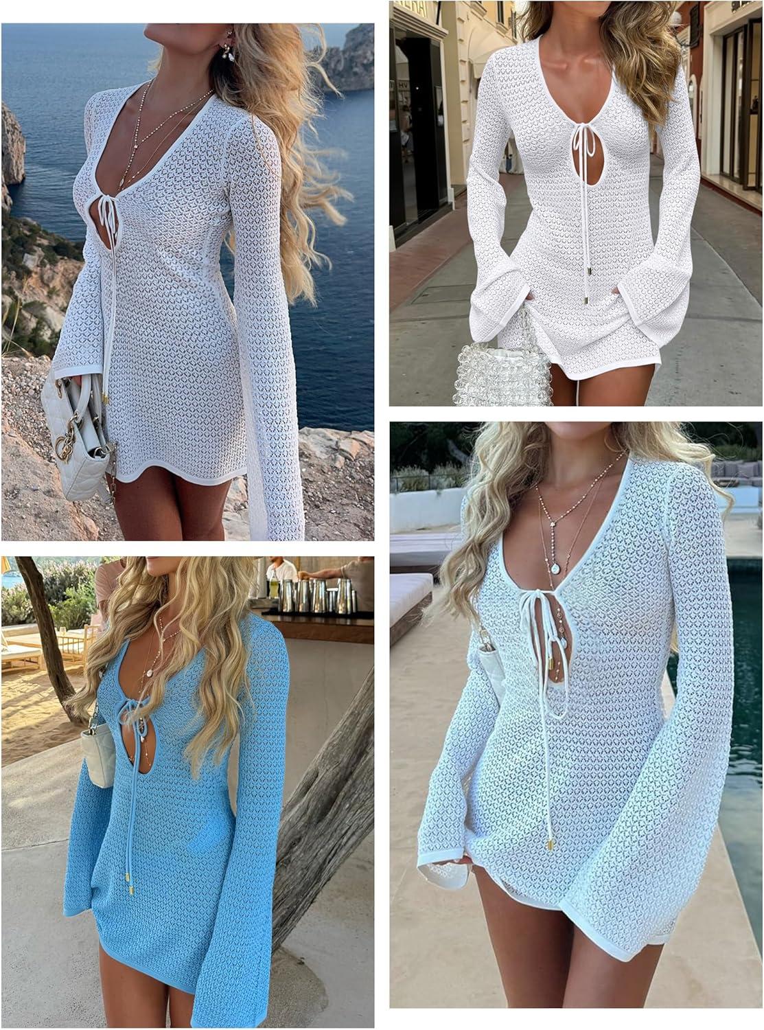 ANRABESS Beach Cover Ups for Women Crochet Swimsuit Bathing Suit Swimwear Bikini Mesh Knit Dress 2025 Summer Vacation Outfits(White)
