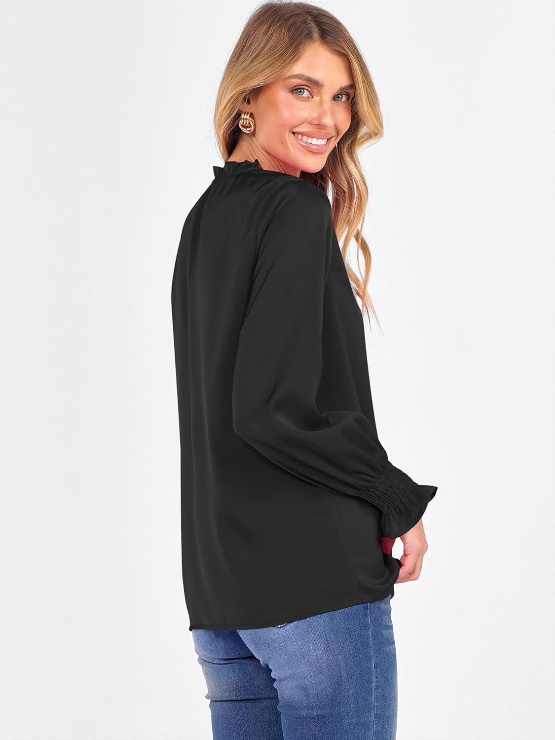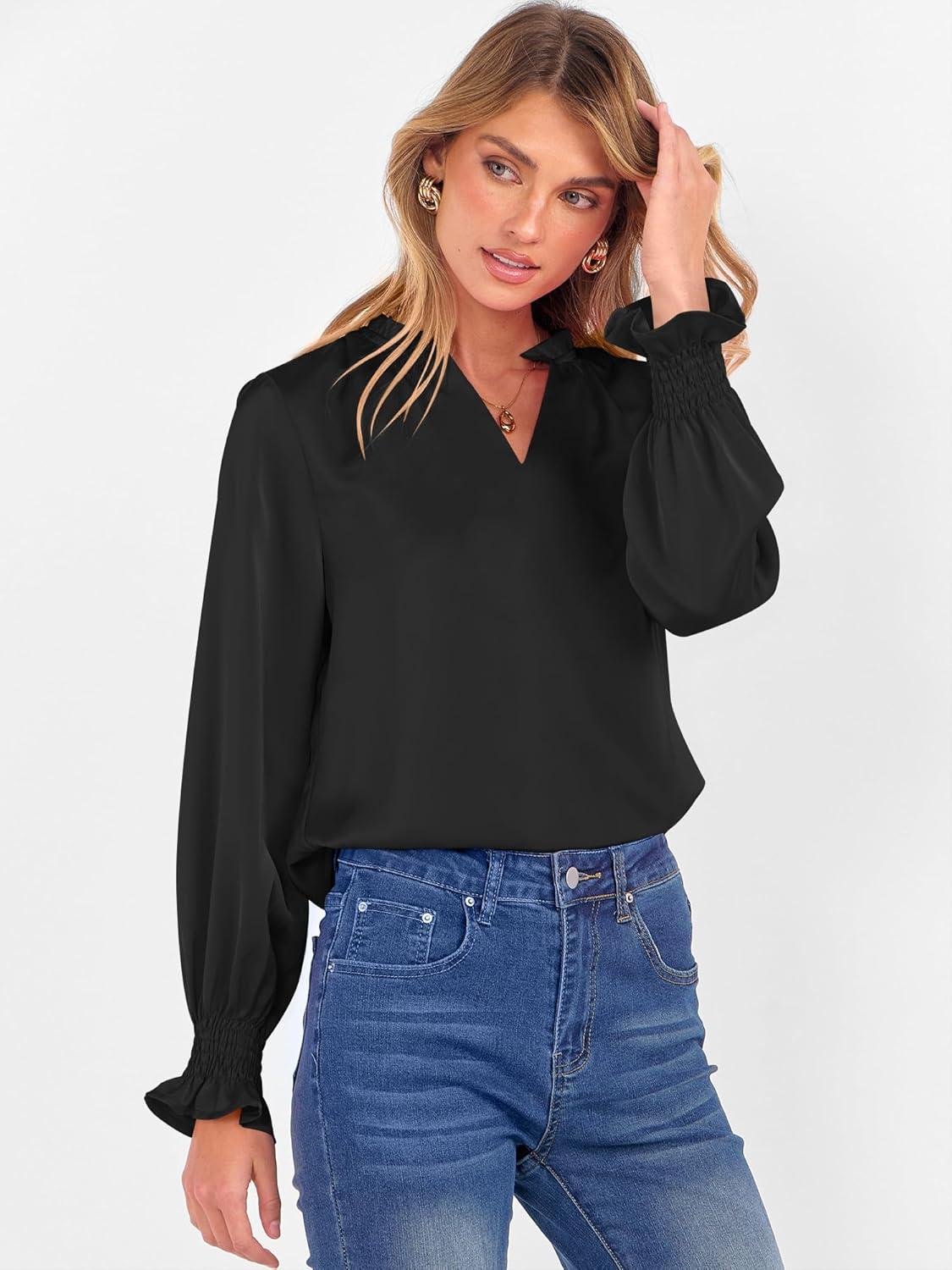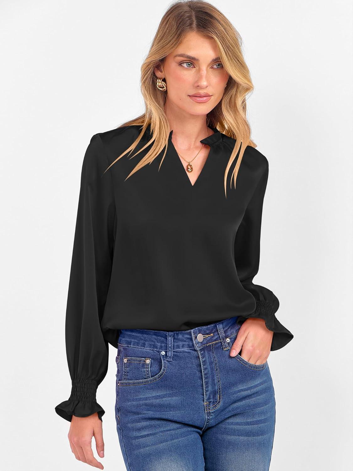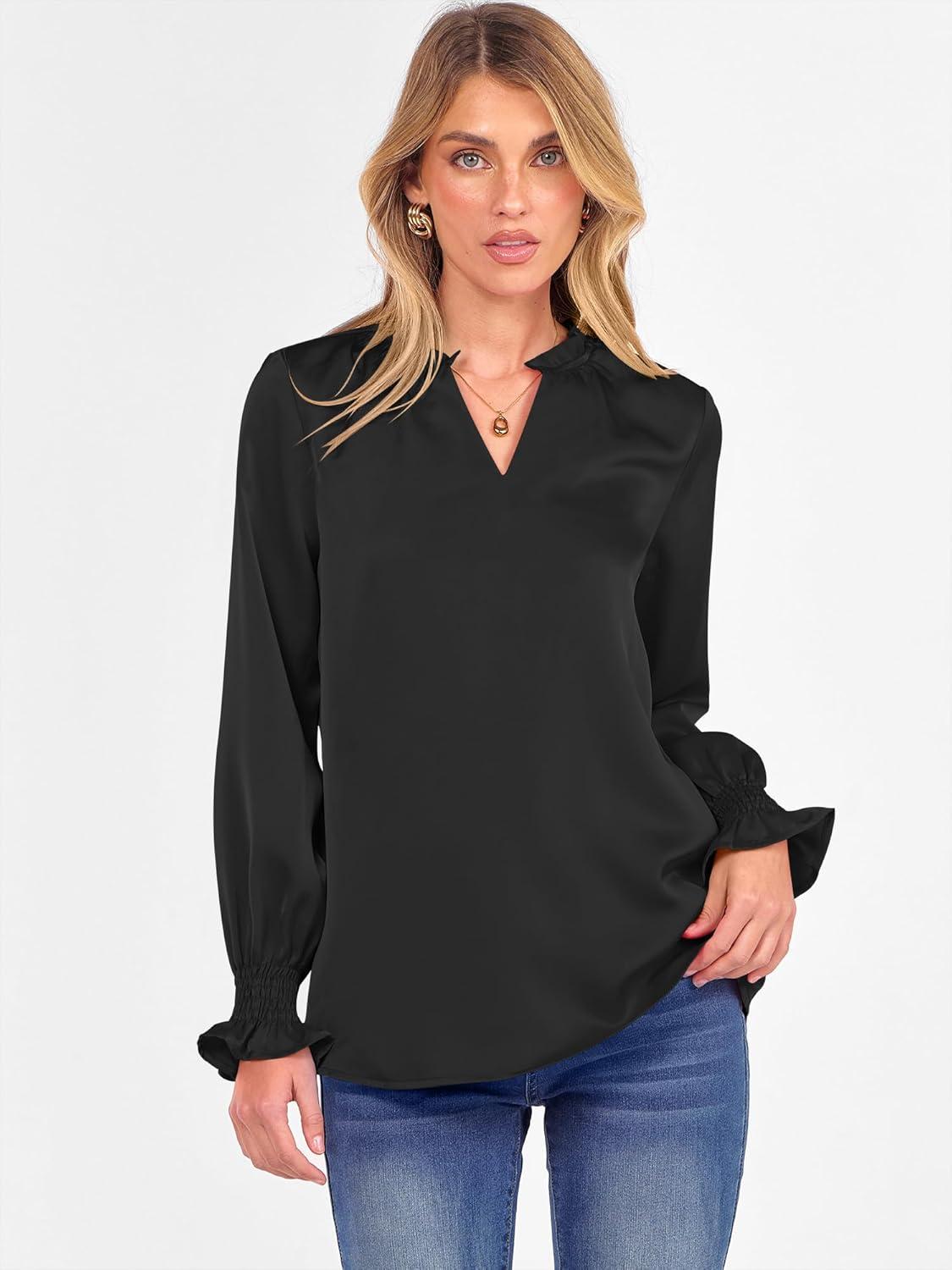 ANRABESS Blouse for Women Dressy Casual Puff Long Sleeve Shirts V Neck Satin Business Casual Work Tops 2025 Fall Outfits(Black)
