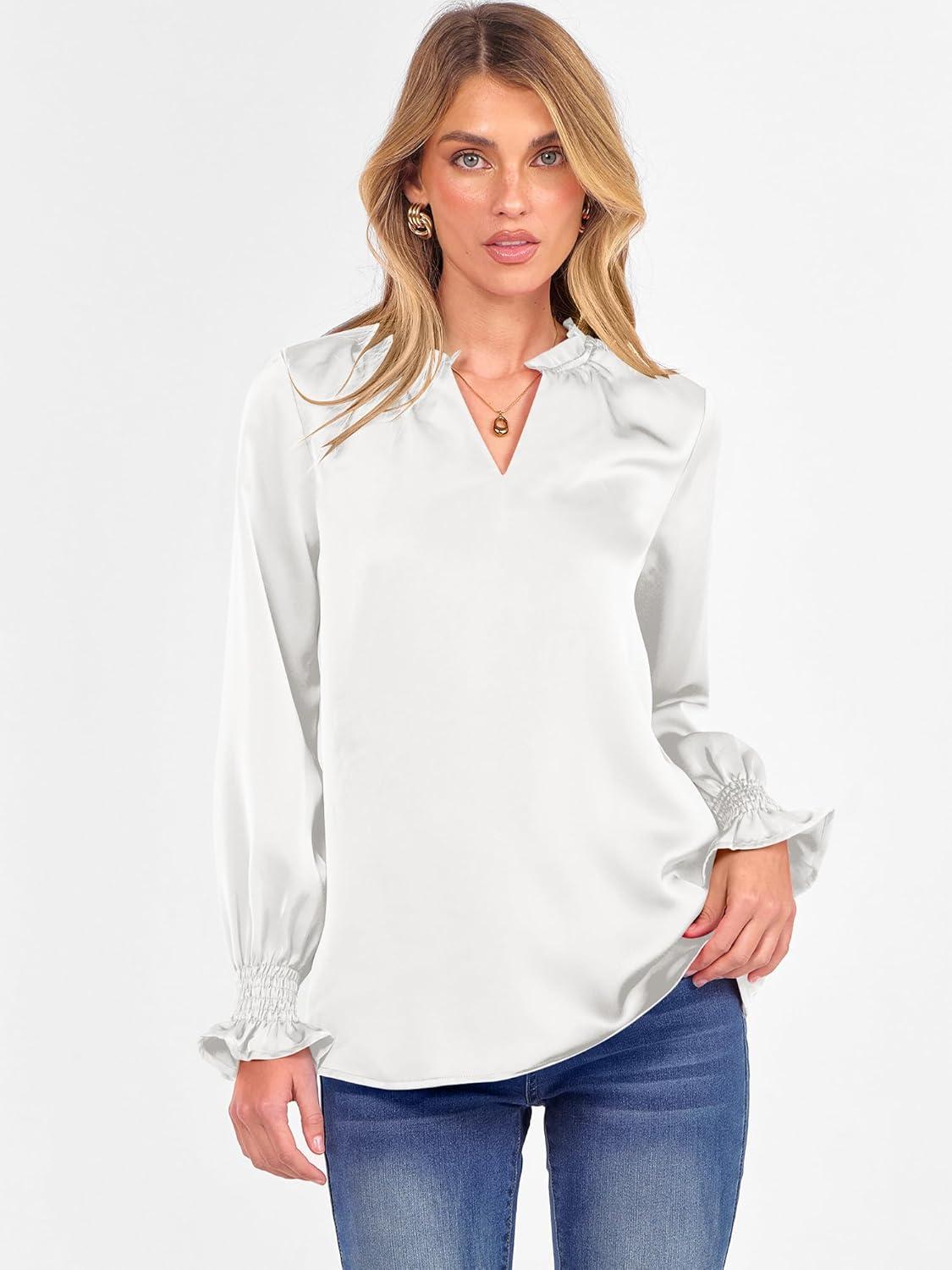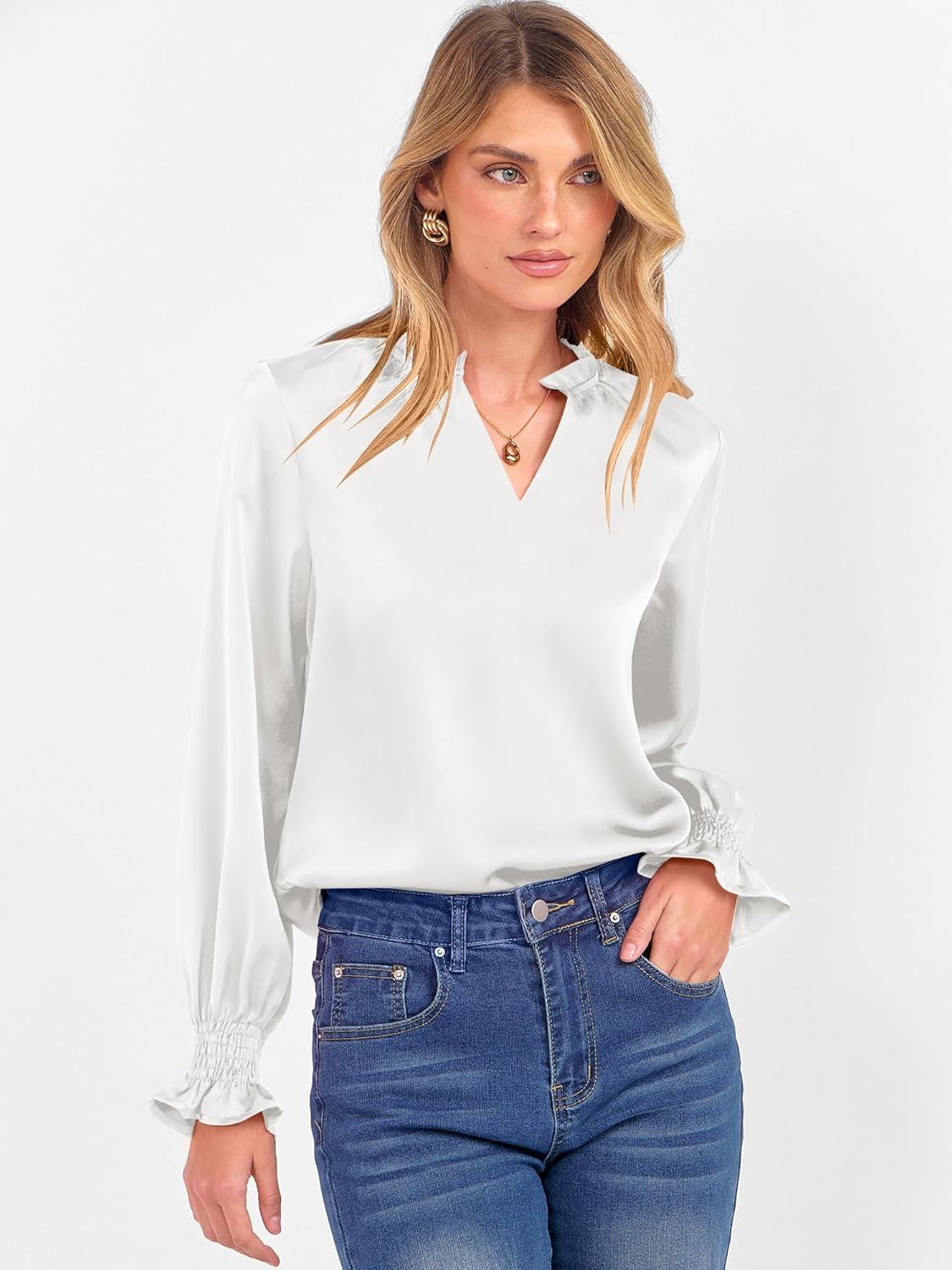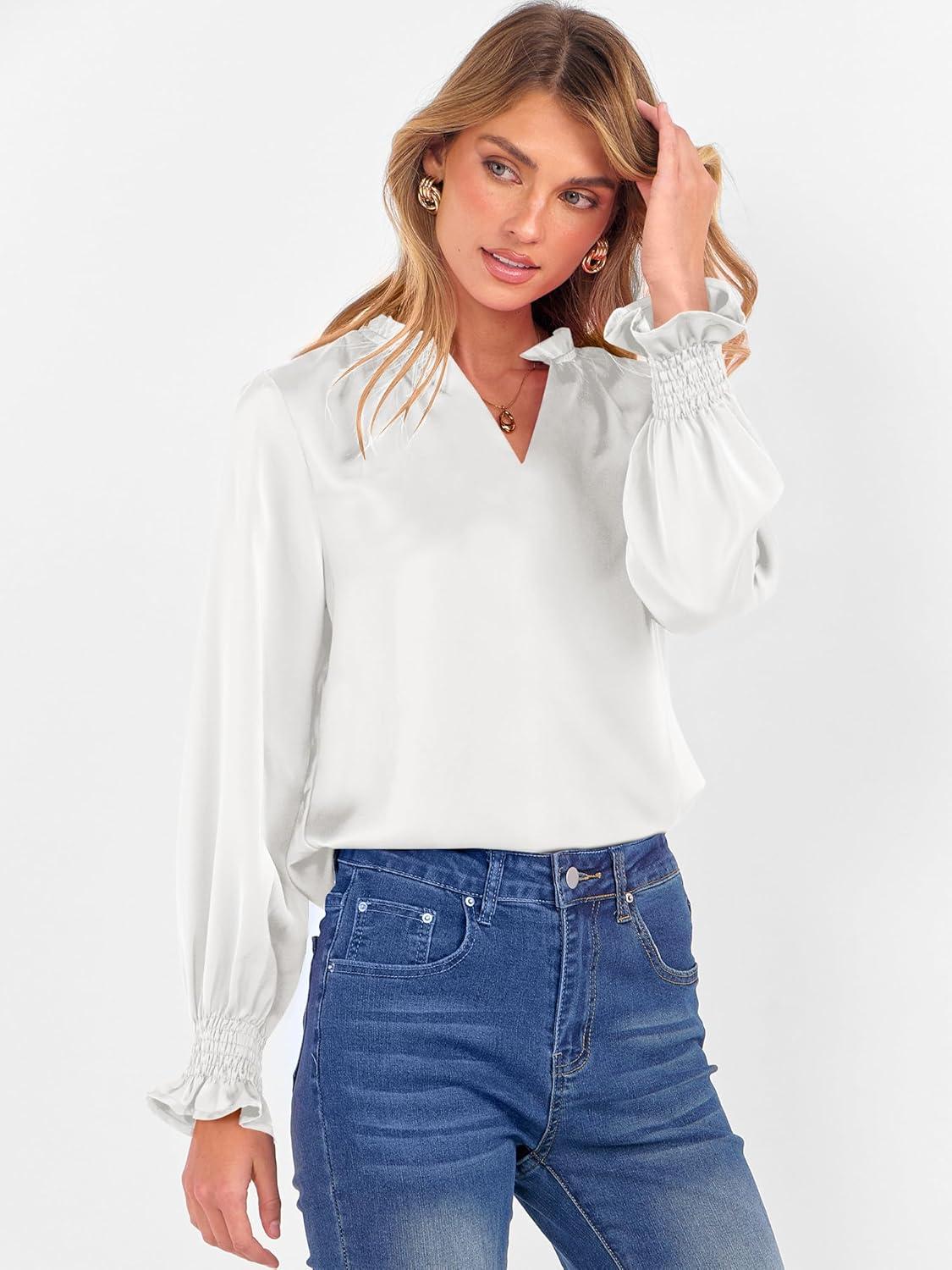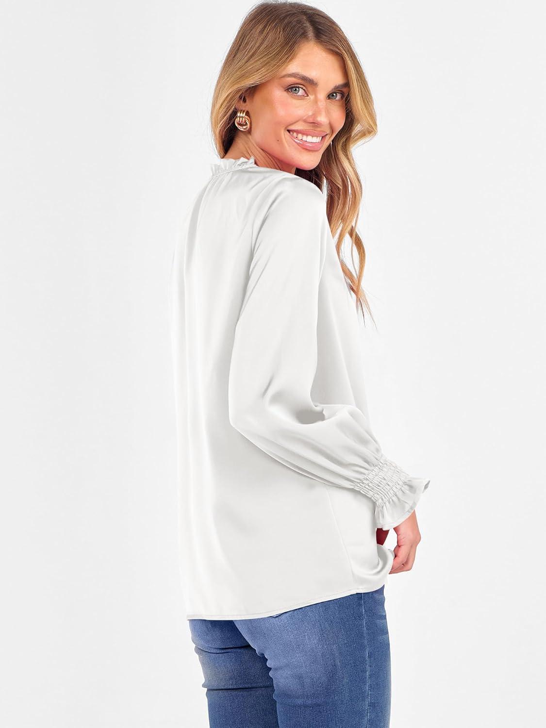 ANRABESS Blouse for Women Dressy Casual Puff Long Sleeve Shirts V Neck Satin Business Casual Work Tops 2025 Fall Outfits(White)