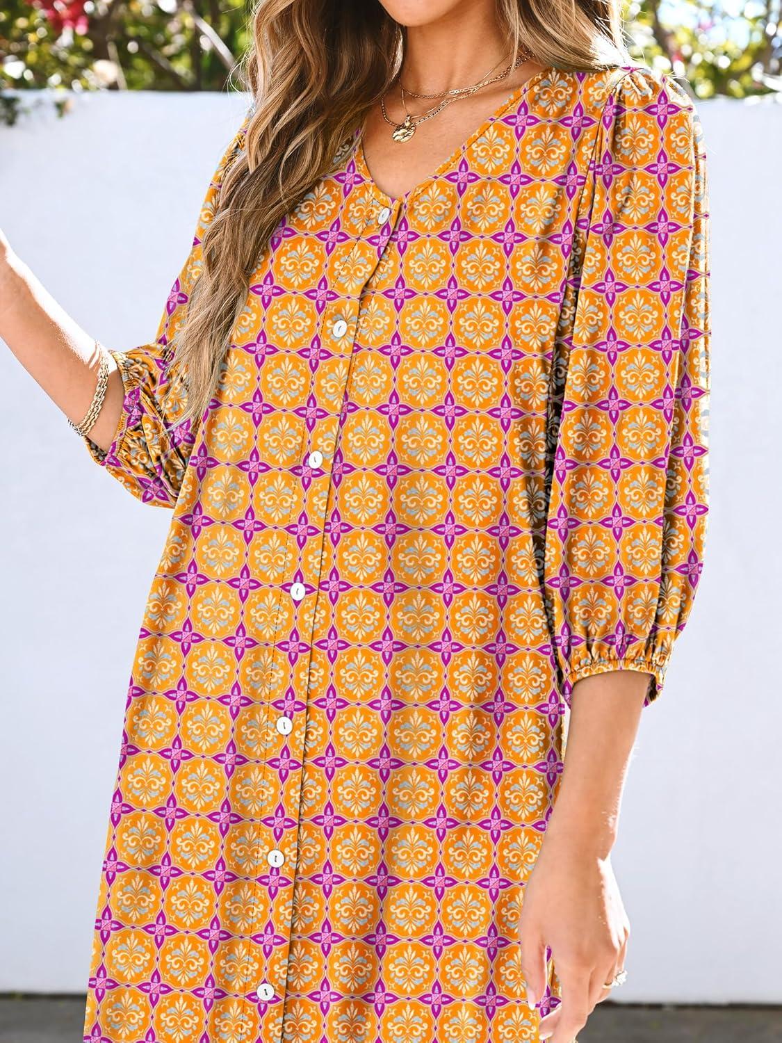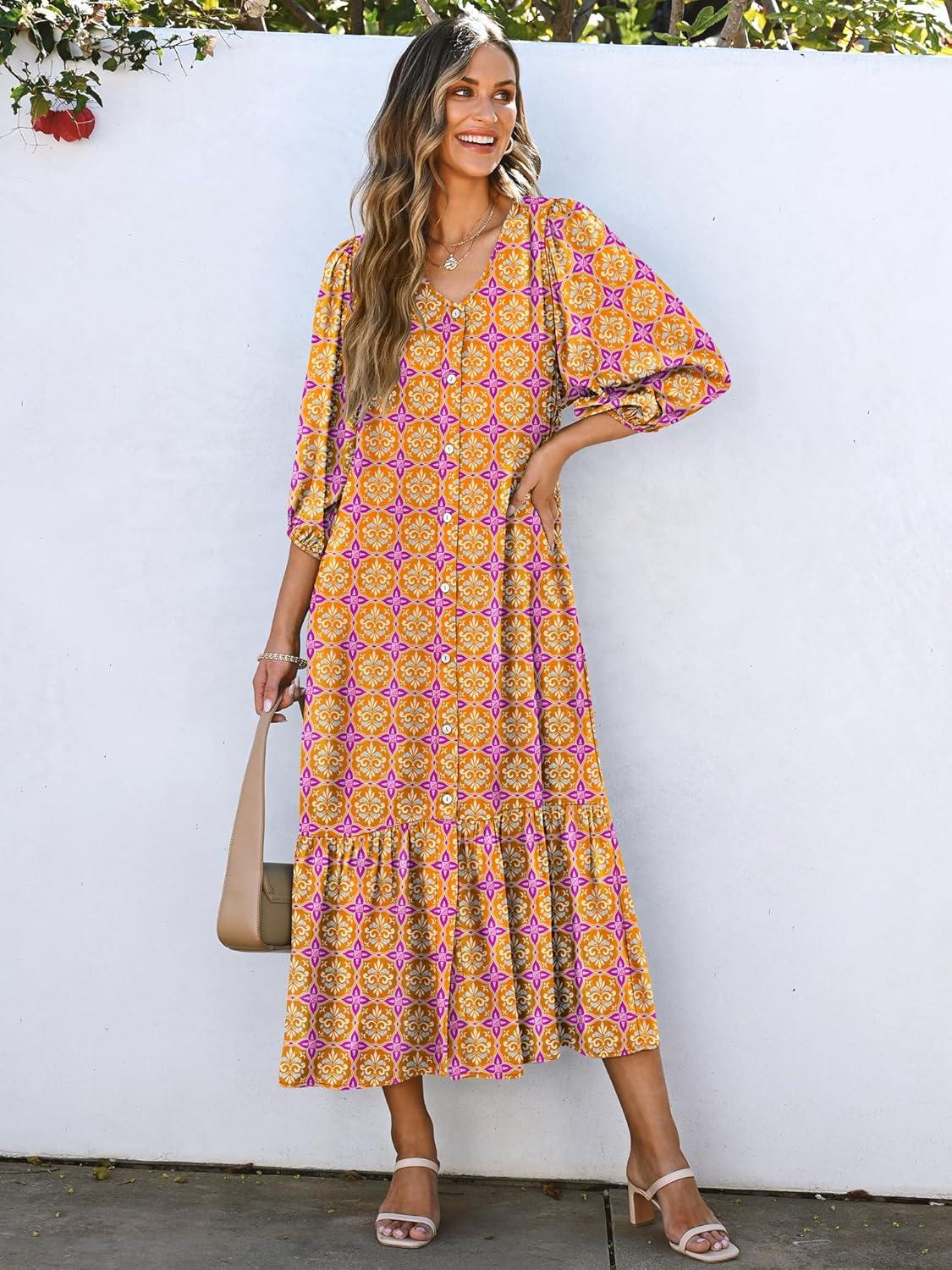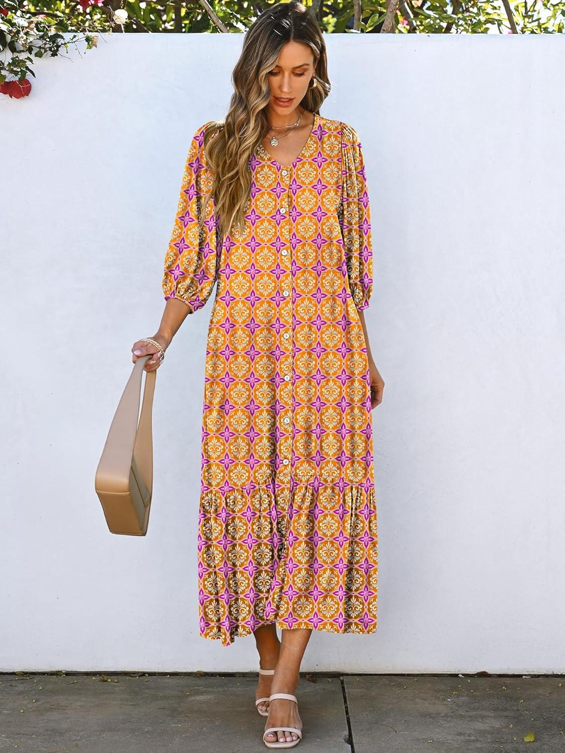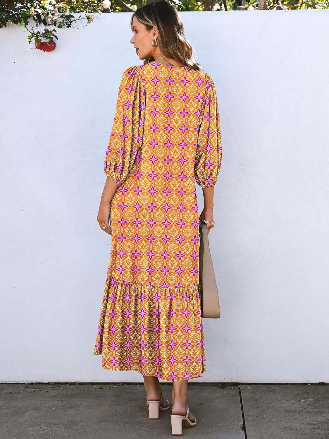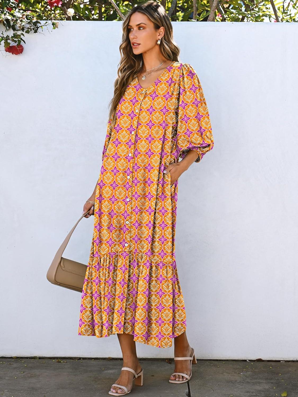 ANRABESS Boho Maxi Dresses for Women Summer Puff Sleeve V Neck Flowy Long Casual Dress with Pockets 2025 Vacation Outfits(Floral Purple Yellow)