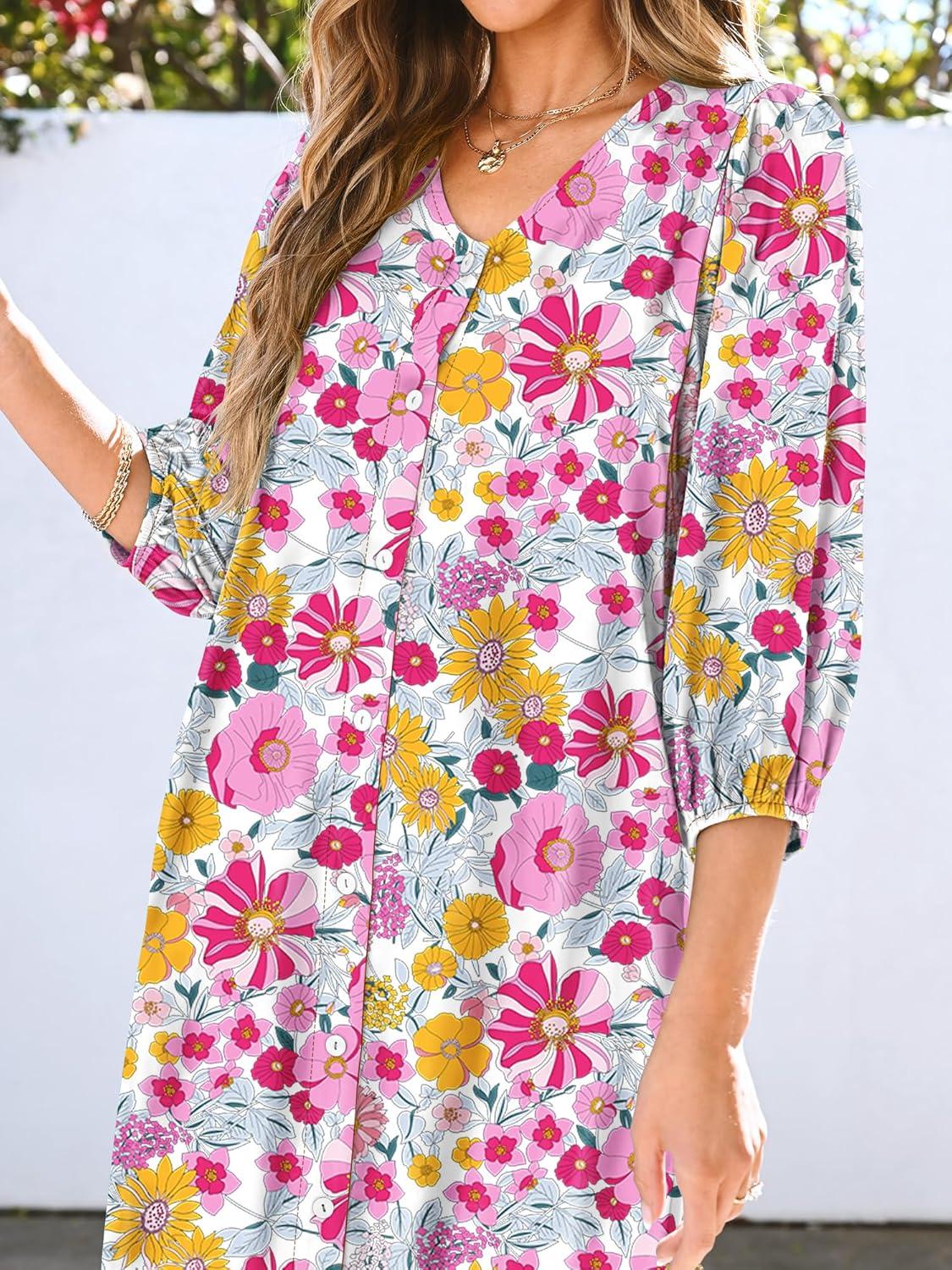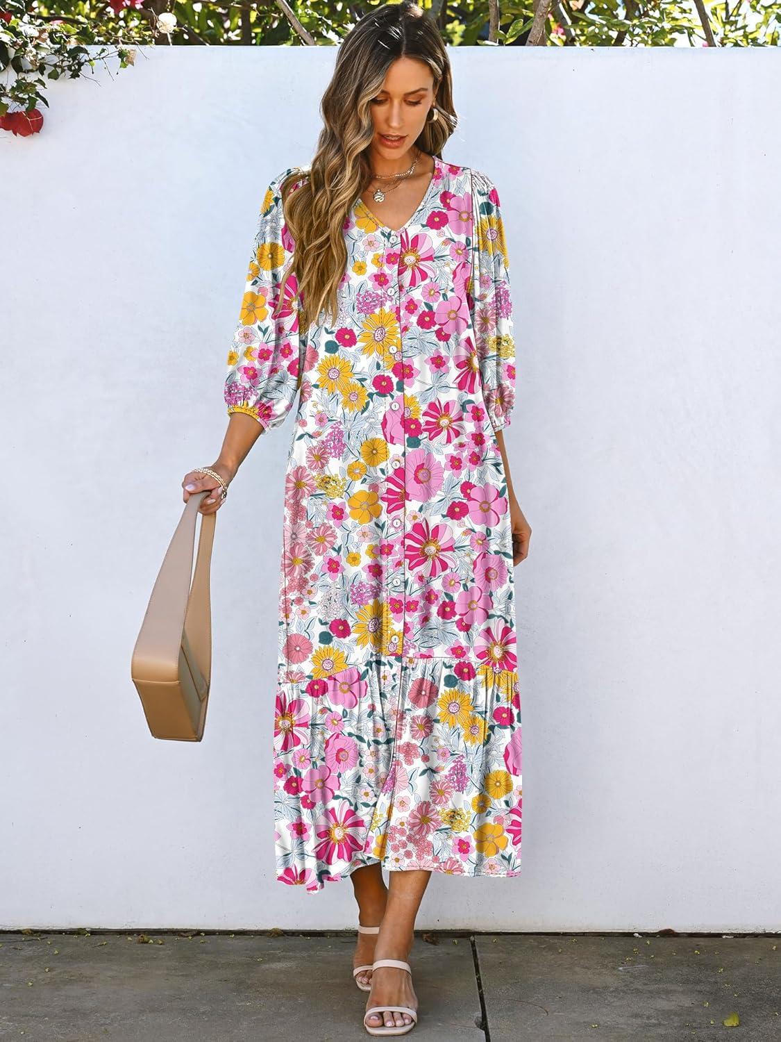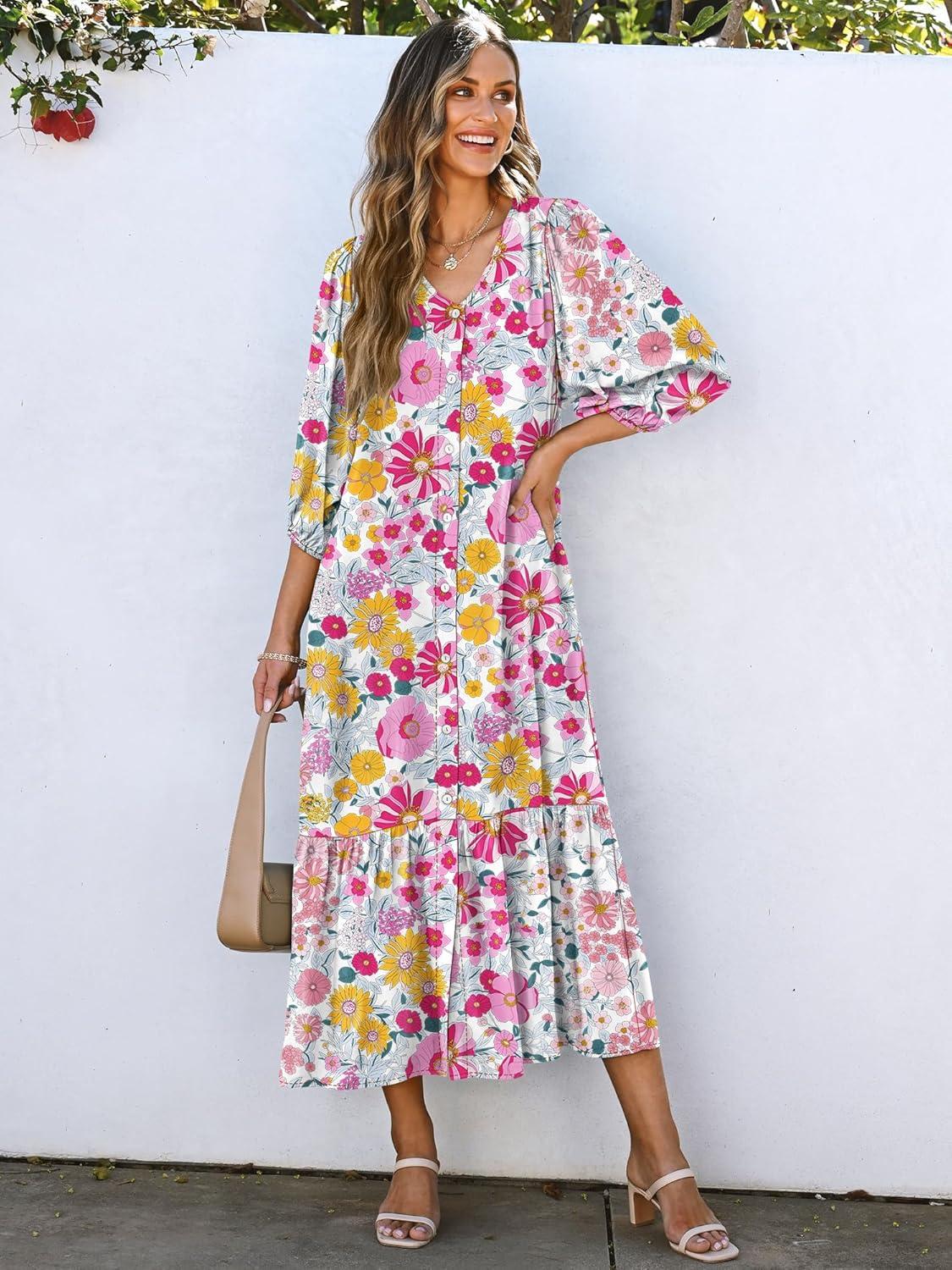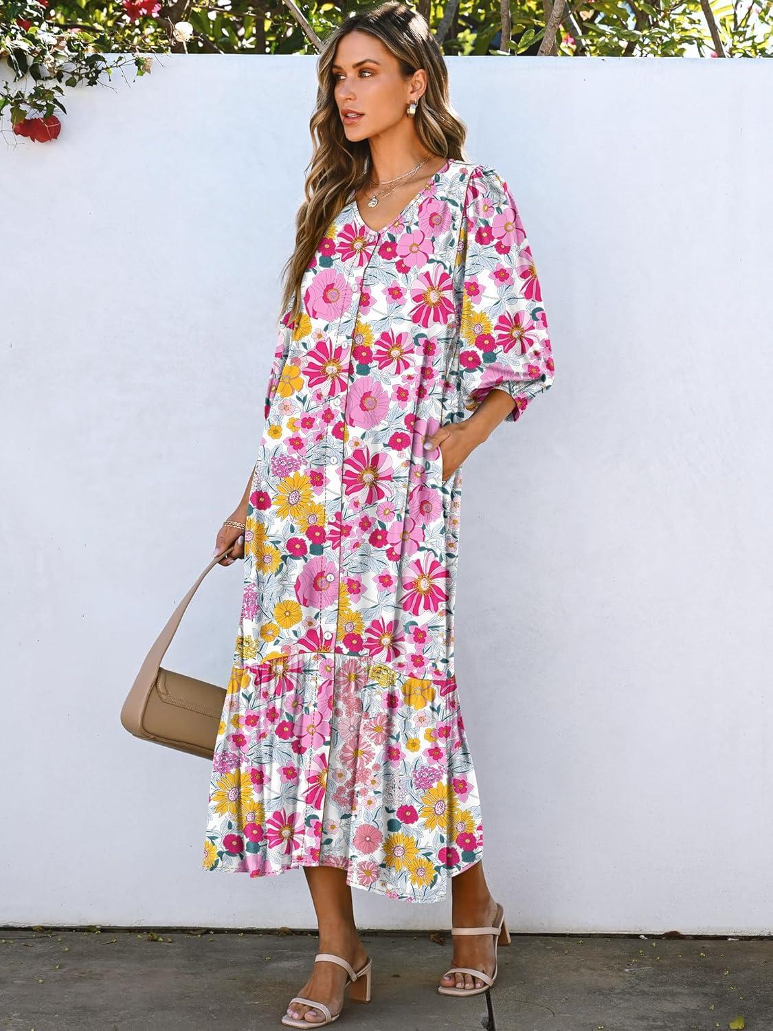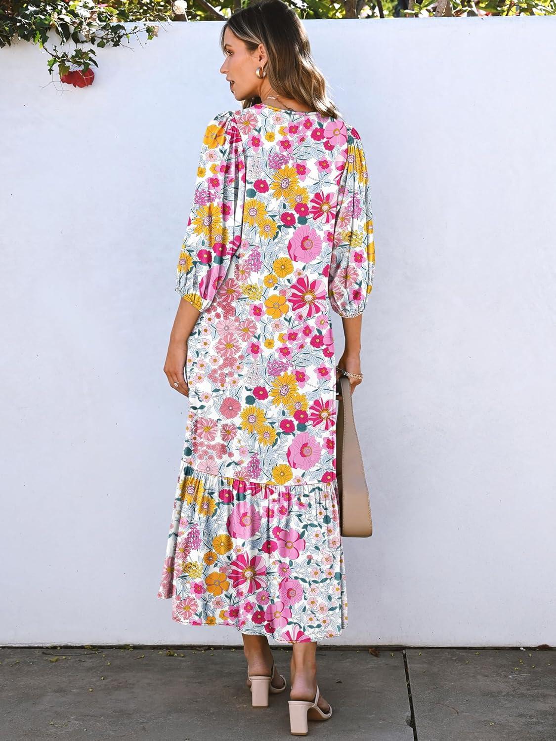 ANRABESS Boho Maxi Dresses for Women Summer Puff Sleeve V Neck Flowy Long Casual Dress with Pockets 2025 Vacation Outfits(Floral Yellow Pink)
