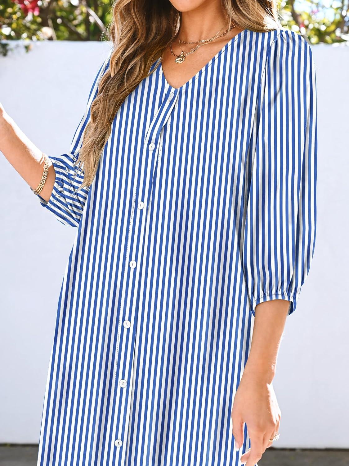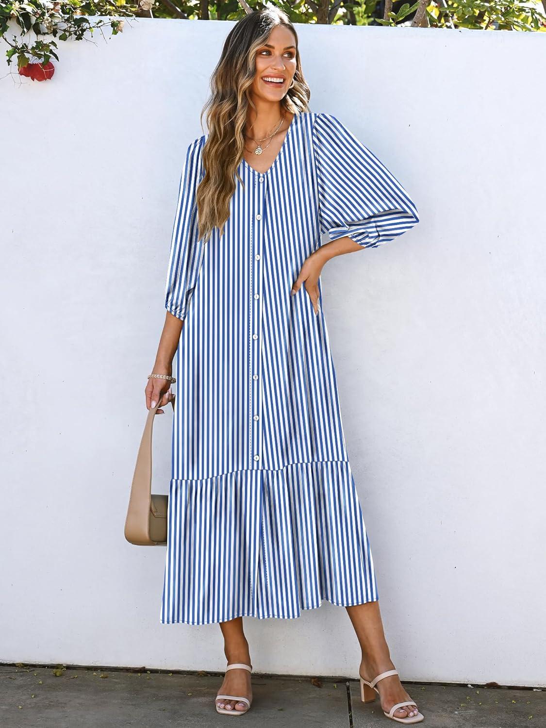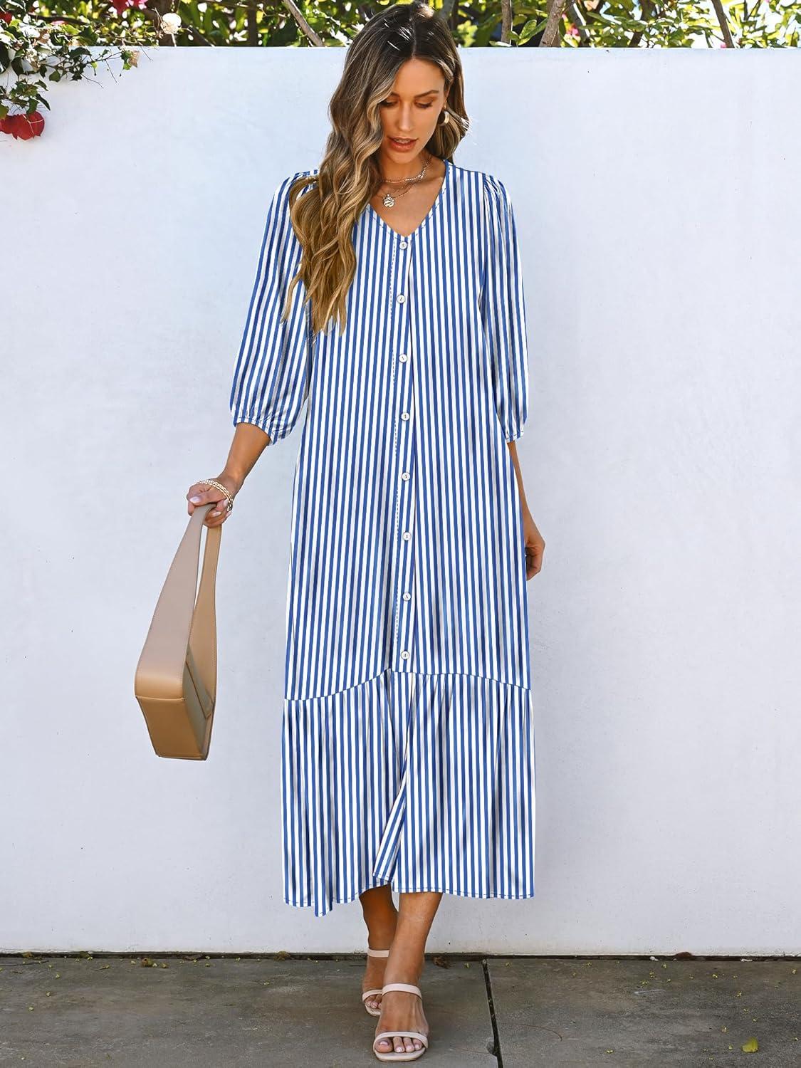 ANRABESS Boho Maxi Dresses for Women Summer Puff Sleeve V Neck Flowy Long Casual Dress with Pockets 2025 Vacation Outfits(Striped Blue)