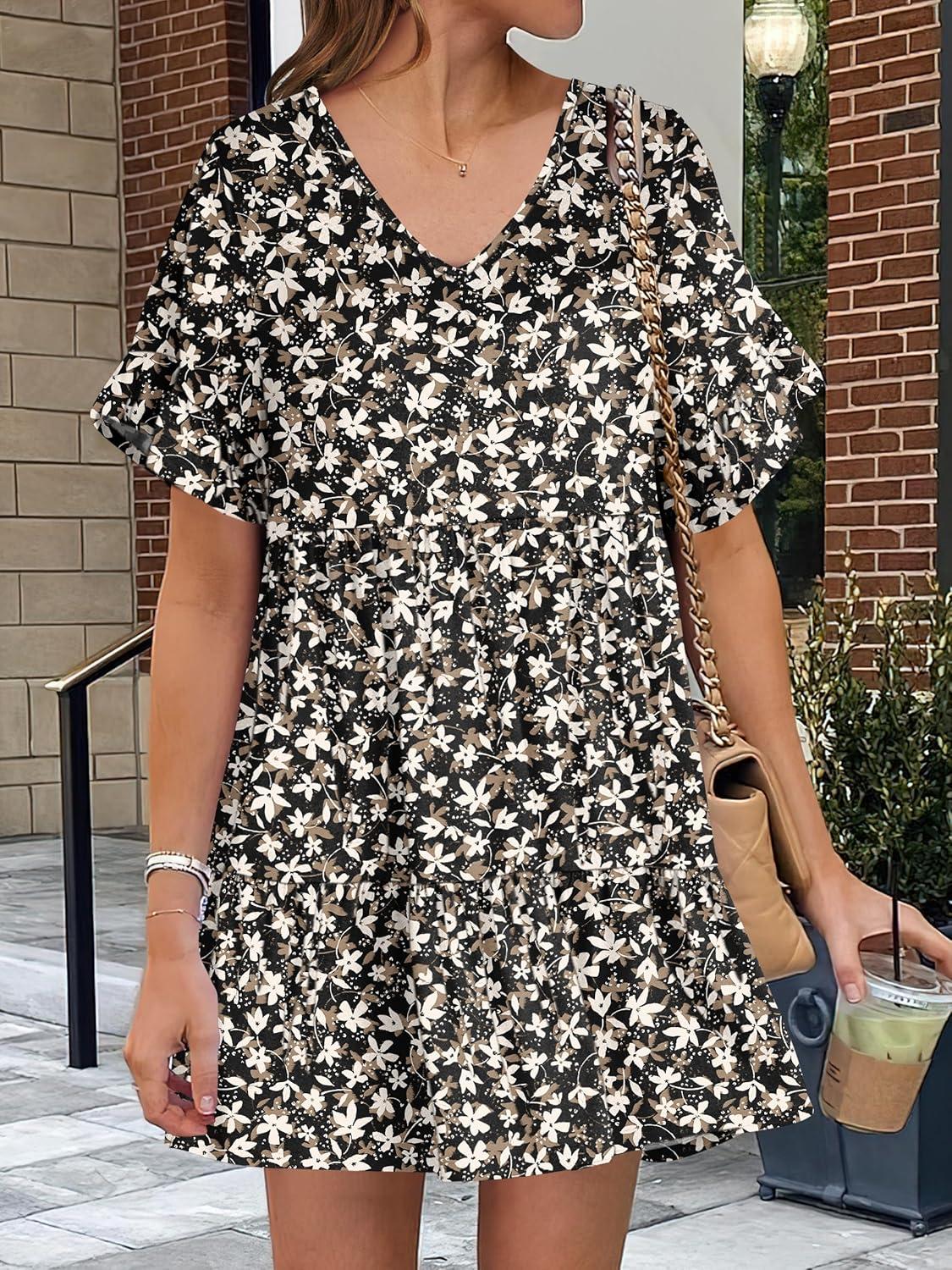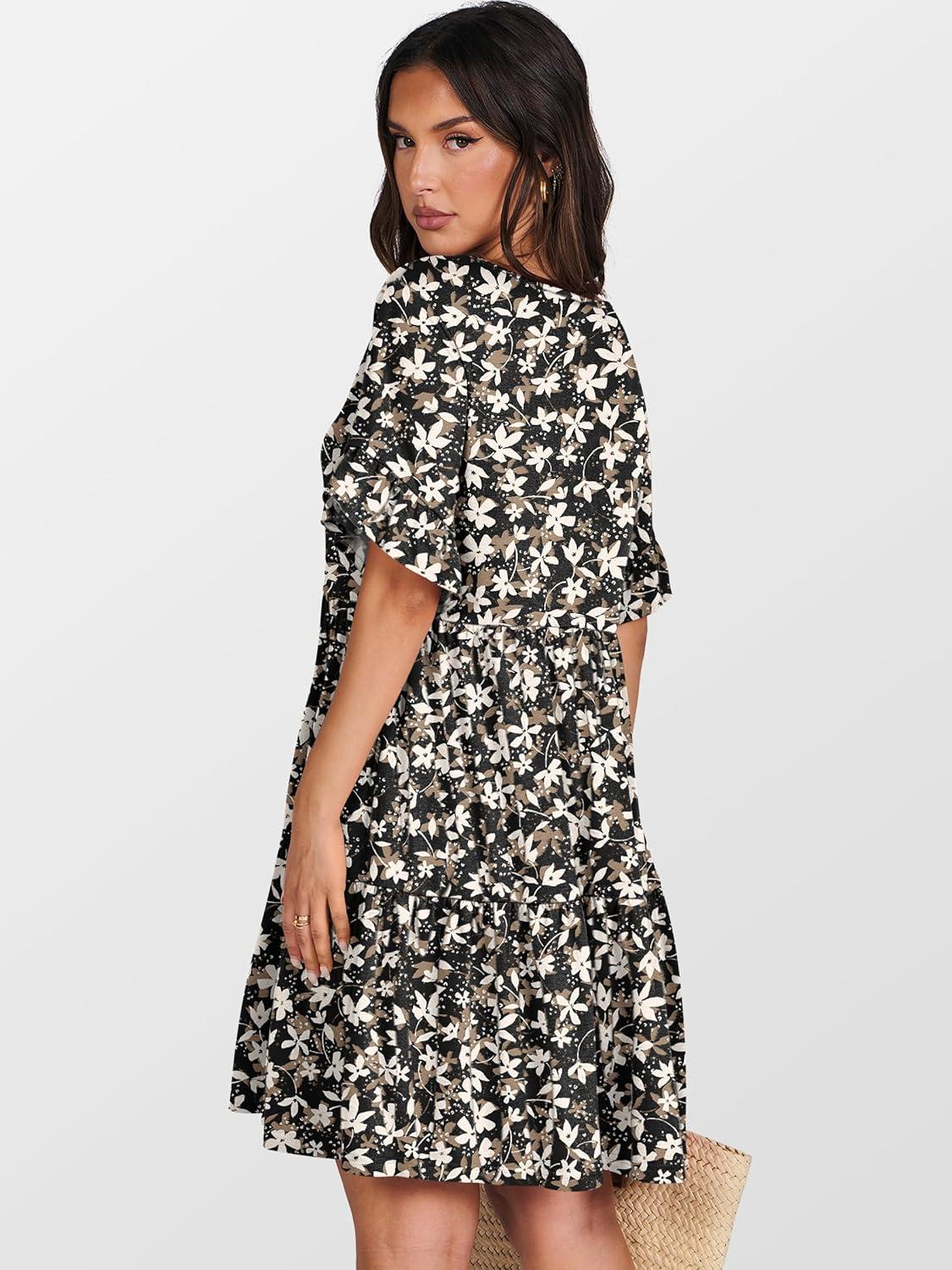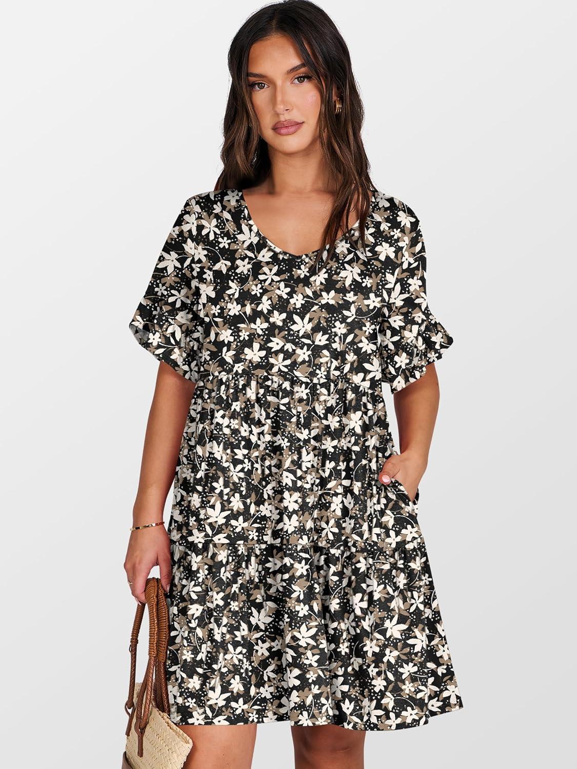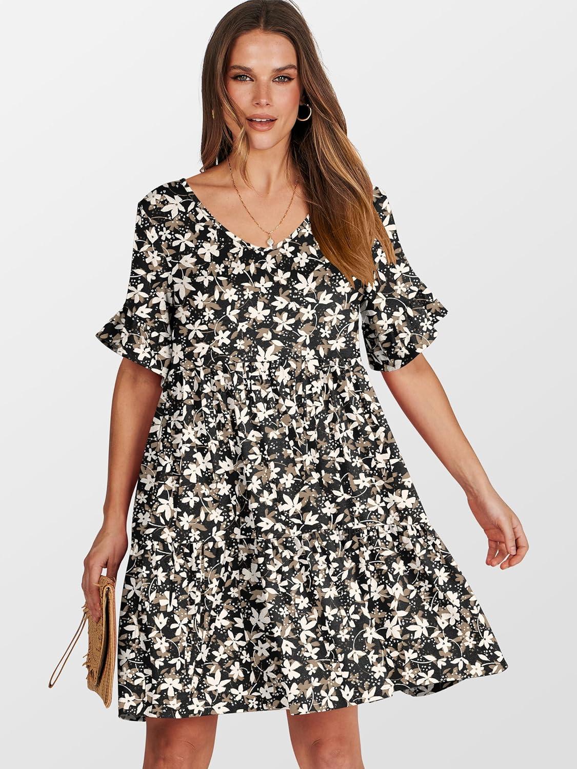 ANRABESS Dresses for Women Summer 2025 V Neck Ruffle Sleeve A Line Tiered Flowy Casual Trendy Mini Beach Dress with Pockets(Black White Floral)