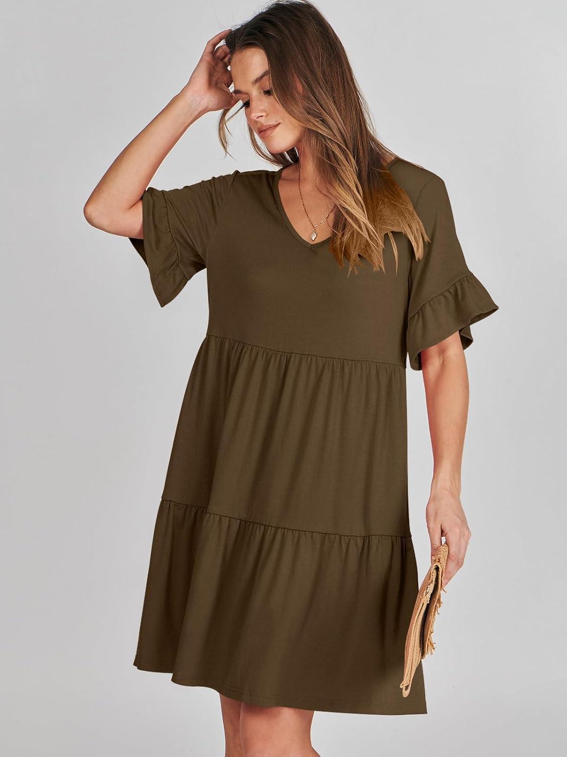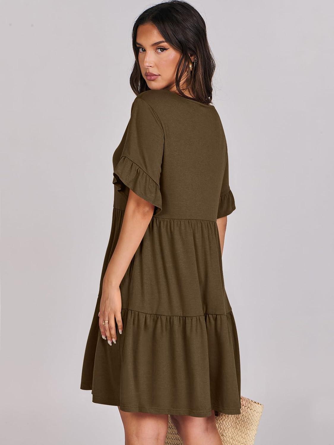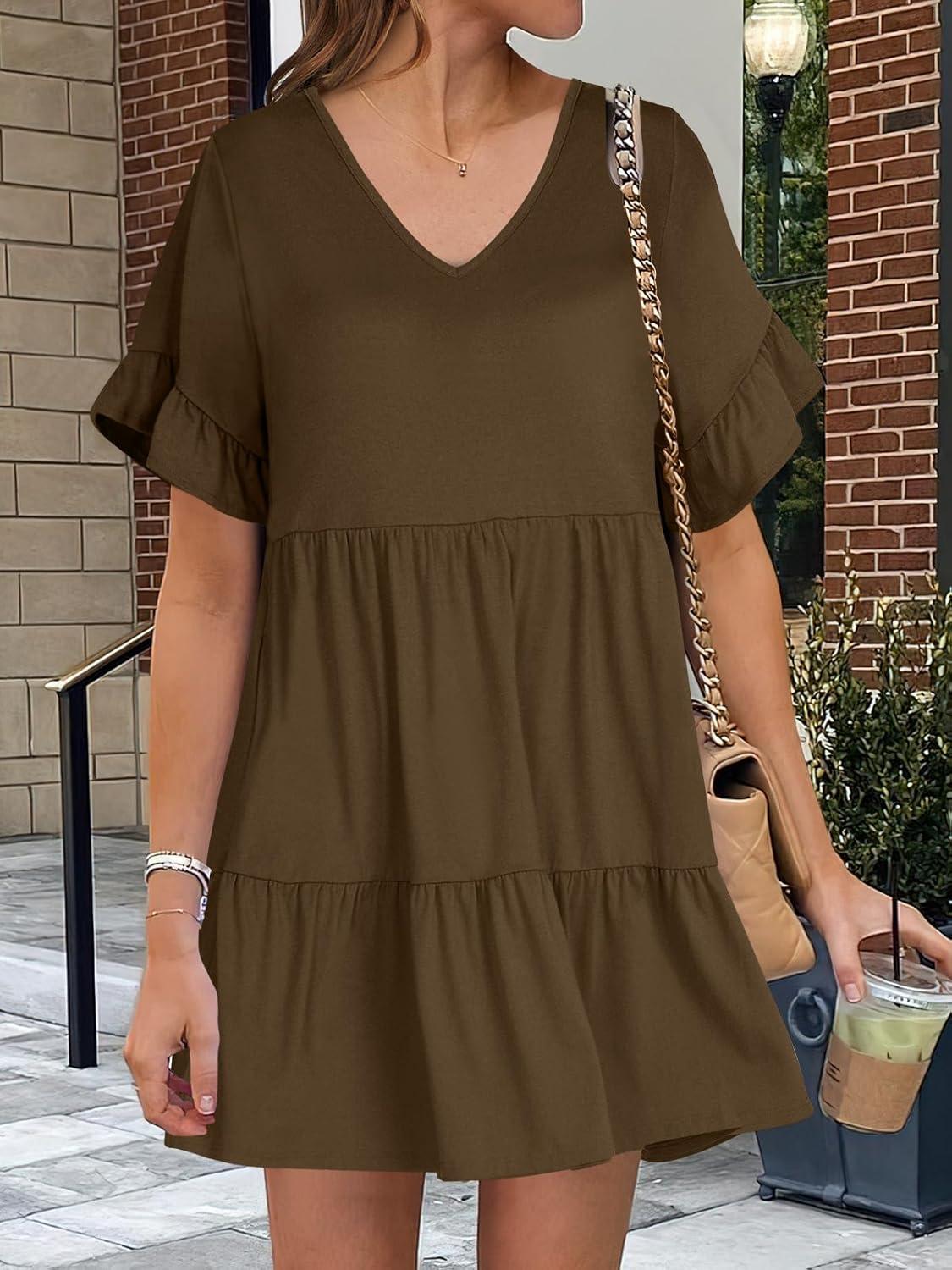 ANRABESS Dresses for Women Summer 2025 V Neck Ruffle Sleeve A Line Tiered Flowy Casual Trendy Mini Beach Dress with Pockets(Coffee)