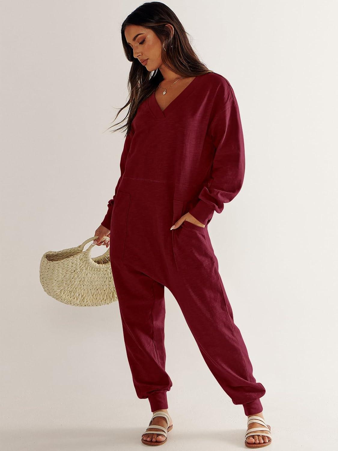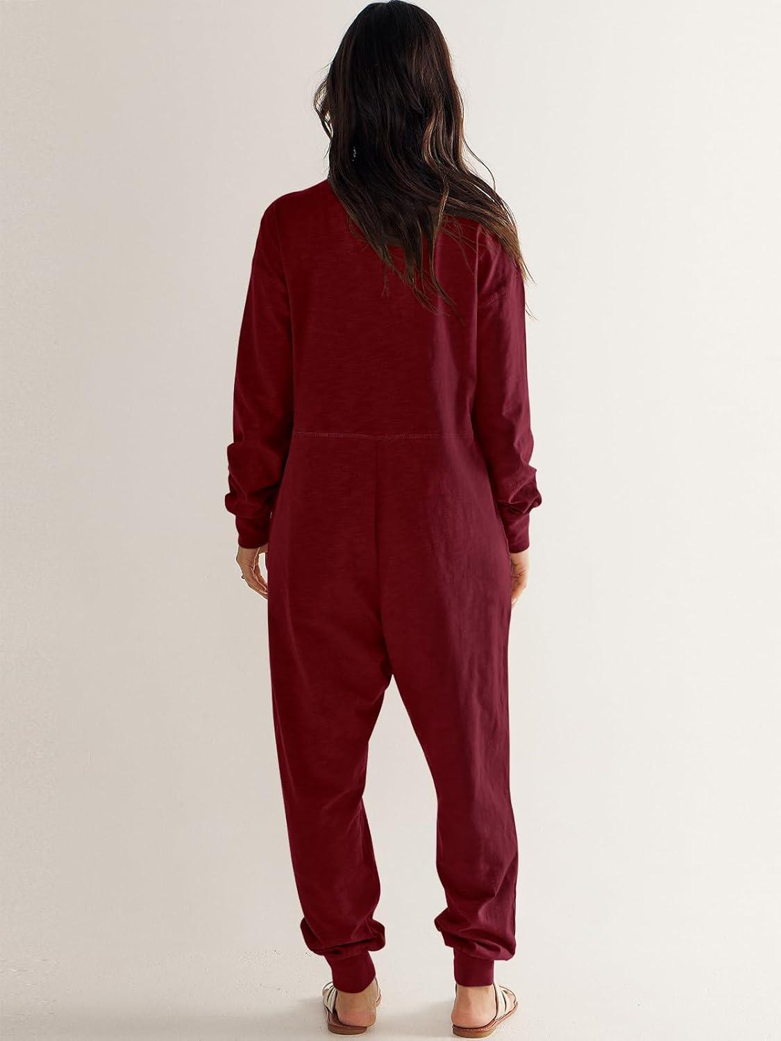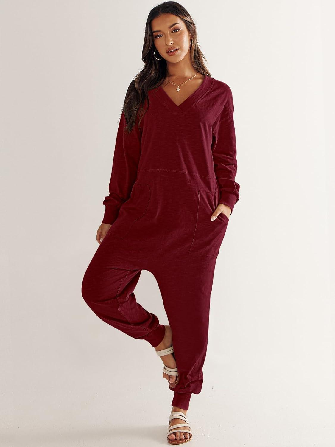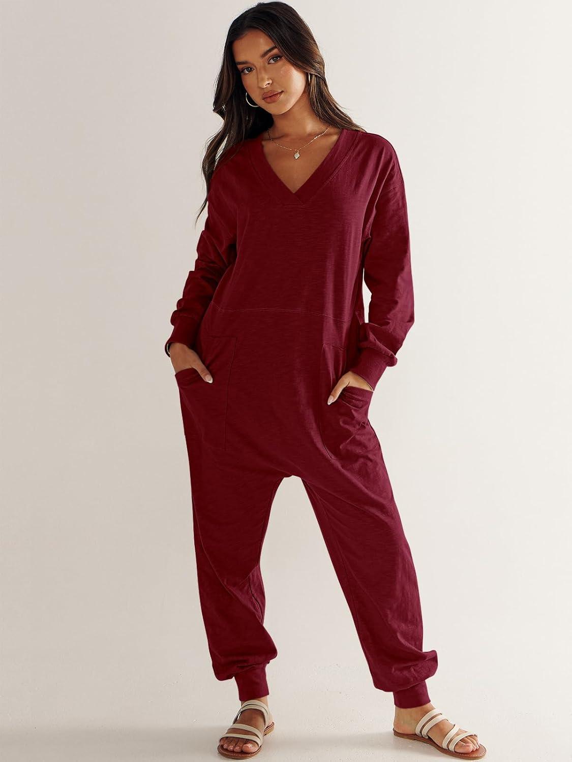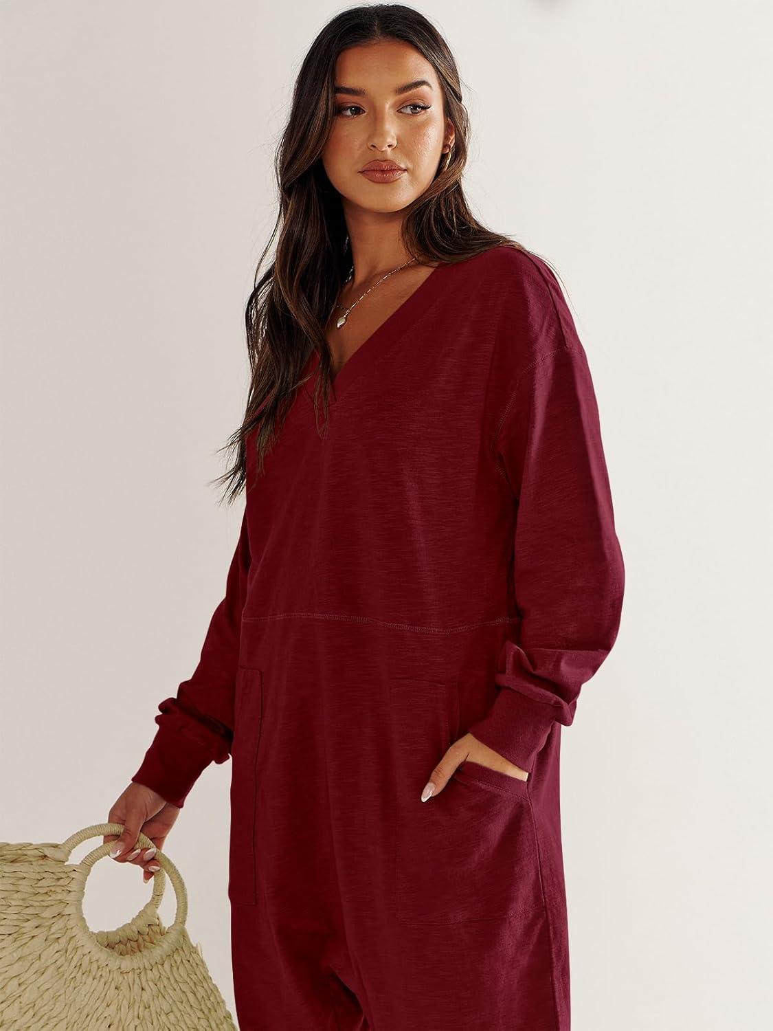 ANRABESS Jumpsuits for Women 2025 Fall Long Sleeve Casual Loose Fit Romper Lounge One Piece Pajamas Outfits Jumper(Burgundy)