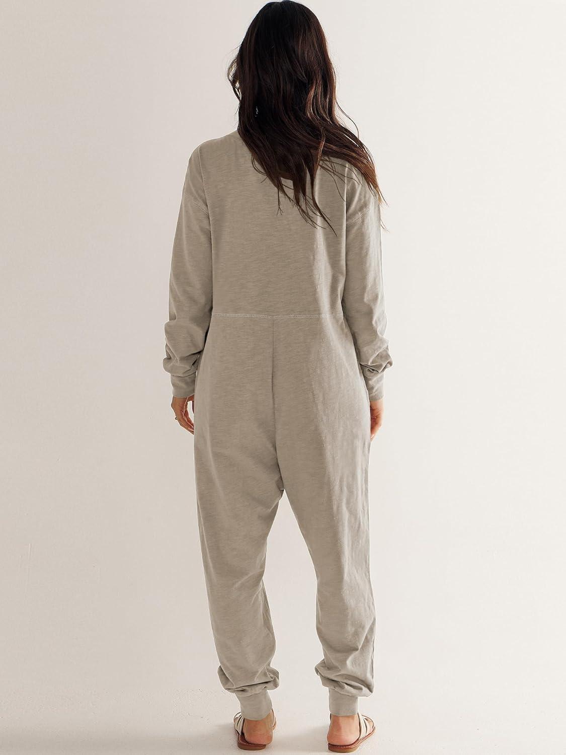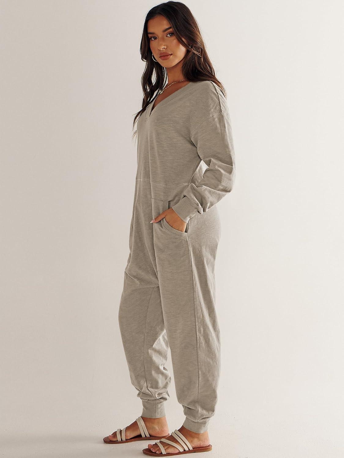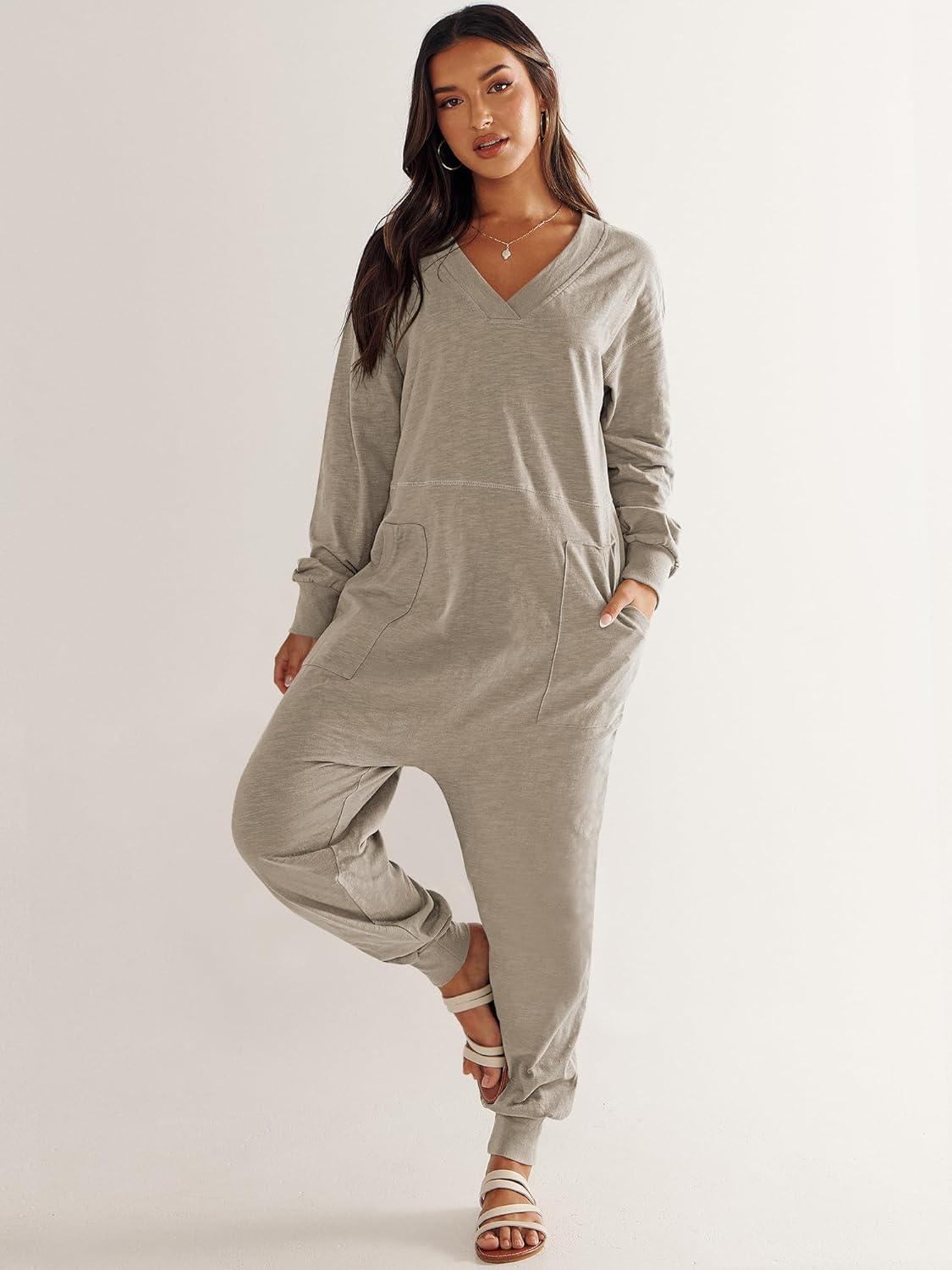 ANRABESS Jumpsuits for Women 2025 Fall Long Sleeve Casual Loose Fit Romper Lounge One Piece Pajamas Outfits Jumper(Grey Beige)