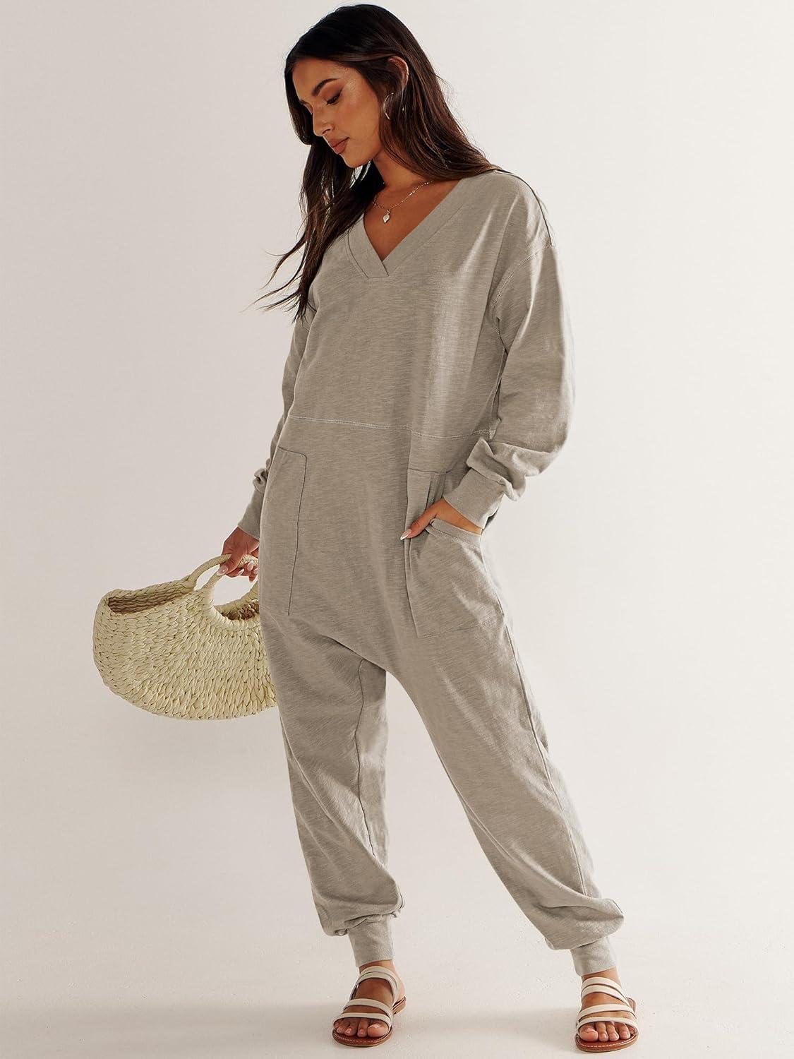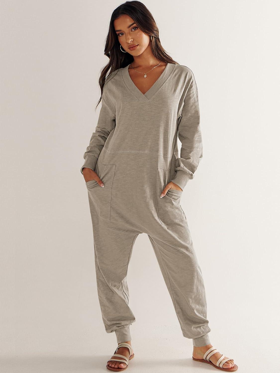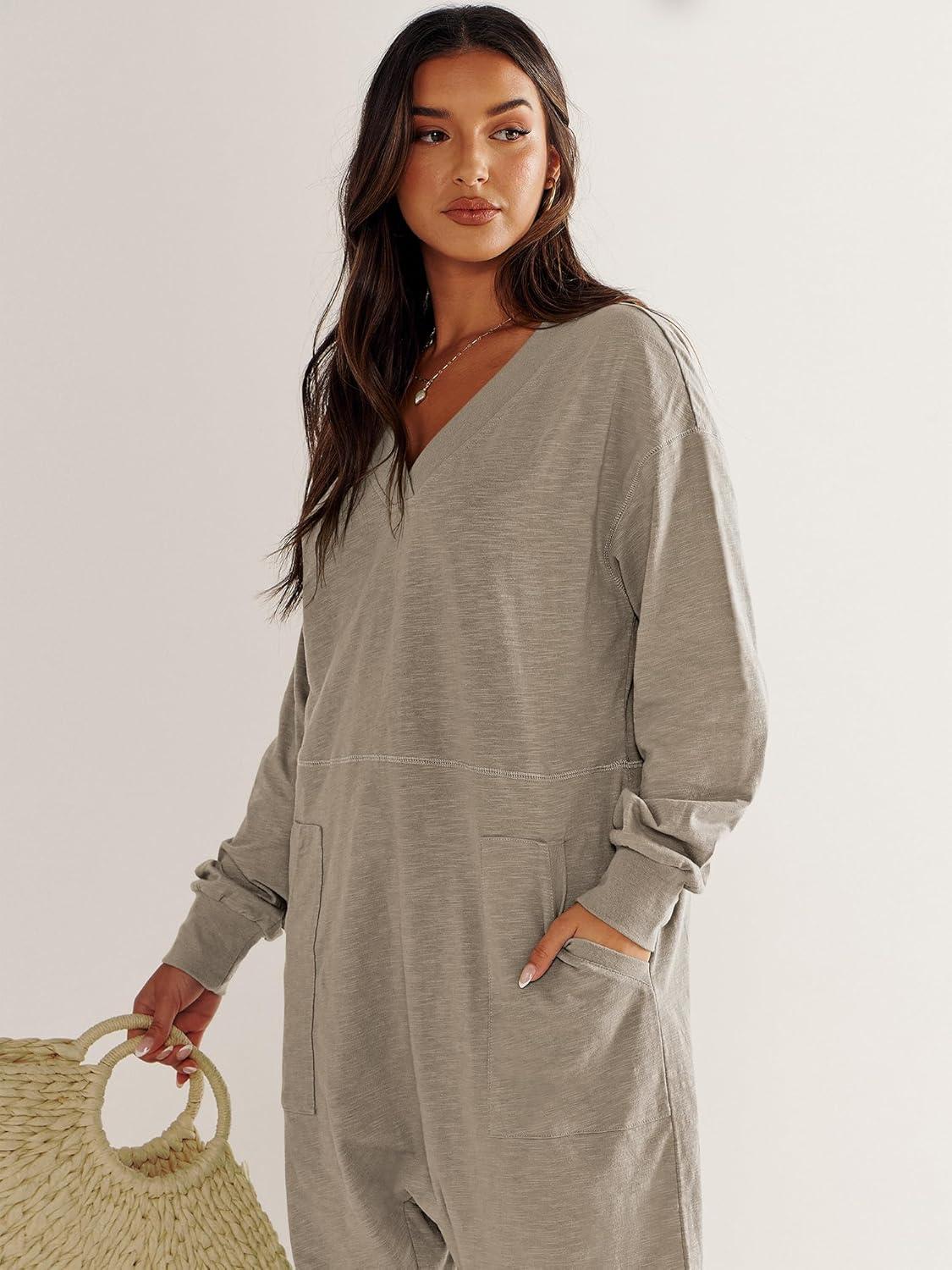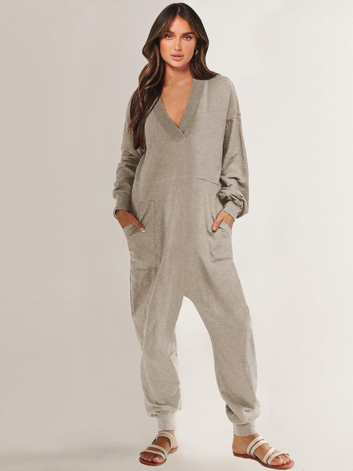 ANRABESS Jumpsuits for Women 2025 Fall Long Sleeve Casual Loose Fit Romper Lounge One Piece Pajamas Outfits Jumper(Grey Beige)
