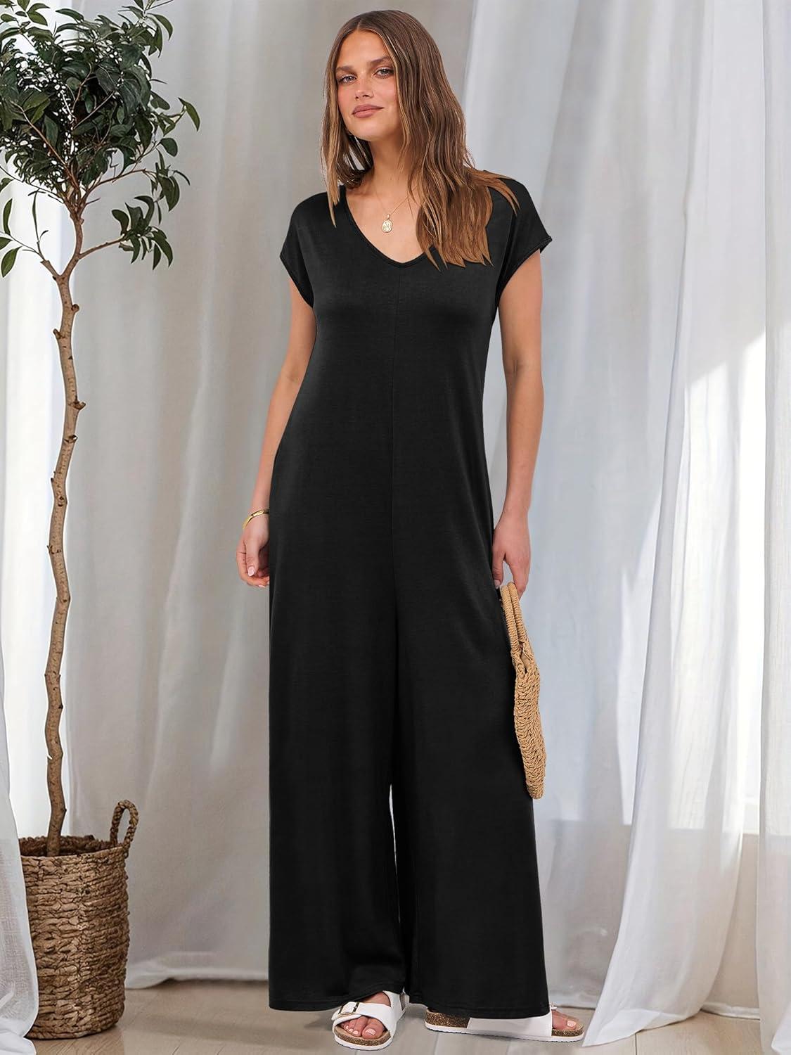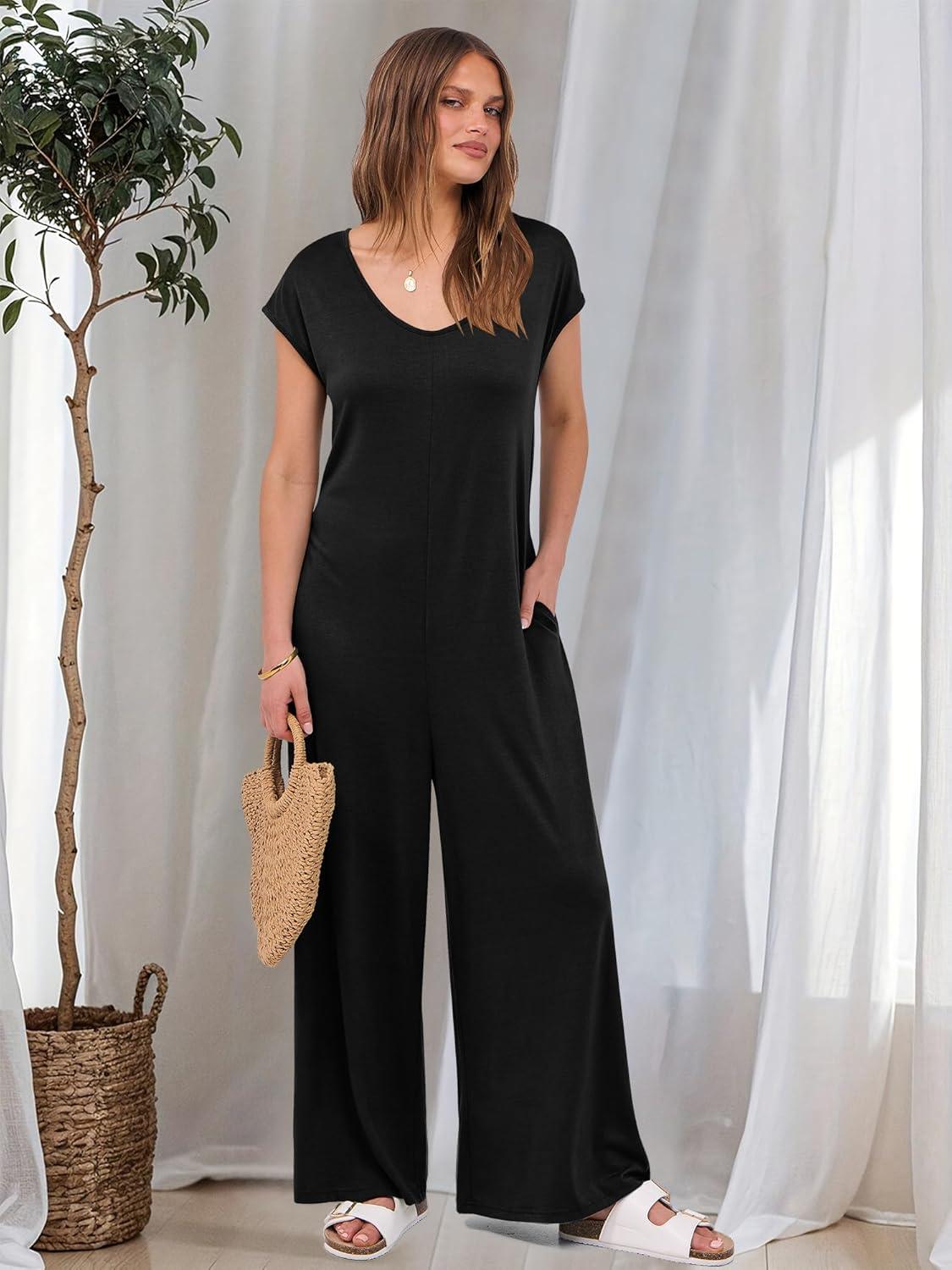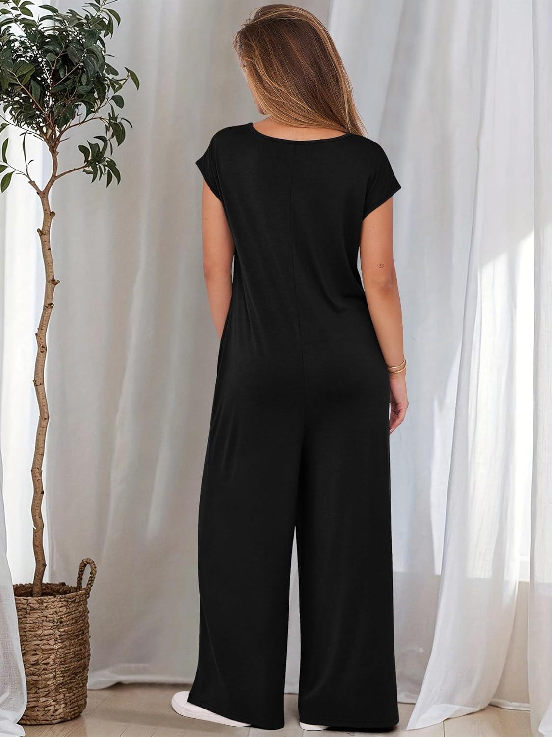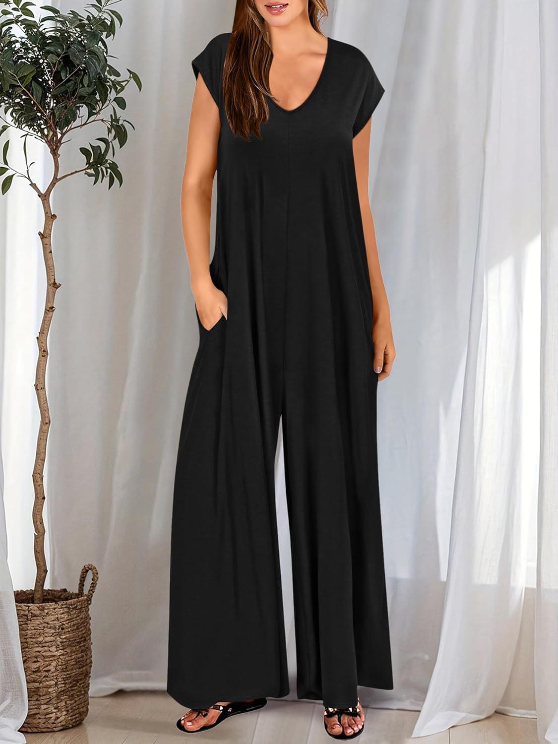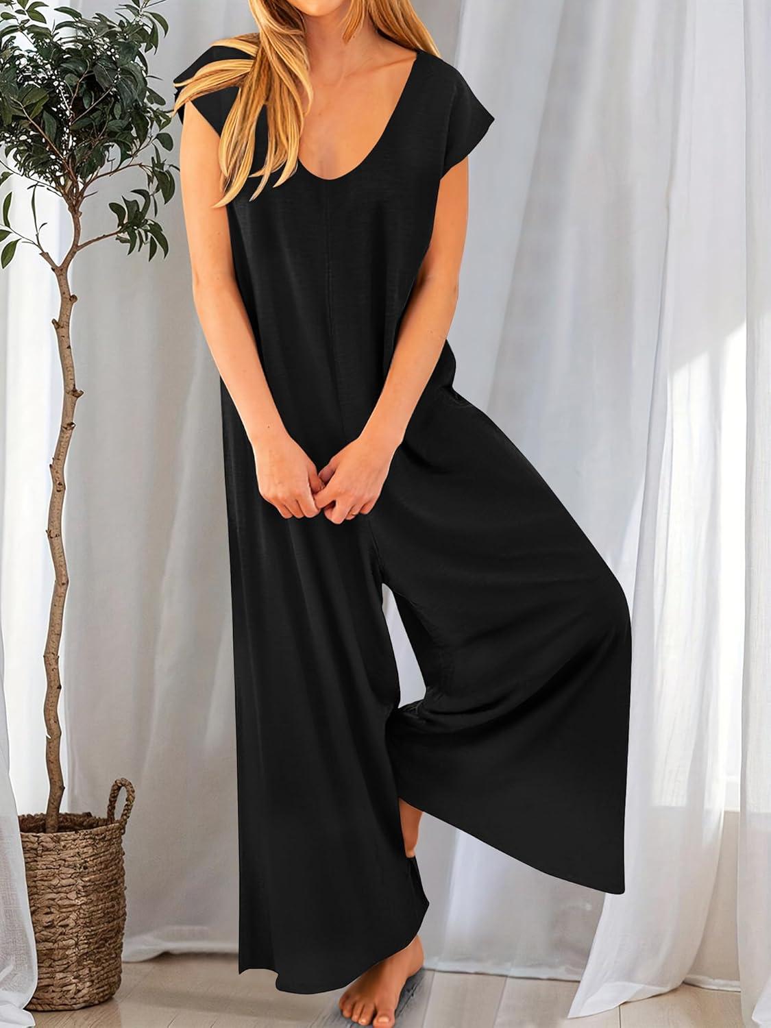 ANRABESS Jumpsuits for Women 2025 Summer Casual Loose Cap Sleeve Crewneck Wide Leg Rompers Jumper One Piece Beach Outfits(Black)
