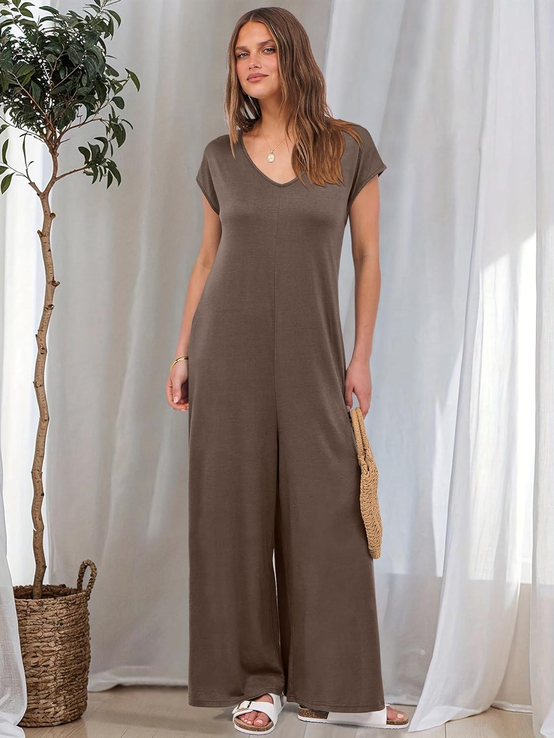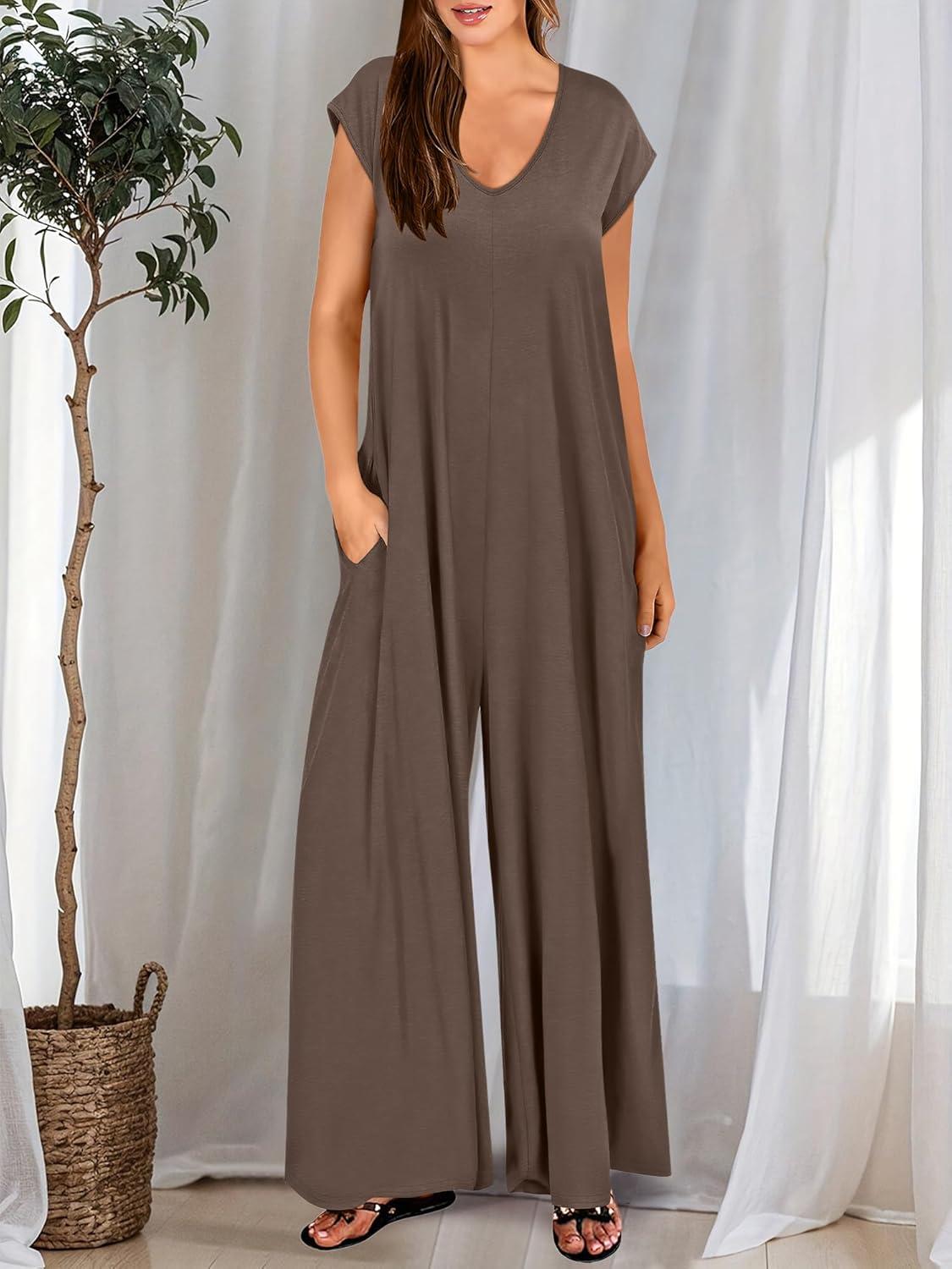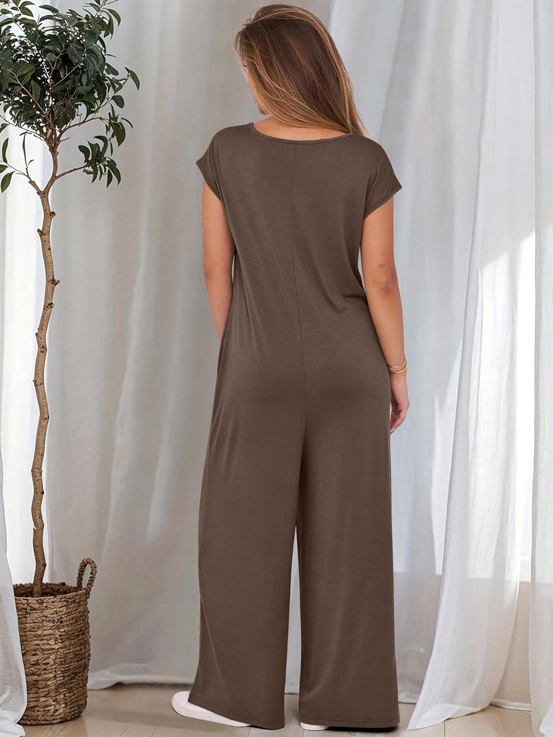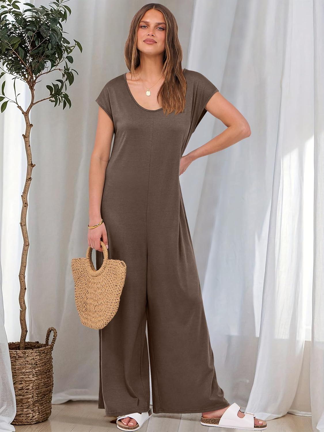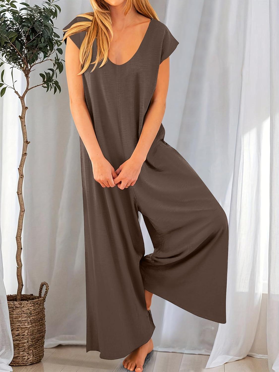 ANRABESS Jumpsuits for Women 2025 Summer Casual Loose Cap Sleeve Crewneck Wide Leg Rompers Jumper One Piece Beach Outfits(Brown)