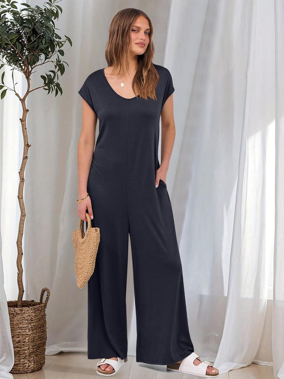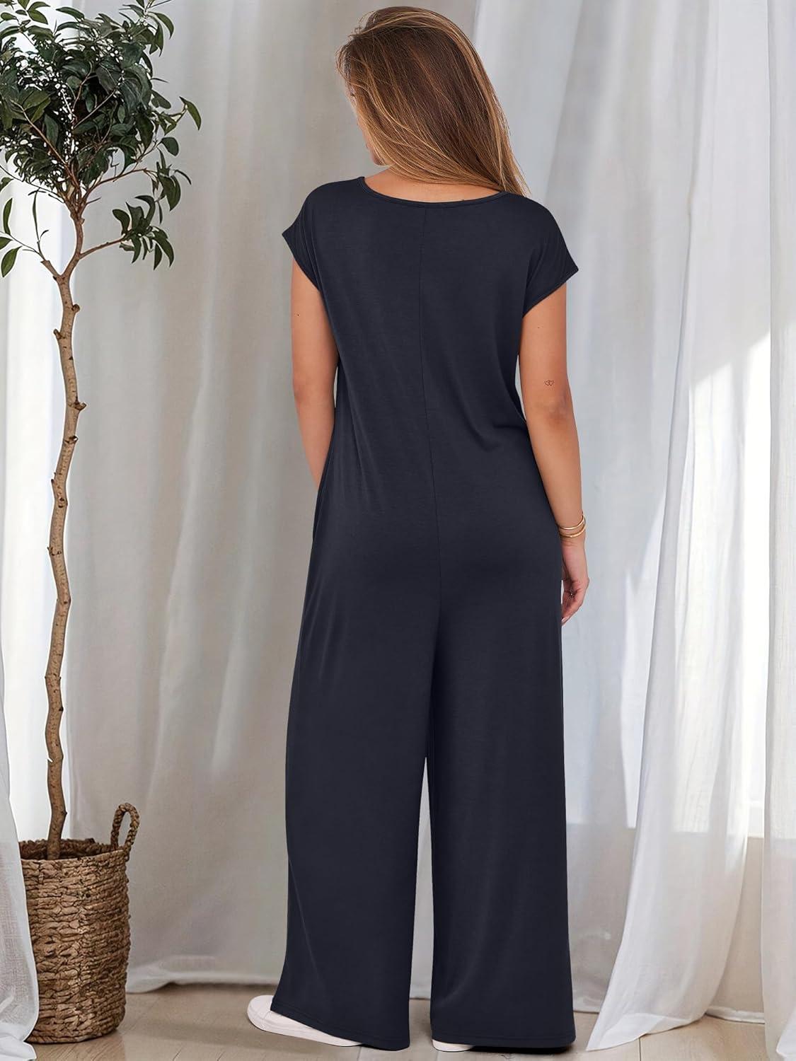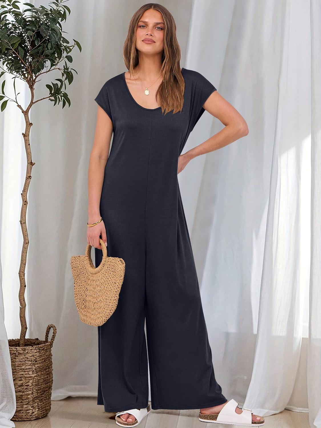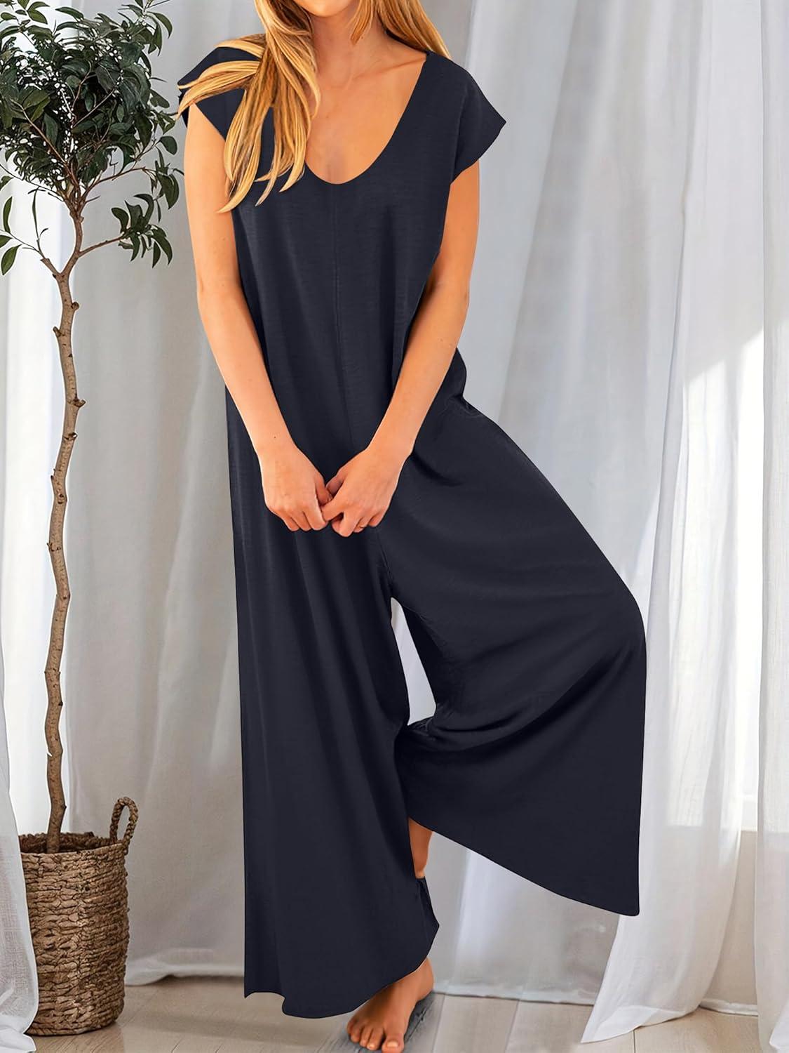 ANRABESS Jumpsuits for Women 2025 Summer Casual Loose Cap Sleeve Crewneck Wide Leg Rompers Jumper One Piece Beach Outfits(Navy Blue)