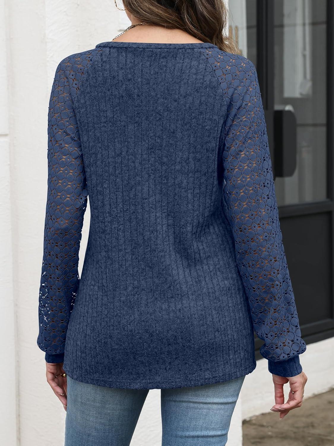 ANRABESS Lace Long Sleeve Tops for Women 2025 Fall Business Casual V Neck Shirts Work Office Trendy Blouses Fashion Outfits(Dark Blue)