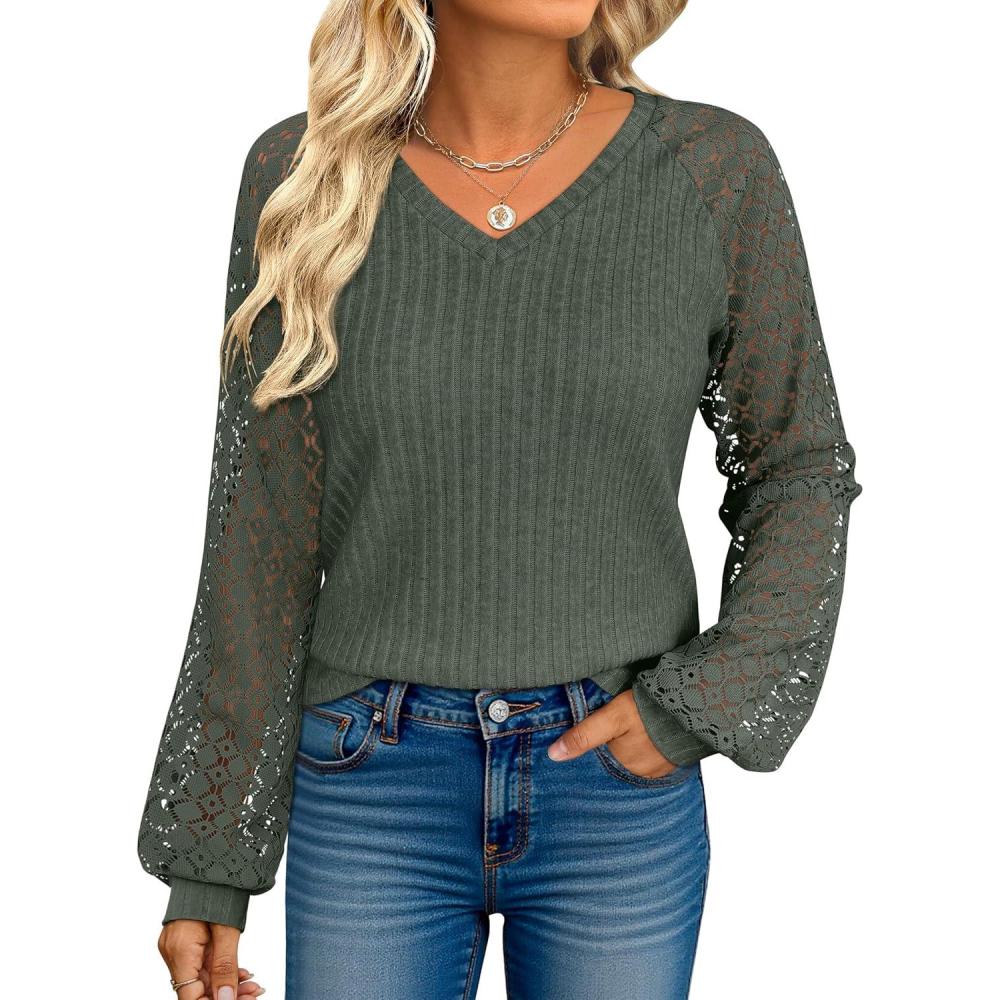ANRABESS Lace Long Sleeve Tops for Women 2025 Fall Business Casual V Neck Shirts Work Office Trendy Blouses Fashion Outfits(Deep Green)