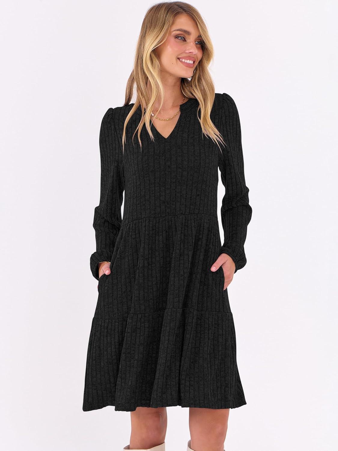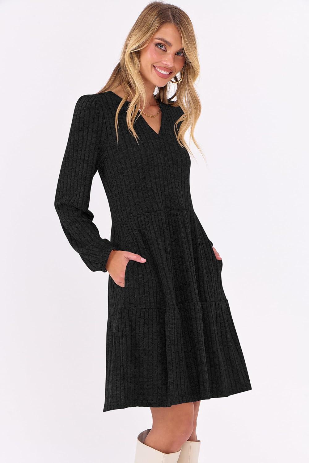 ANRABESS Long Sleeve Dress for Women Fall Fashion Outfits 2025 Casual V Neck Rib Knit Babydoll Sweater Dresses with Pockets(Black)