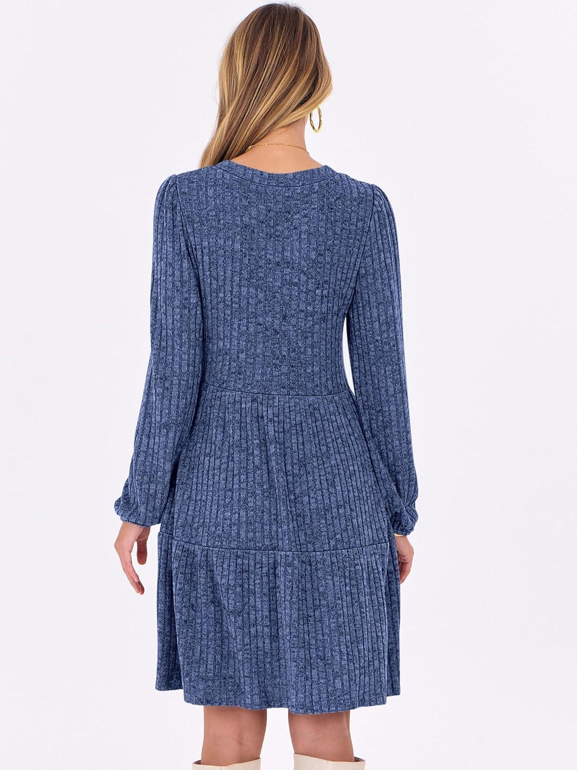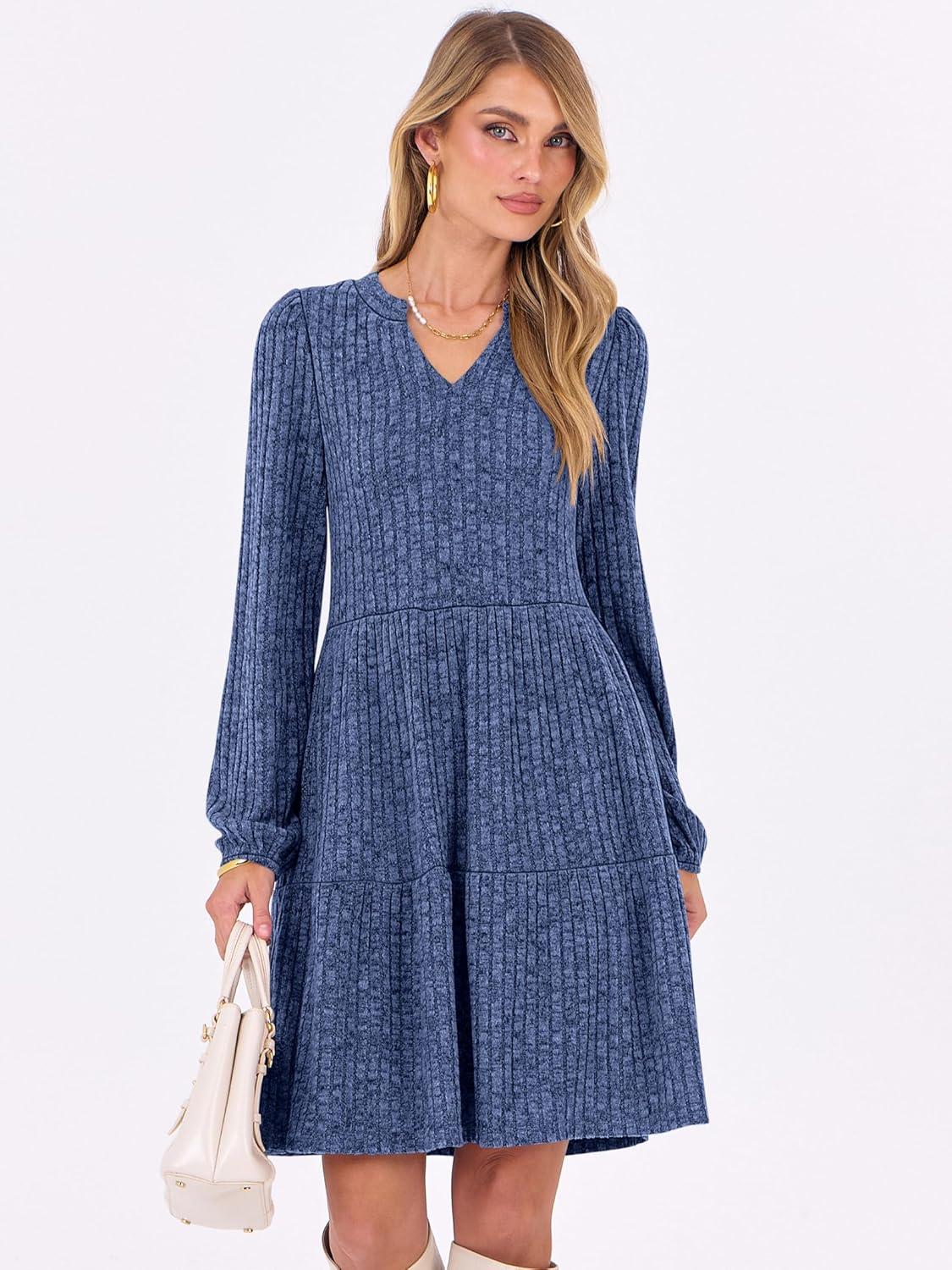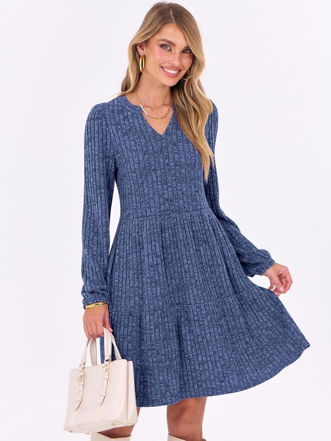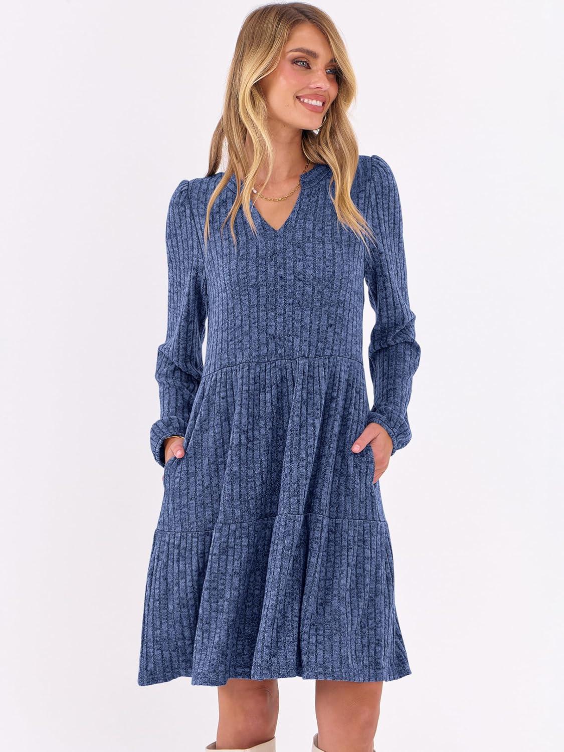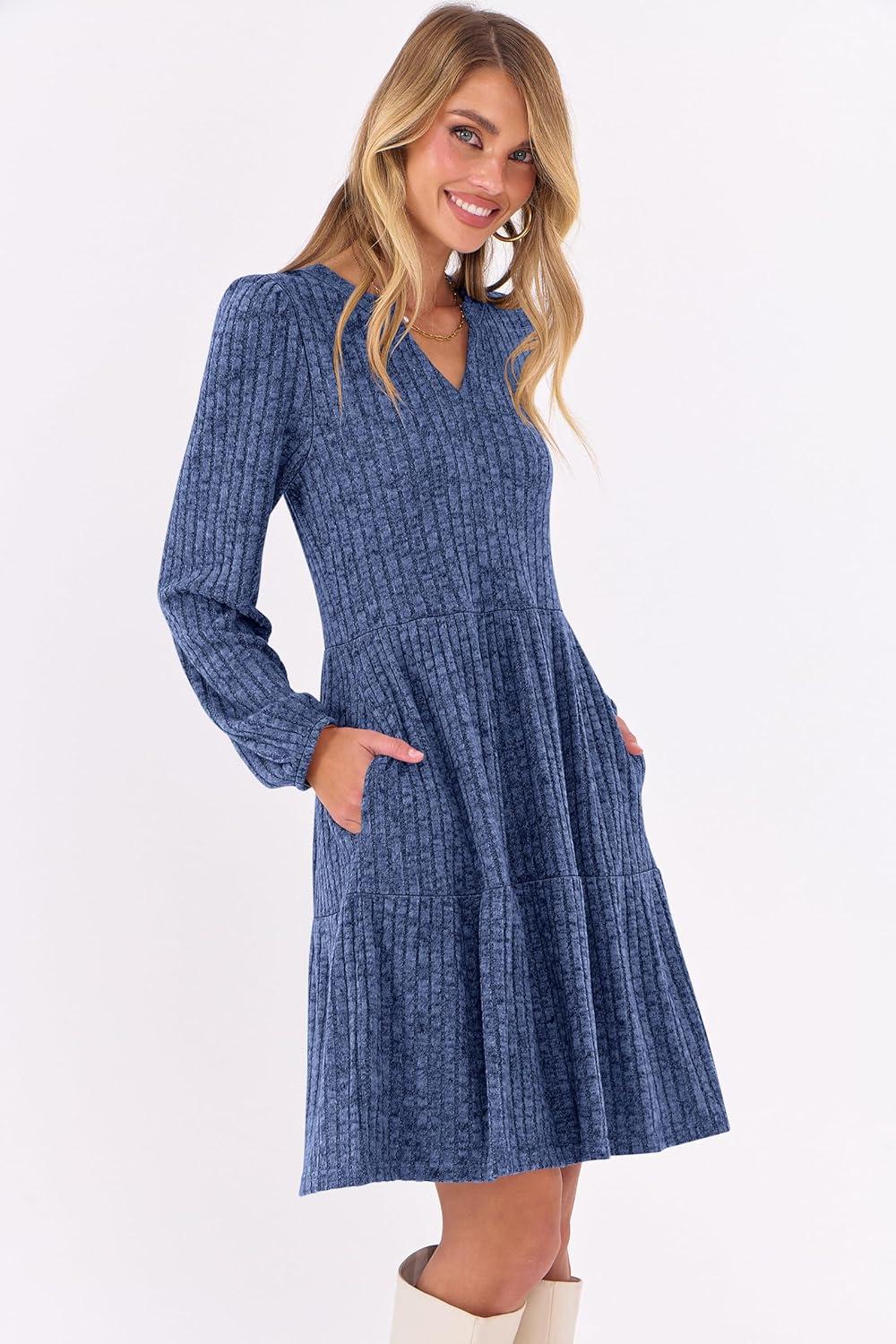 ANRABESS Long Sleeve Dress for Women Fall Fashion Outfits 2025 Casual V Neck Rib Knit Babydoll Sweater Dresses with Pockets(Dark Blue)