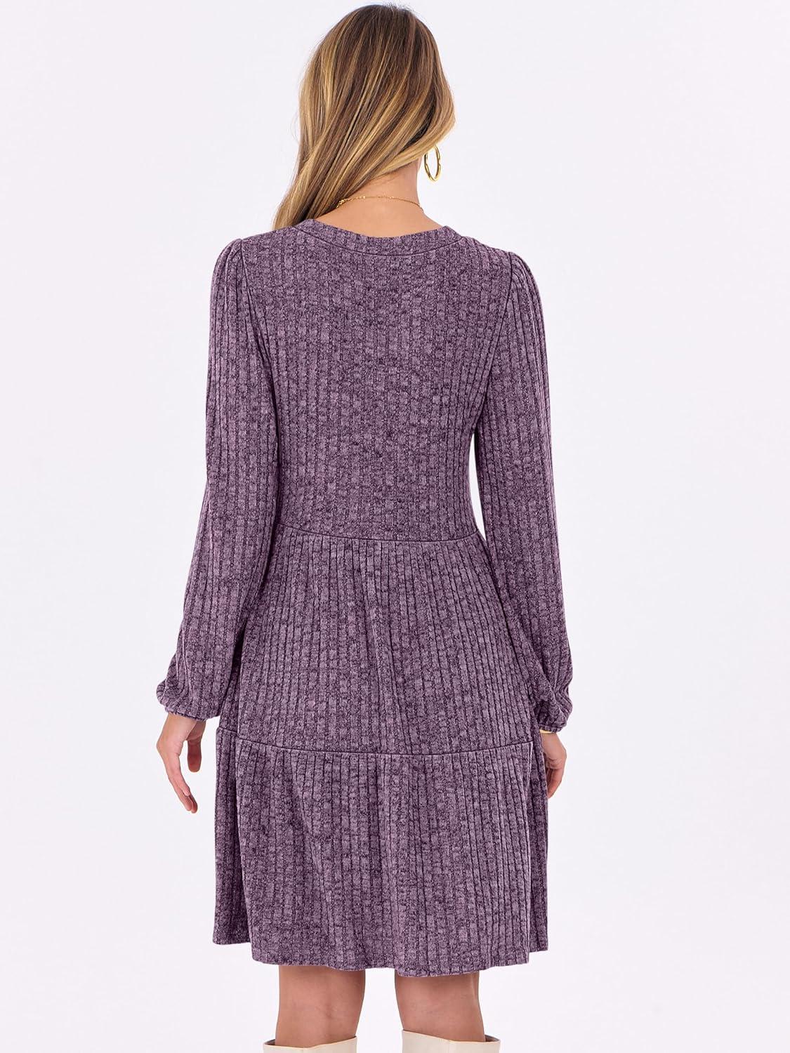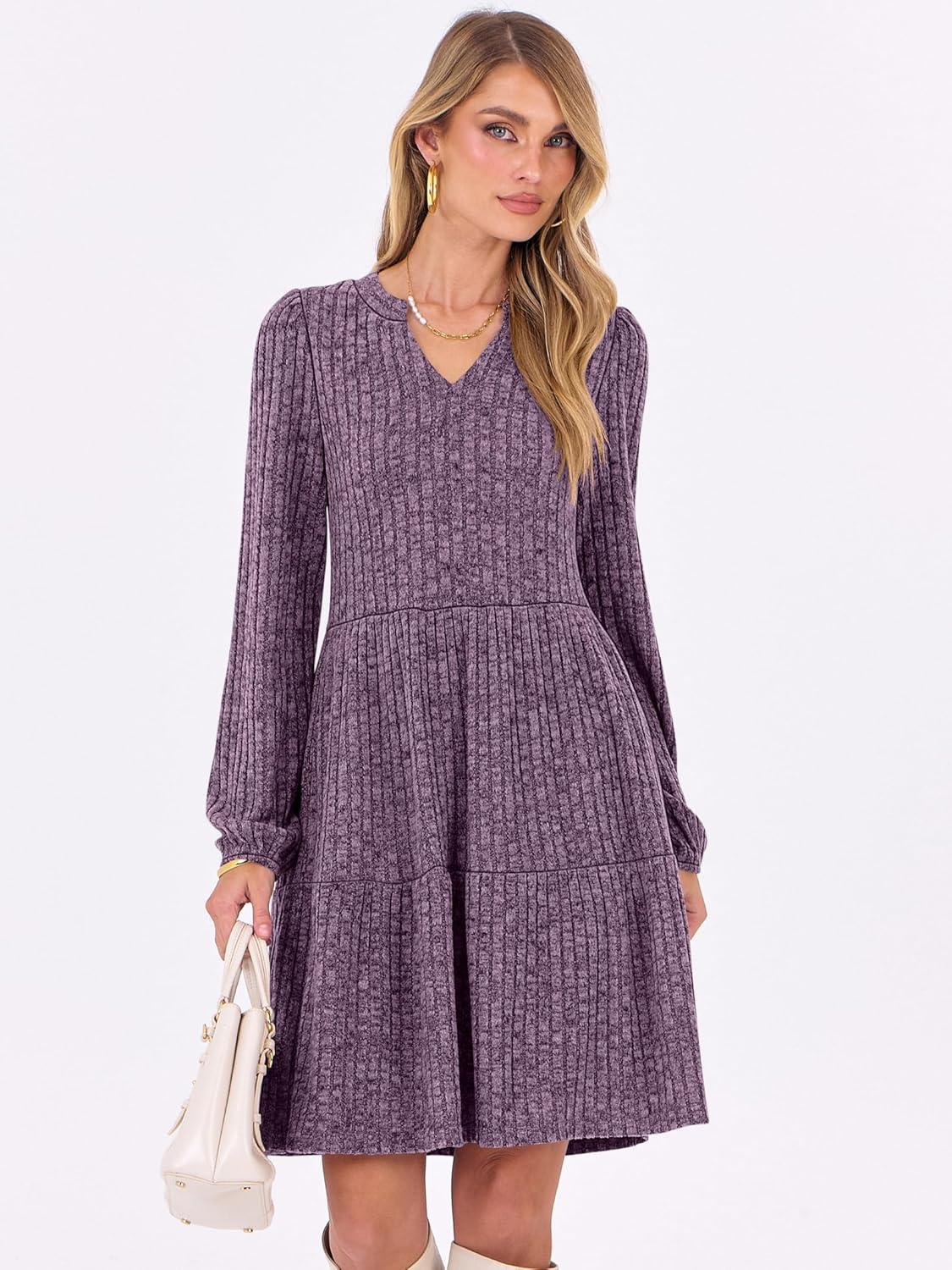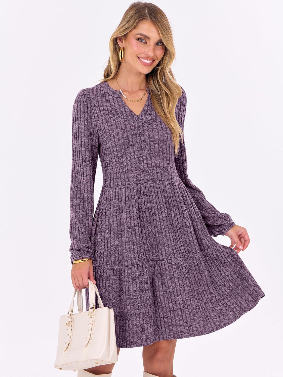 ANRABESS Long Sleeve Dress for Women Fall Fashion Outfits 2025 Casual V Neck Rib Knit Babydoll Sweater Dresses with Pockets(Purple)