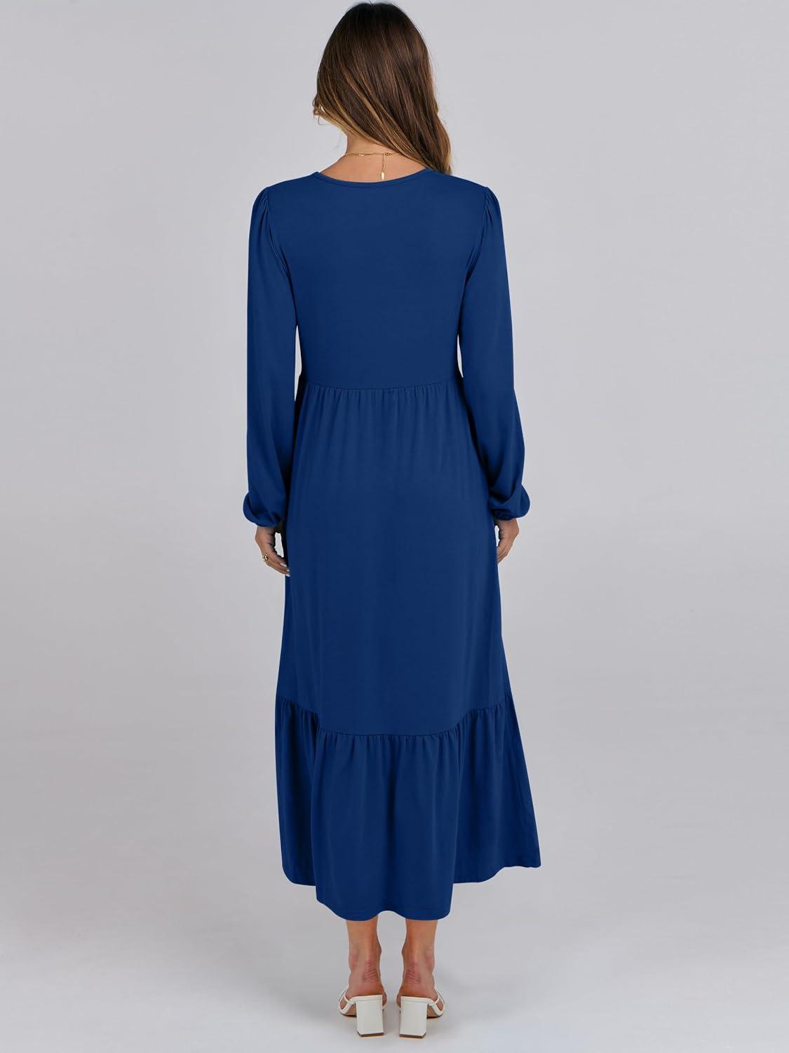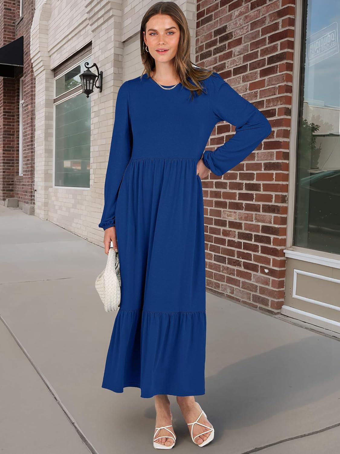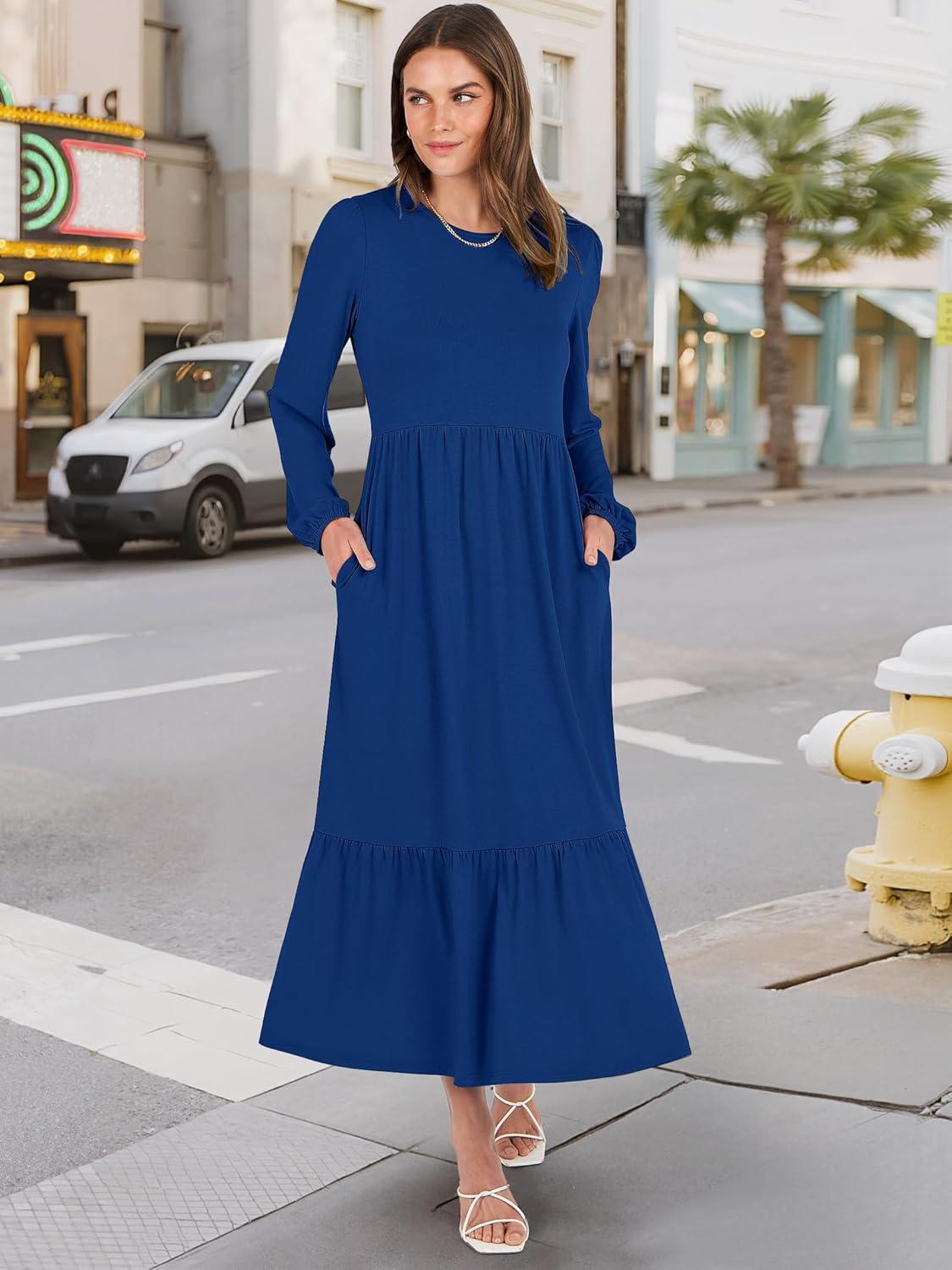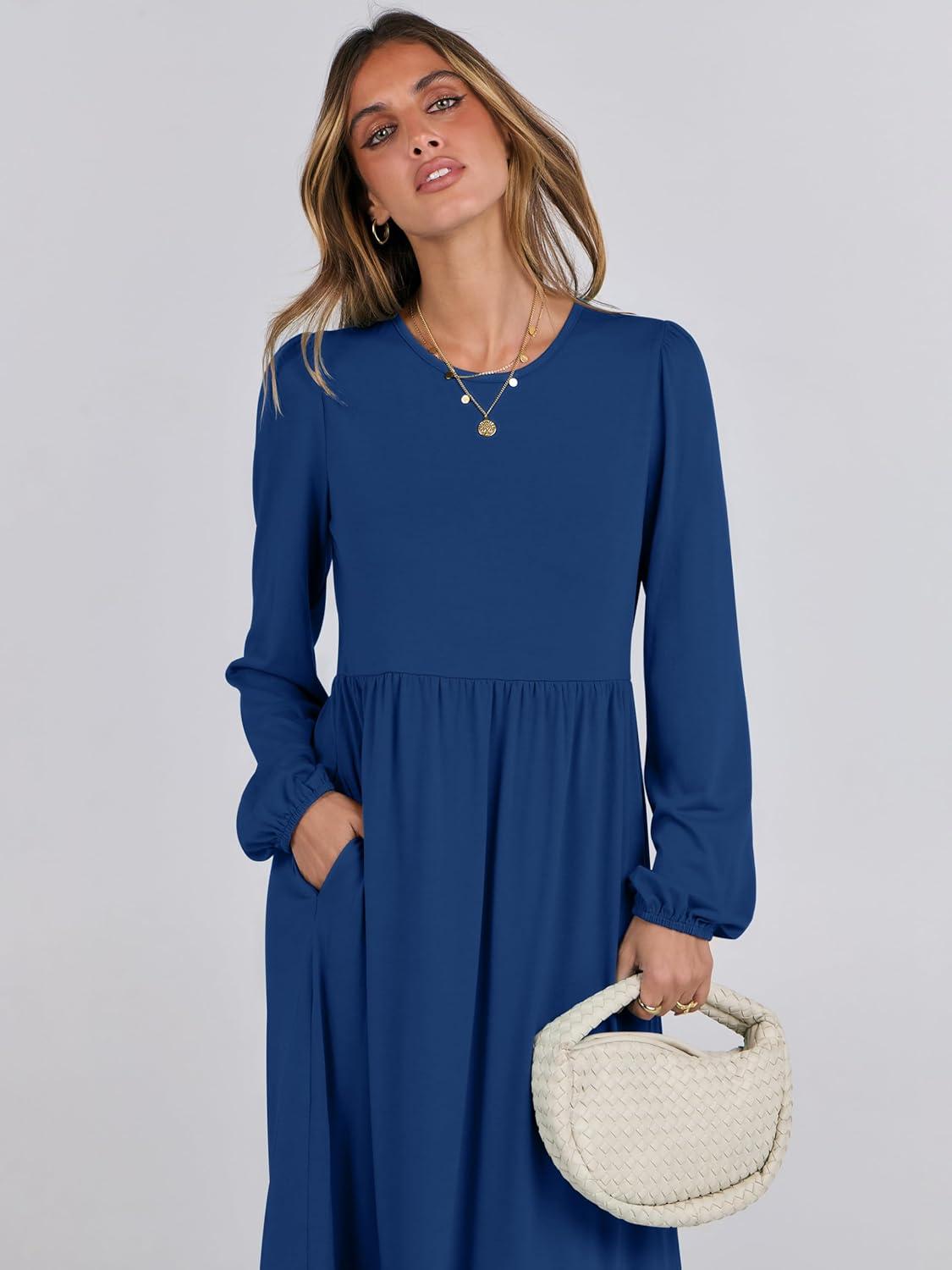 ANRABESS Long Sleeve Midi Dresses for Women Casual 2025 Fall Crewneck A Line Tiered Flowy Loose Trendy Dresses with Pockets(Blue)
