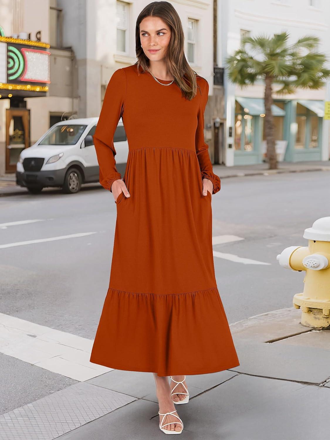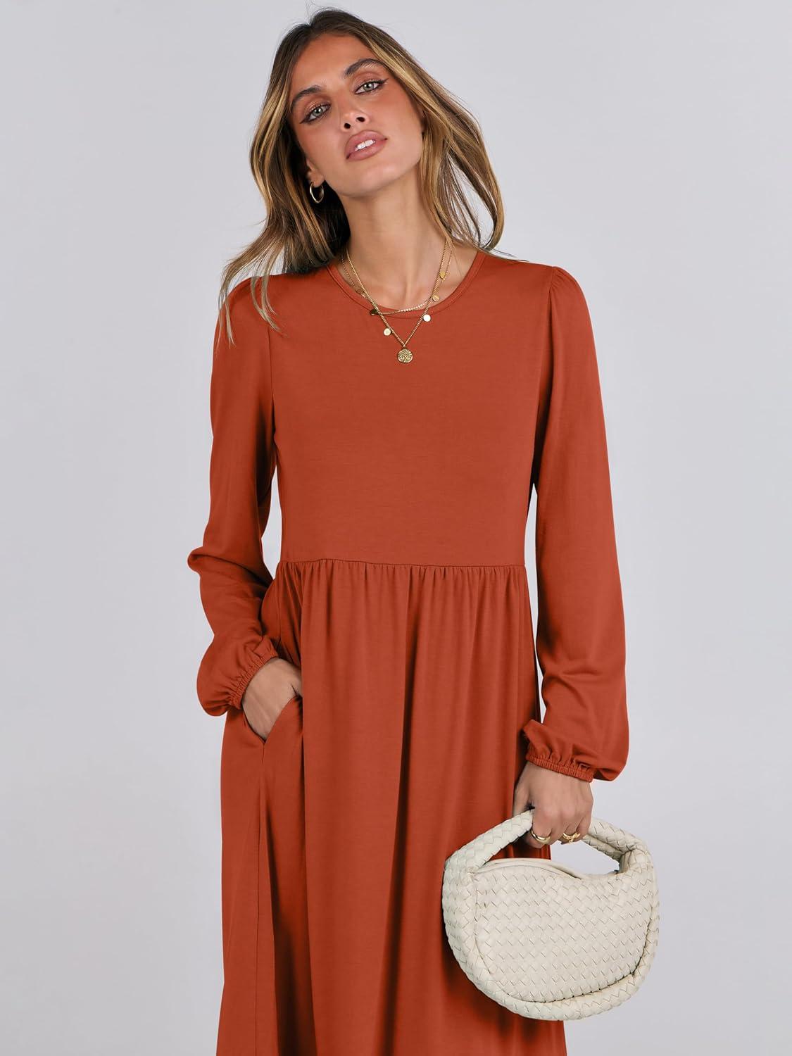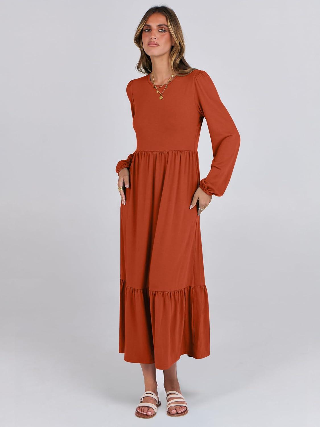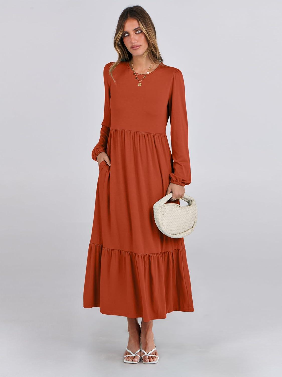 ANRABESS Long Sleeve Midi Dresses for Women Casual 2025 Fall Crewneck A Line Tiered Flowy Loose Trendy Dresses with Pockets(Brick Red)