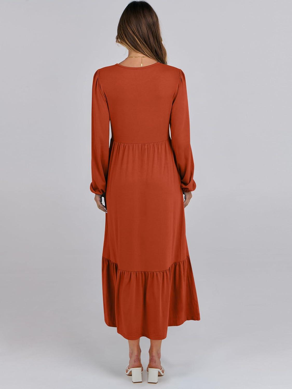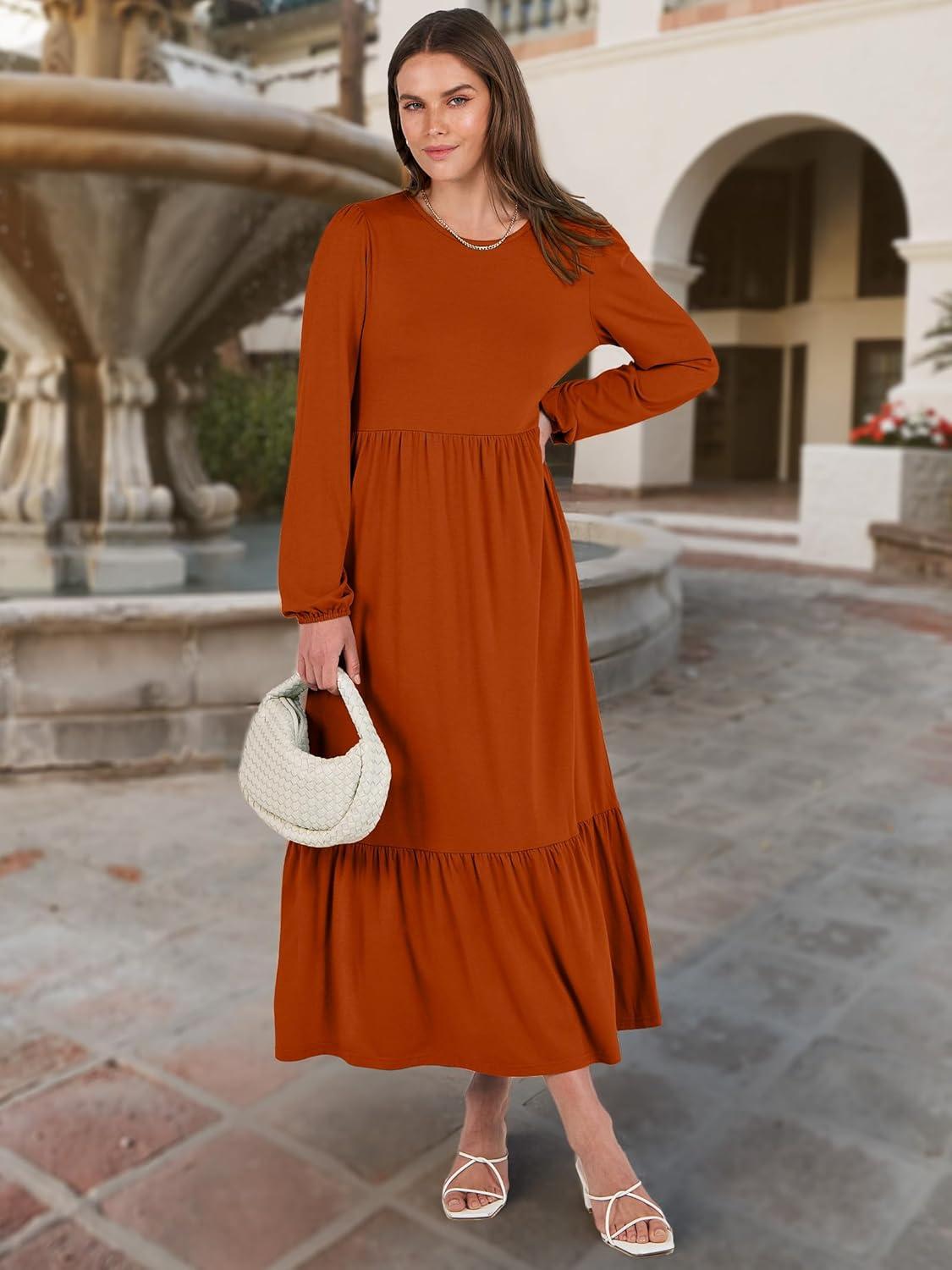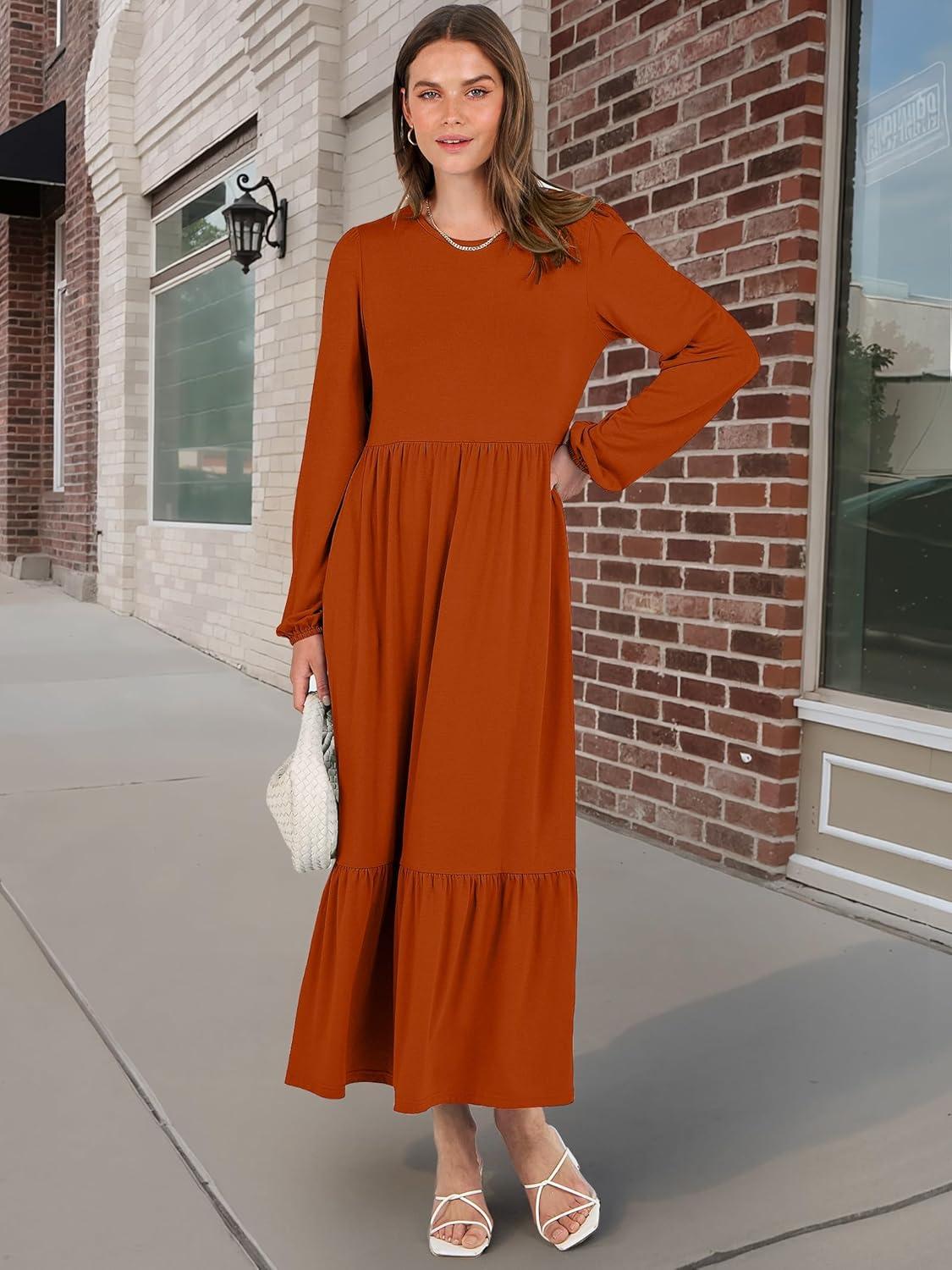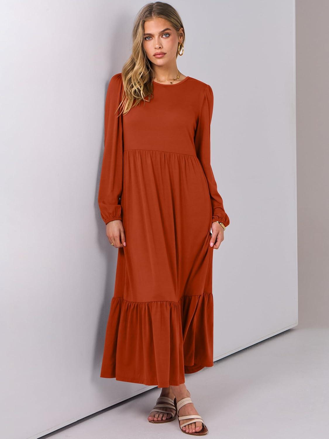 ANRABESS Long Sleeve Midi Dresses for Women Casual 2025 Fall Crewneck A Line Tiered Flowy Loose Trendy Dresses with Pockets(Brick Red)