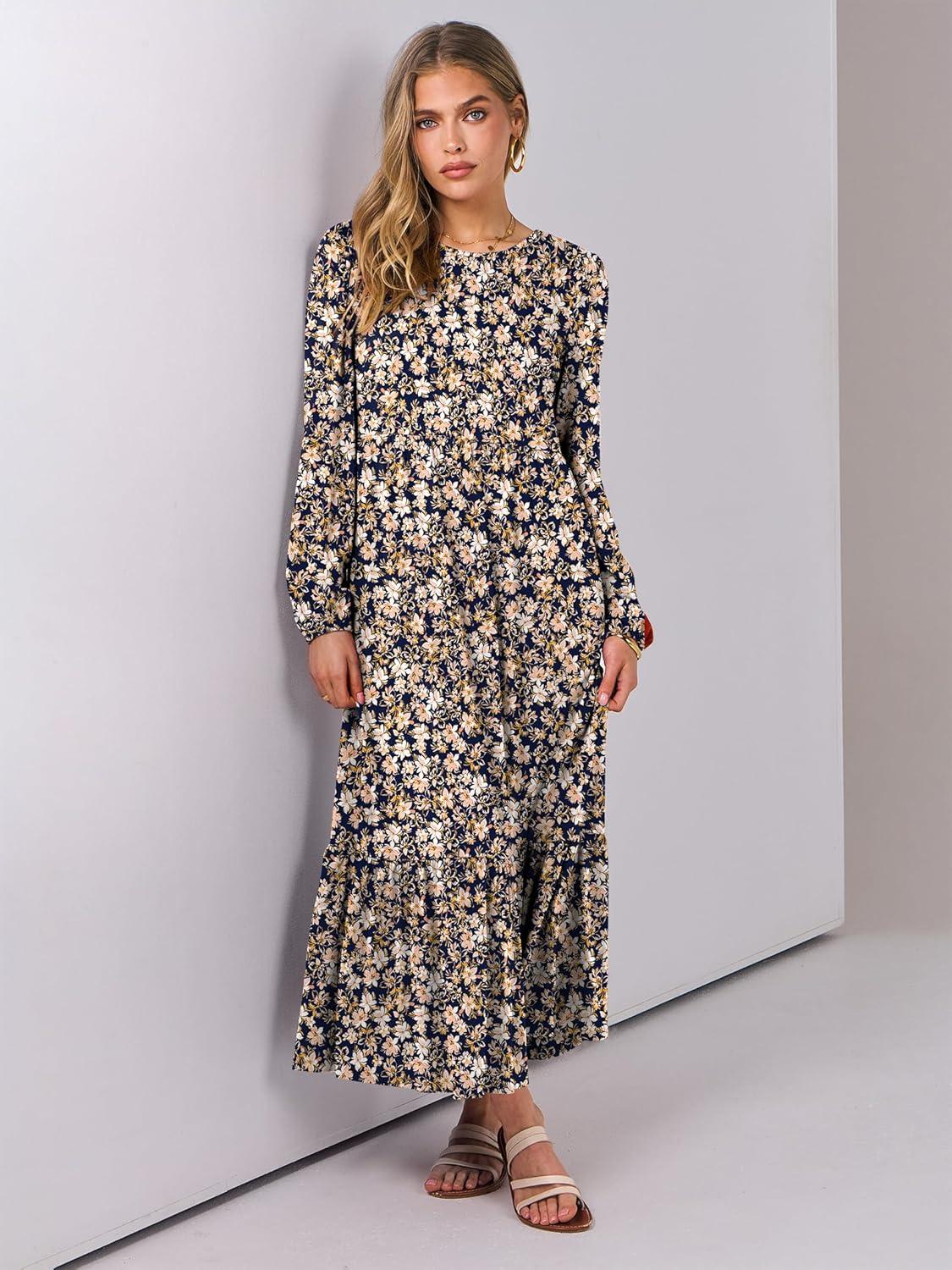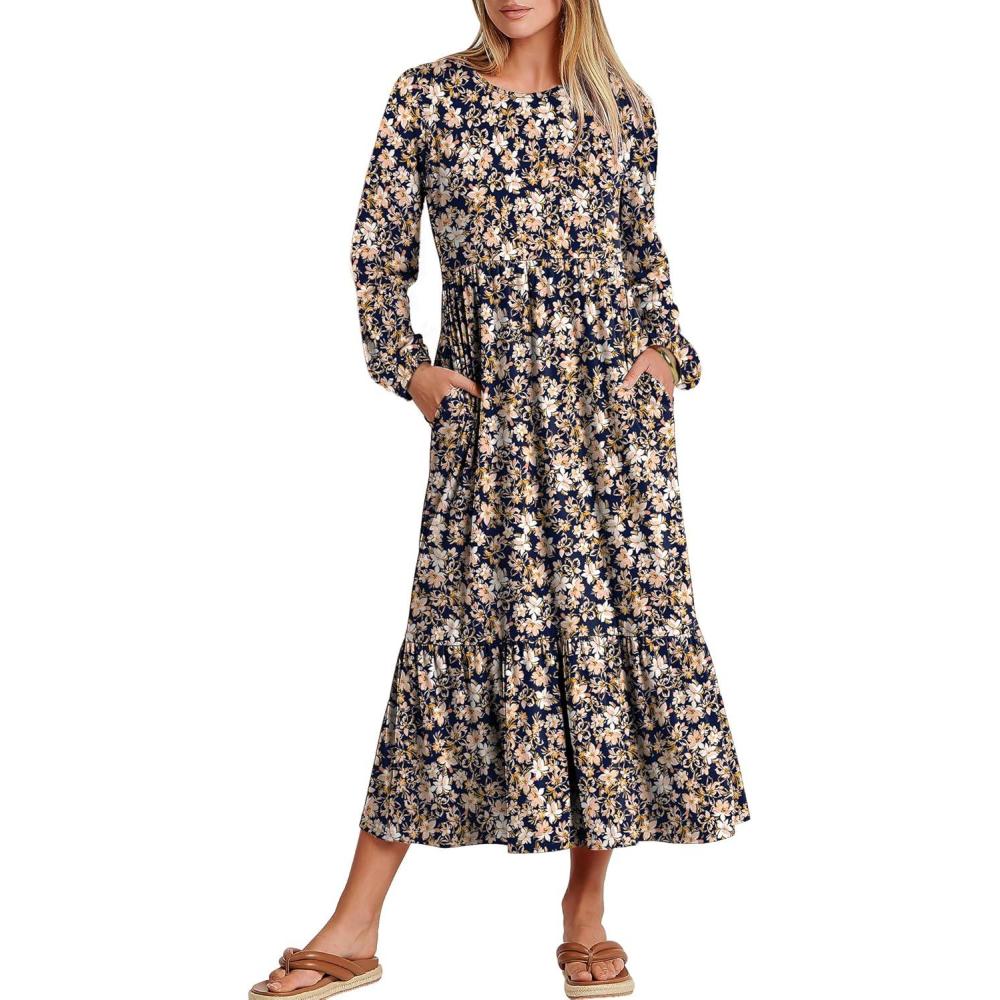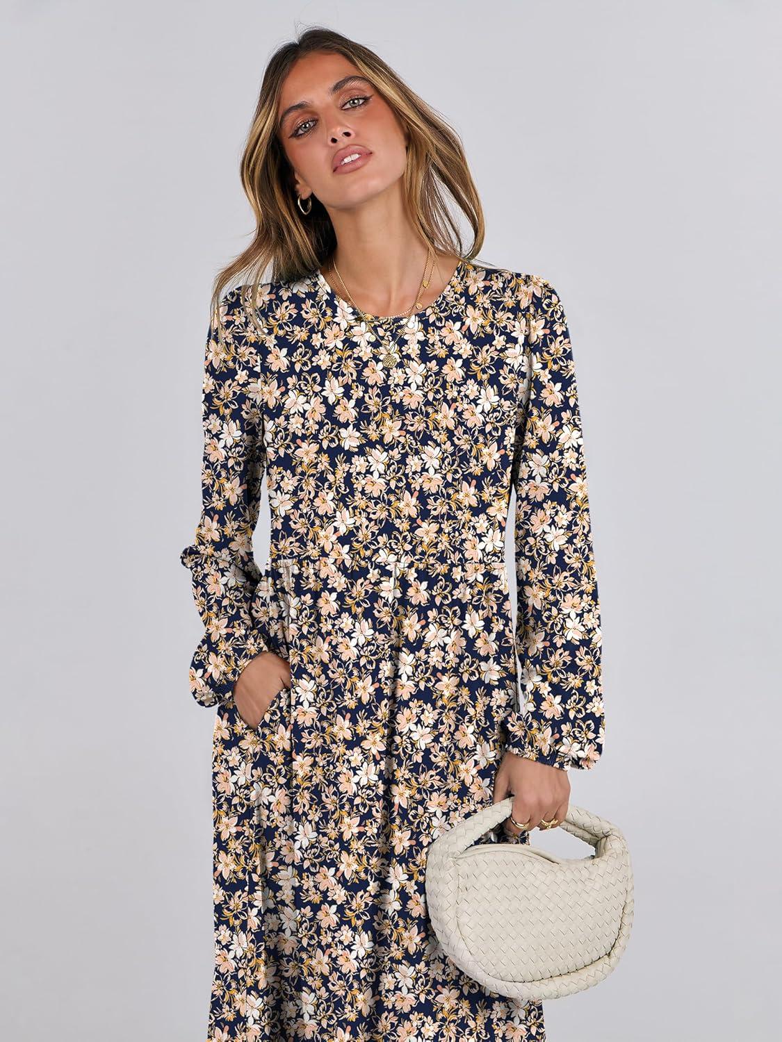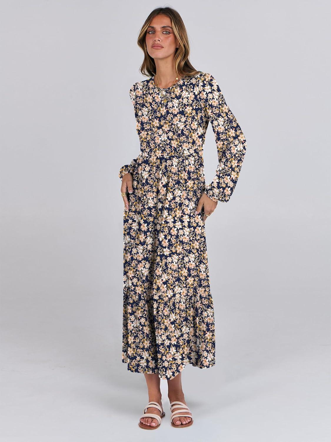ANRABESS Long Sleeve Midi Dresses for Women Casual 2025 Fall Crewneck A Line Tiered Flowy Loose Trendy Dresses with Pockets(Floral Navy Blue Pink)