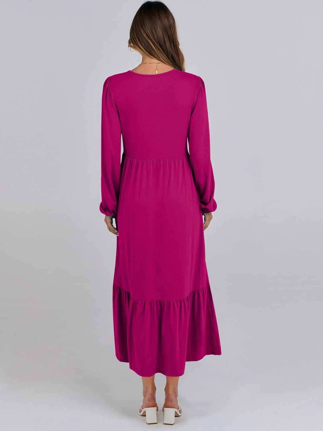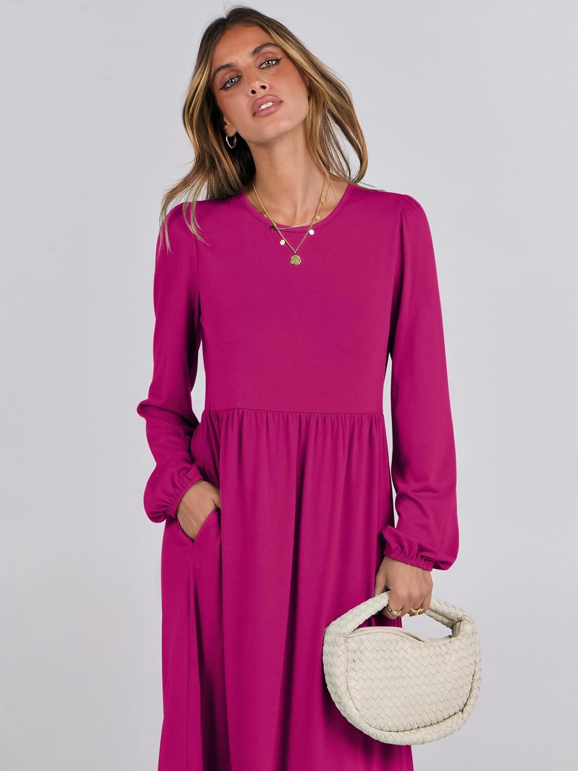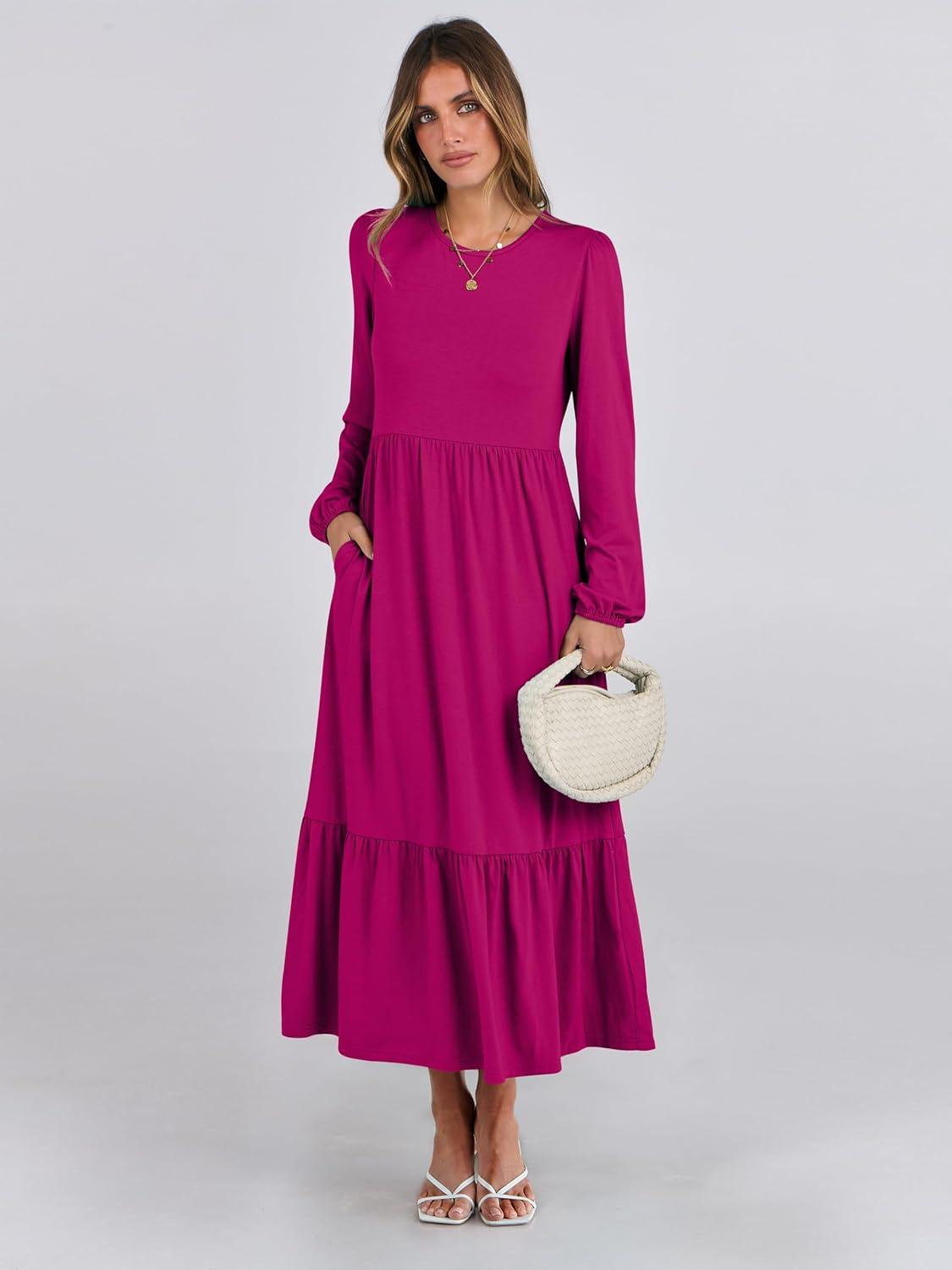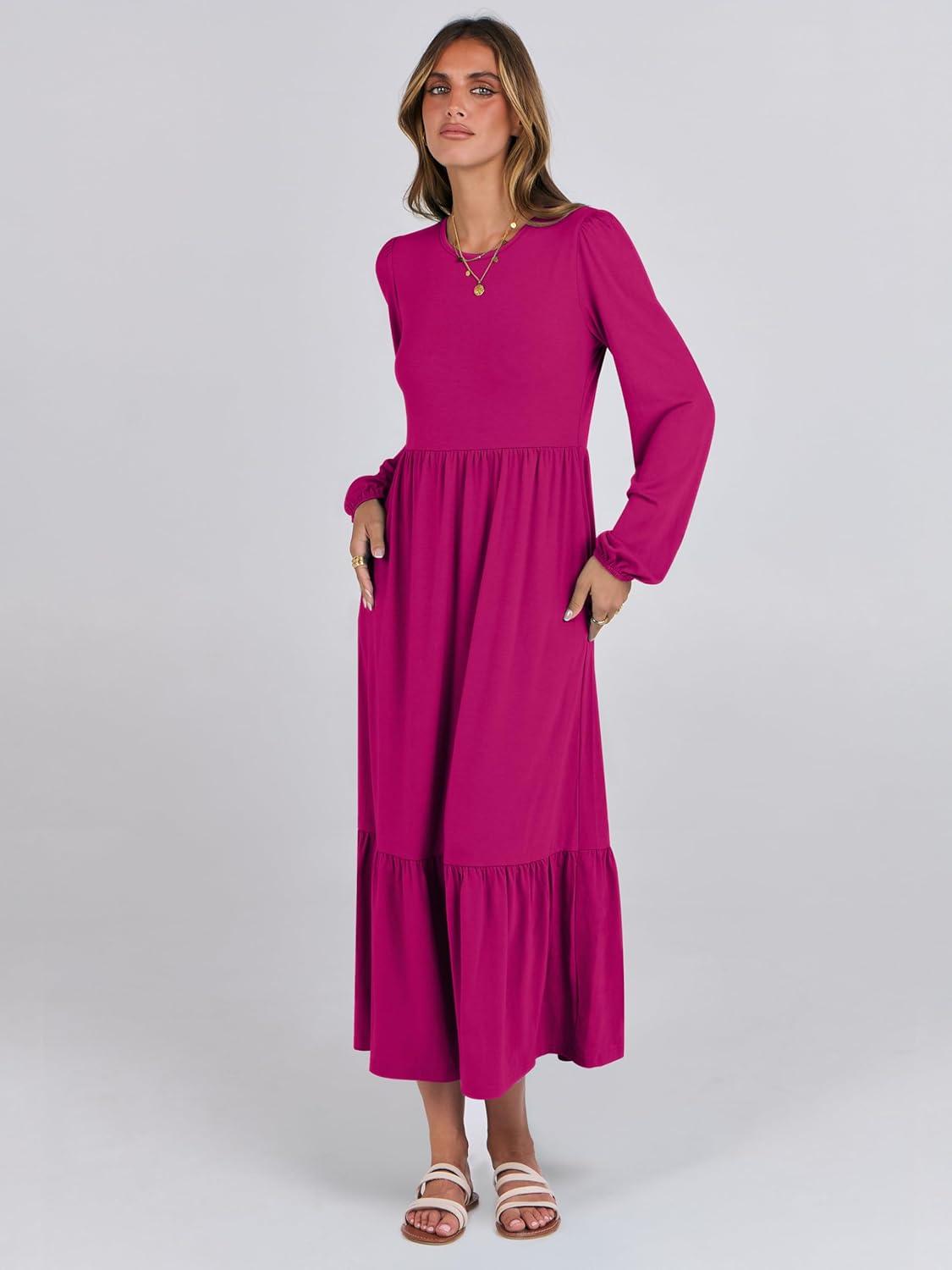 ANRABESS Long Sleeve Midi Dresses for Women Casual 2025 Fall Crewneck A Line Tiered Flowy Loose Trendy Dresses with Pockets(Rose)