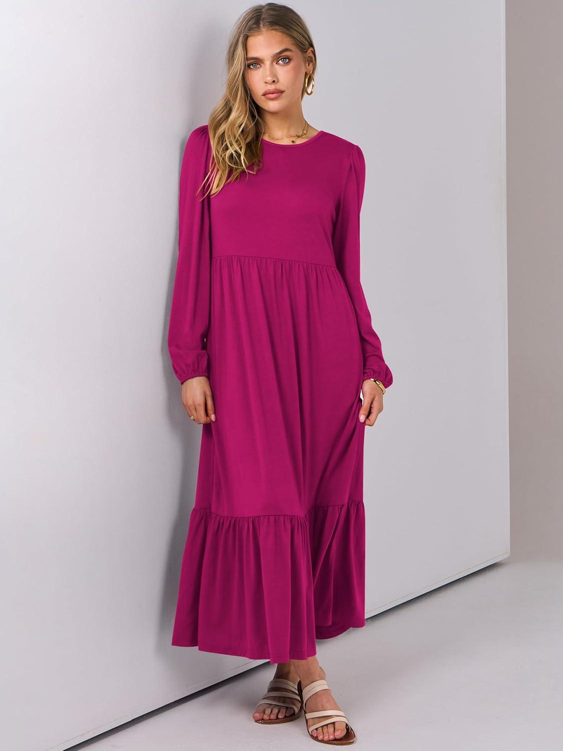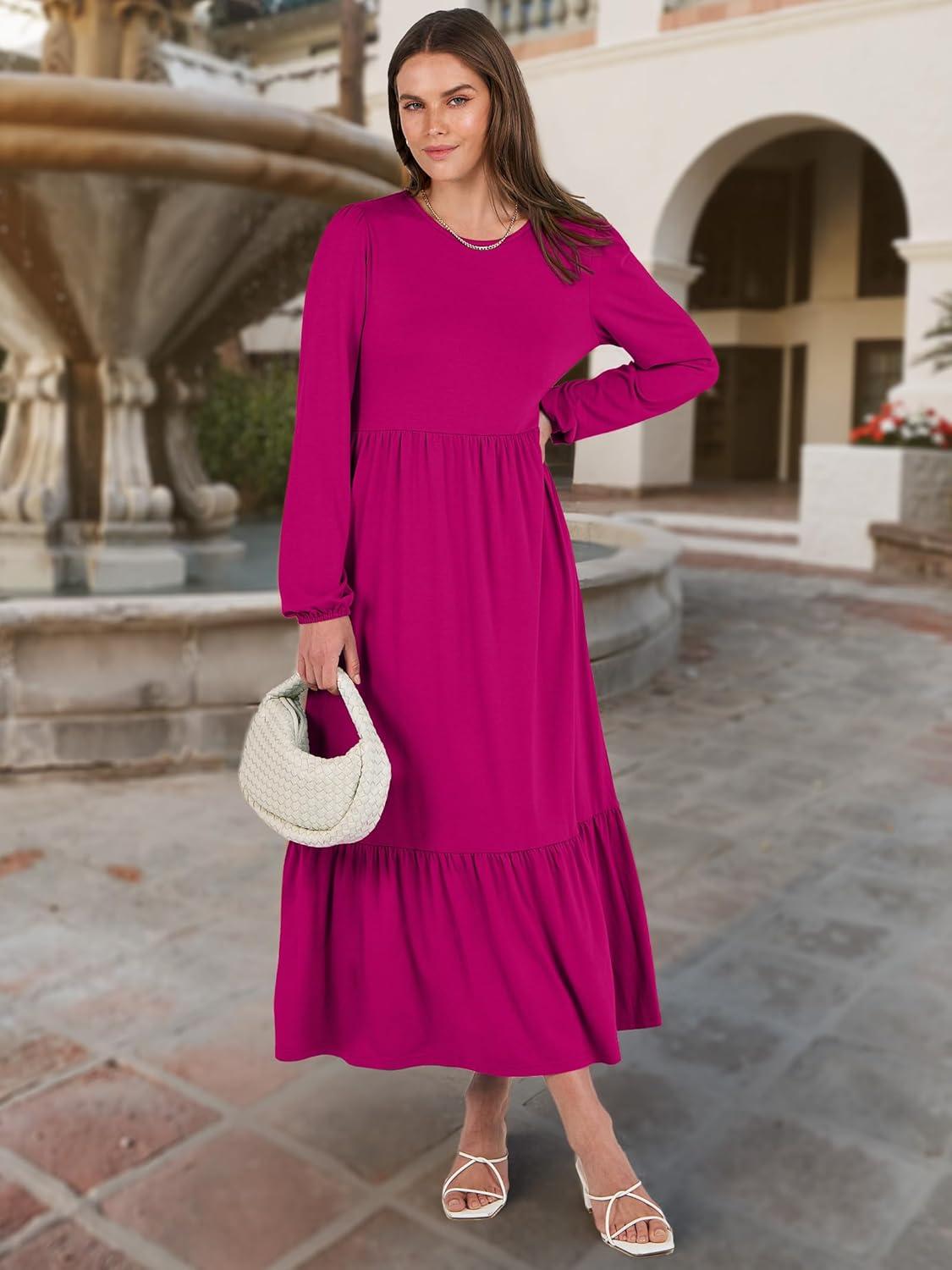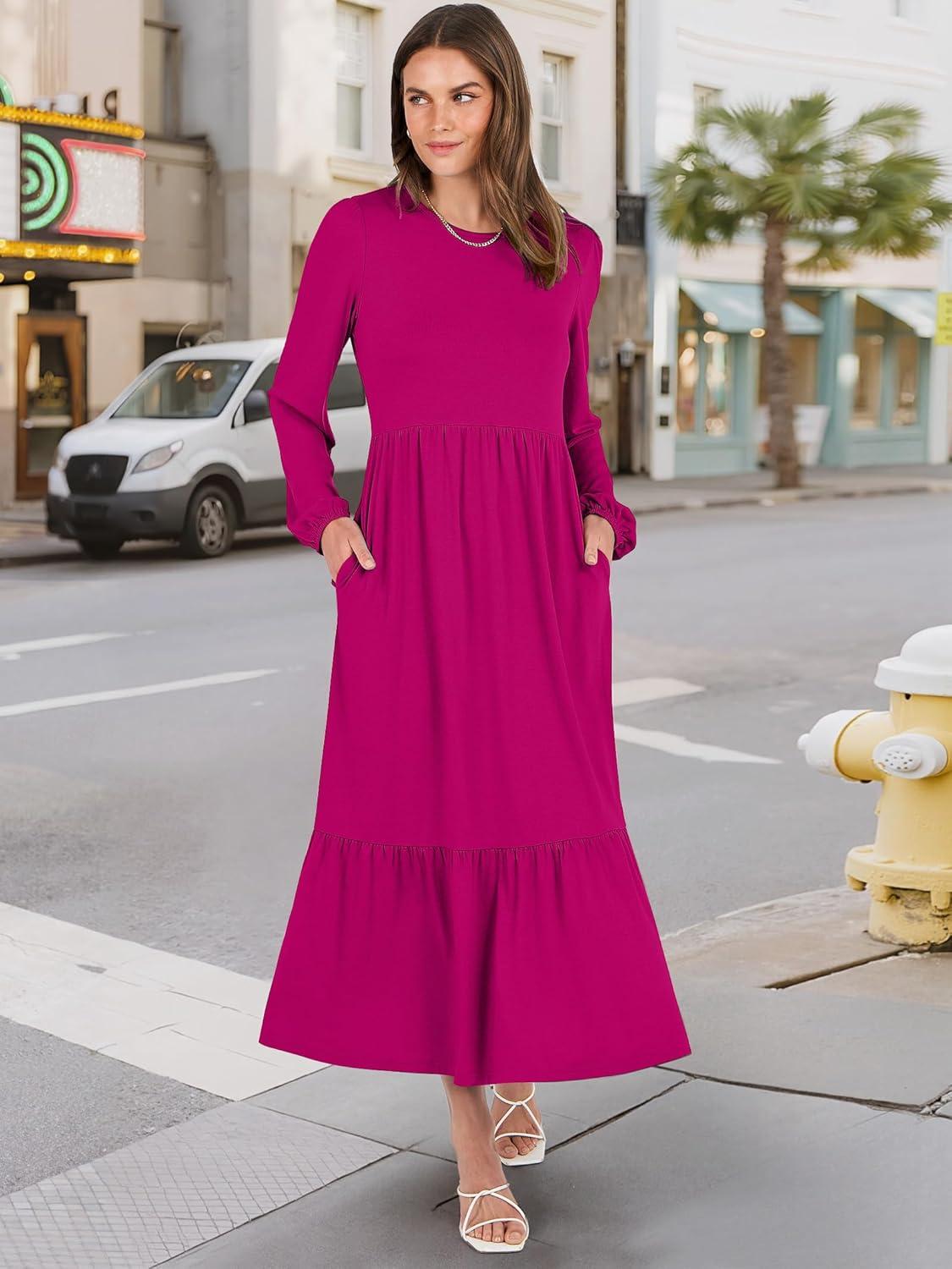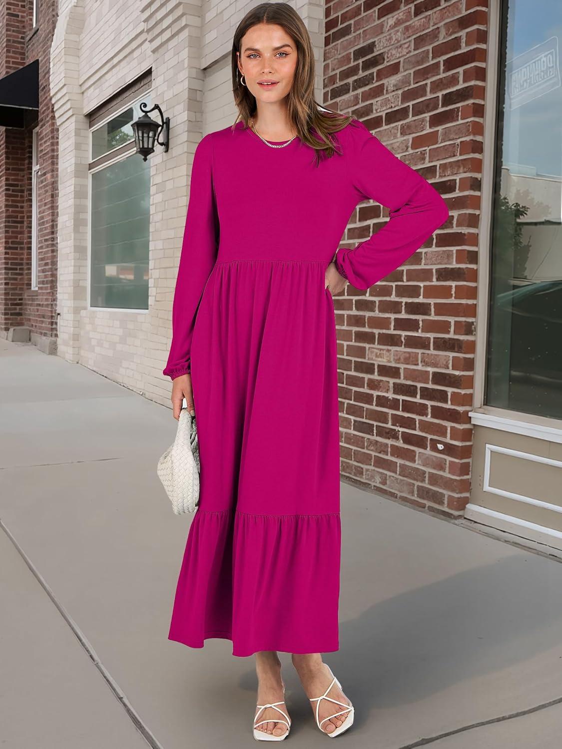 ANRABESS Long Sleeve Midi Dresses for Women Casual 2025 Fall Crewneck A Line Tiered Flowy Loose Trendy Dresses with Pockets(Rose)