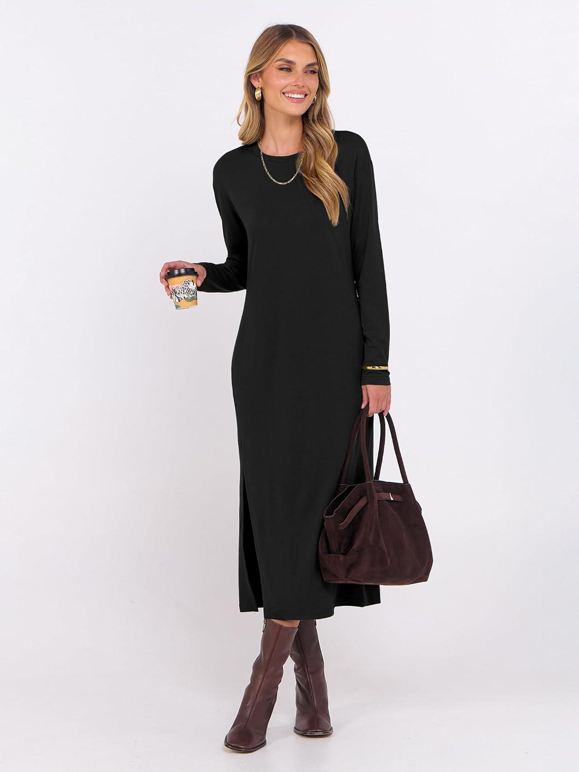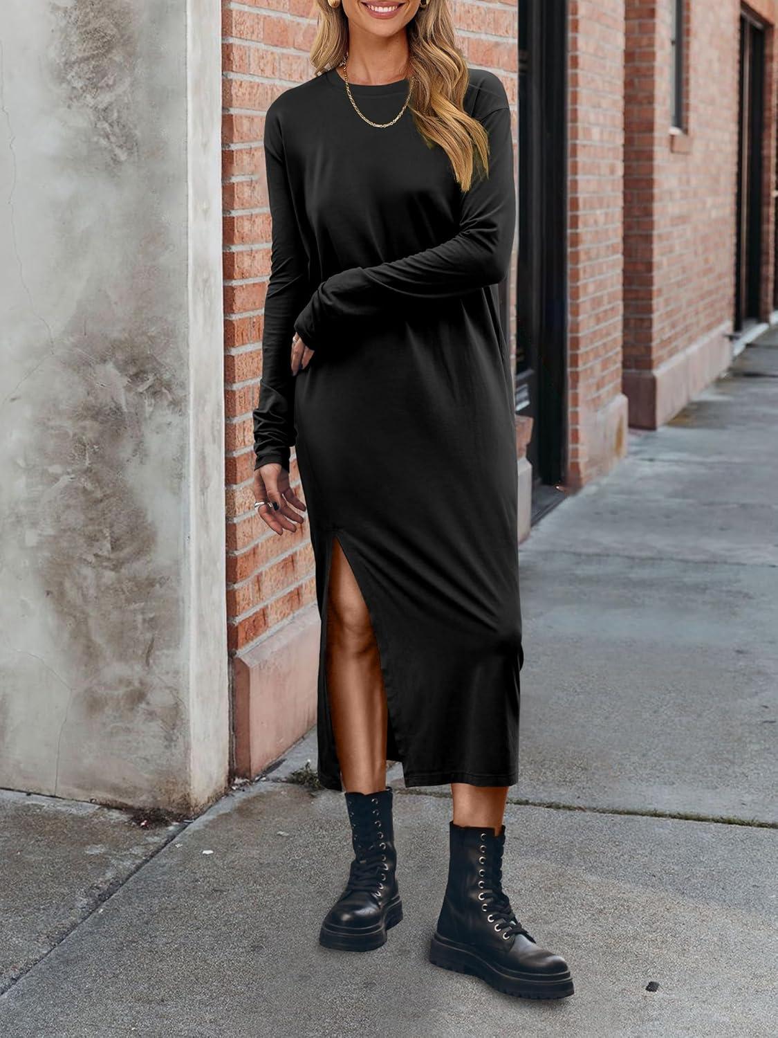 ANRABESS Long Sleeve Midi Dresses for Women Fall Fashion Casual Vacation Crewneck Loose Split Striped Long Tshirts Dress(Black)