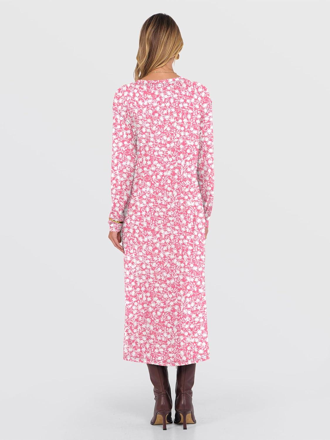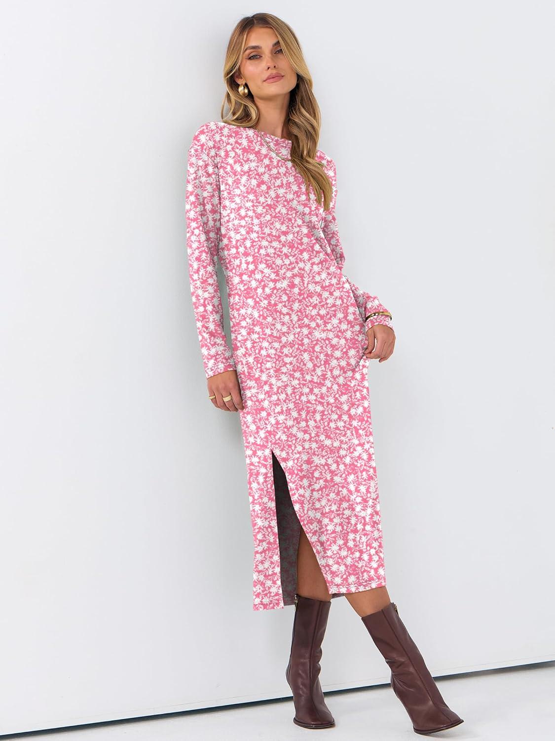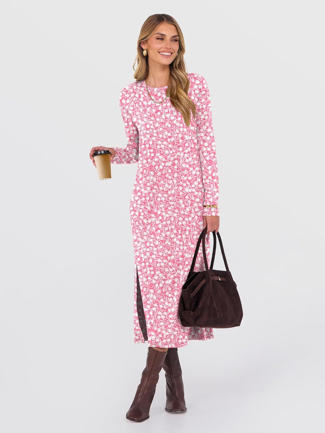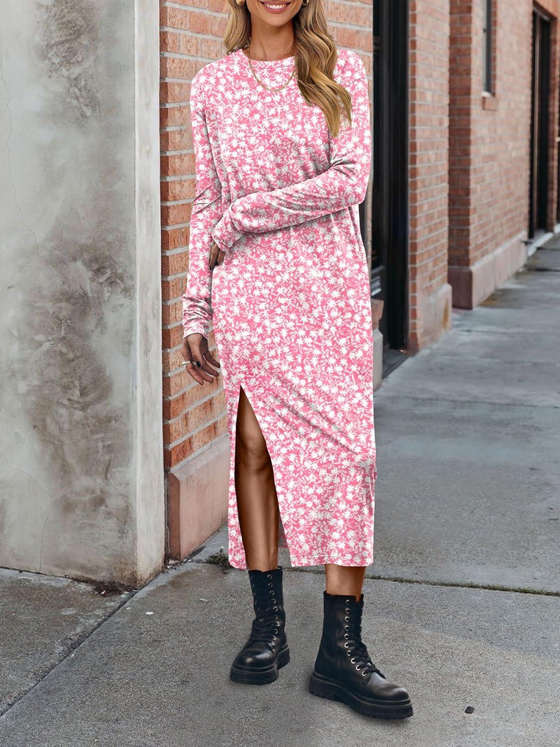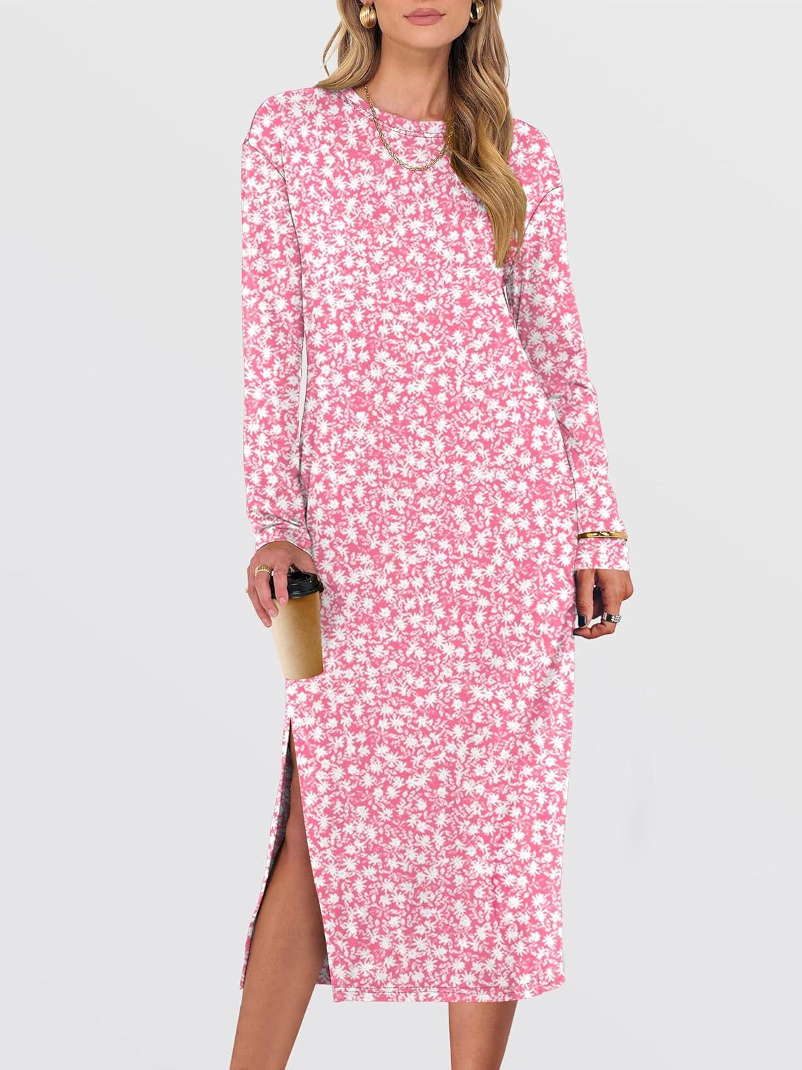 ANRABESS Long Sleeve Midi Dresses for Women Fall Fashion Casual Vacation Crewneck Loose Split Striped Long Tshirts Dress(Floral Pink White)