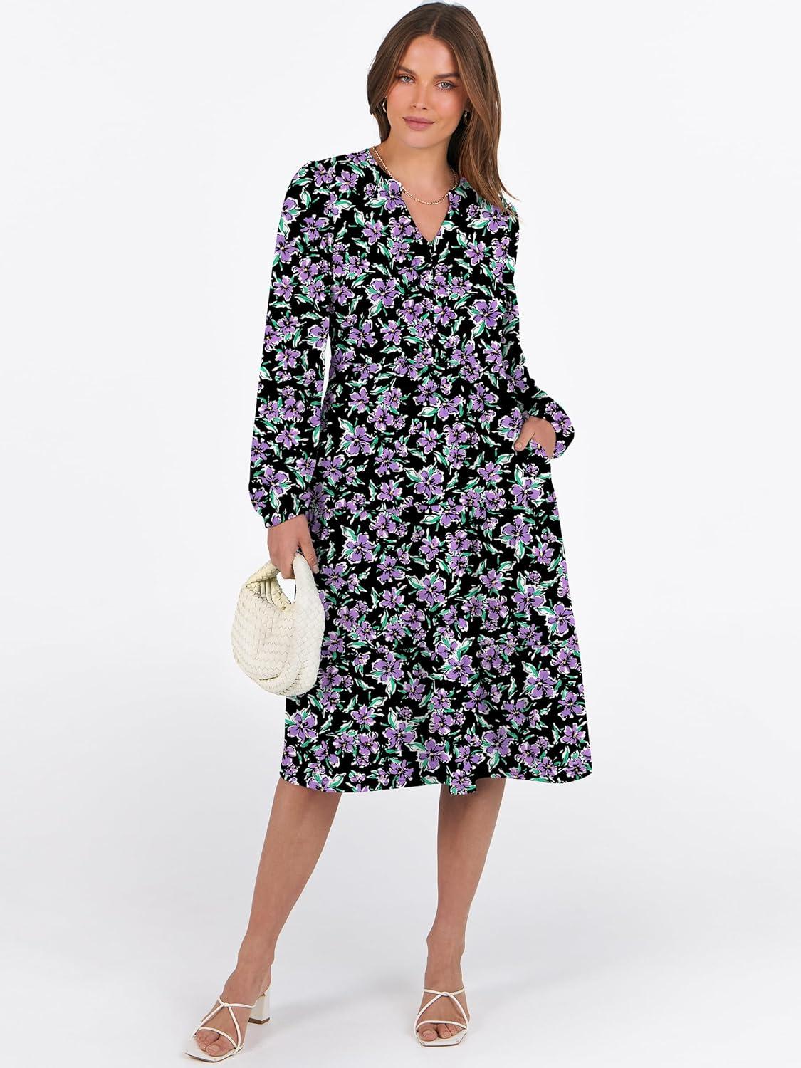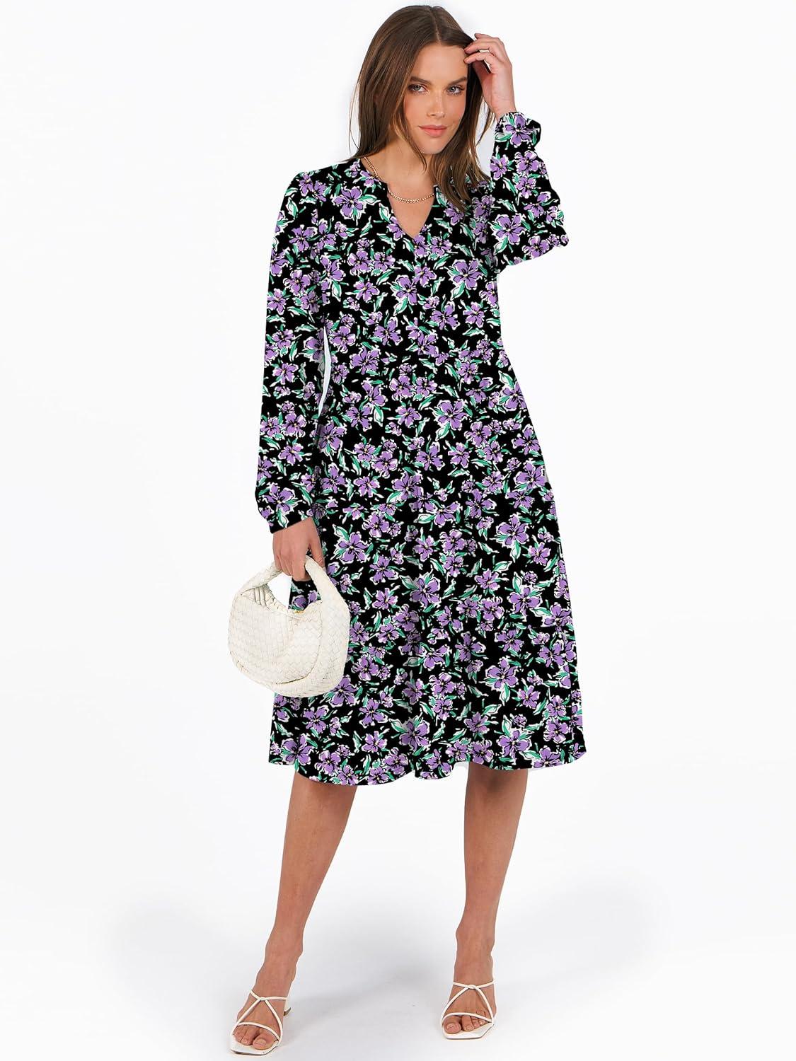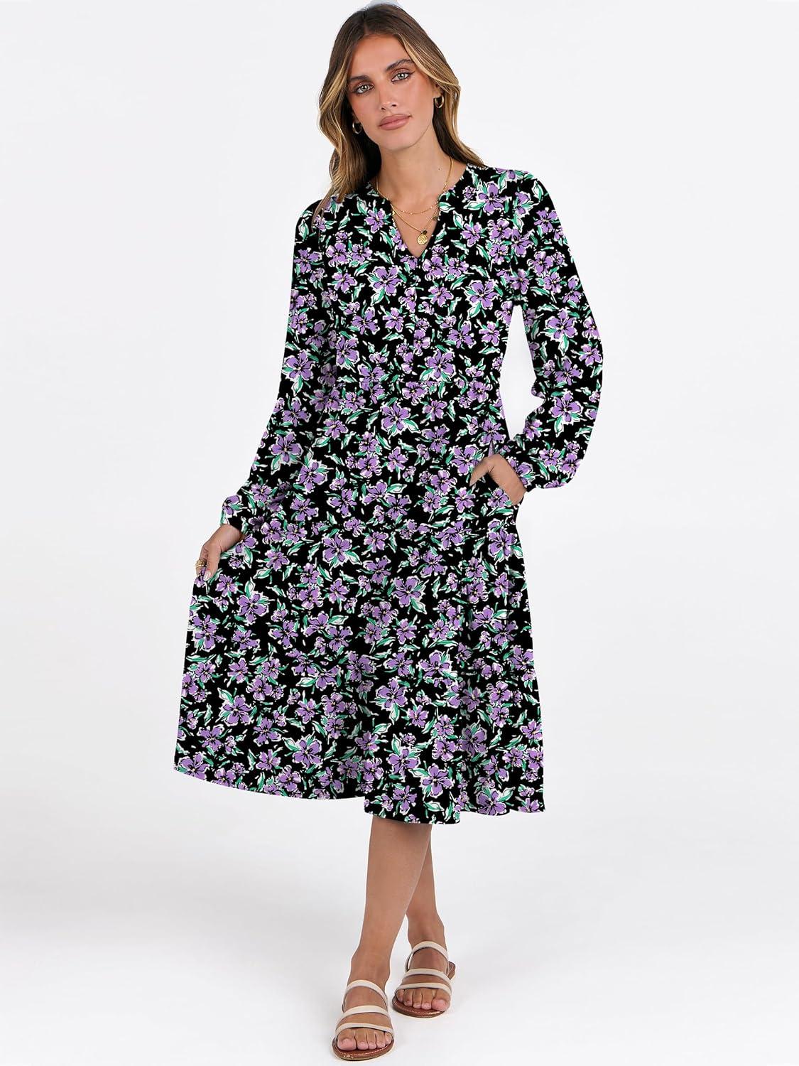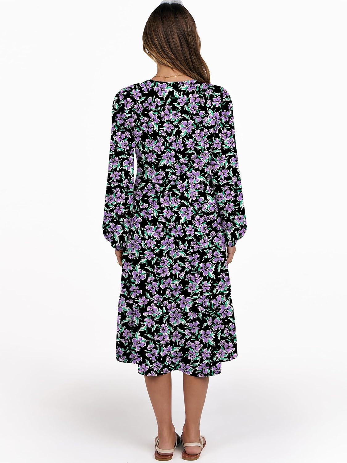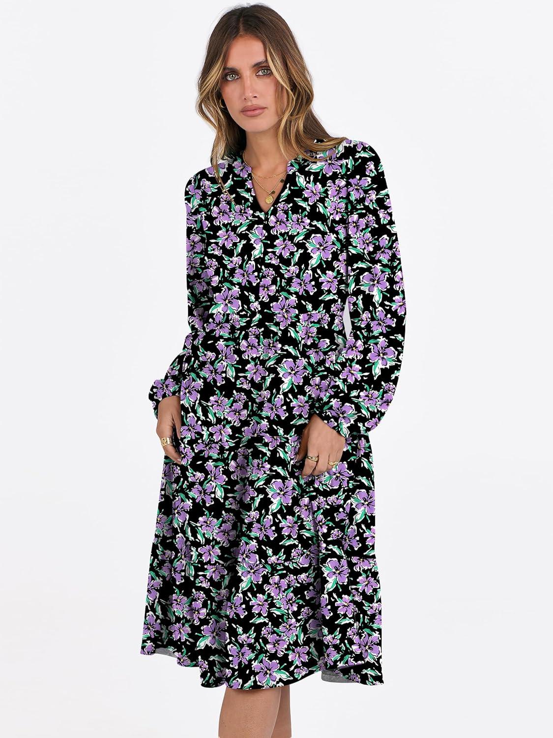 ANRABESS Long Sleeve Midi Dresses for Women V Neck 2025 Fall Fashion Casual Loose Fit Flowy Swing Tiered Vacation Boho Dress(Floral Black Purple)