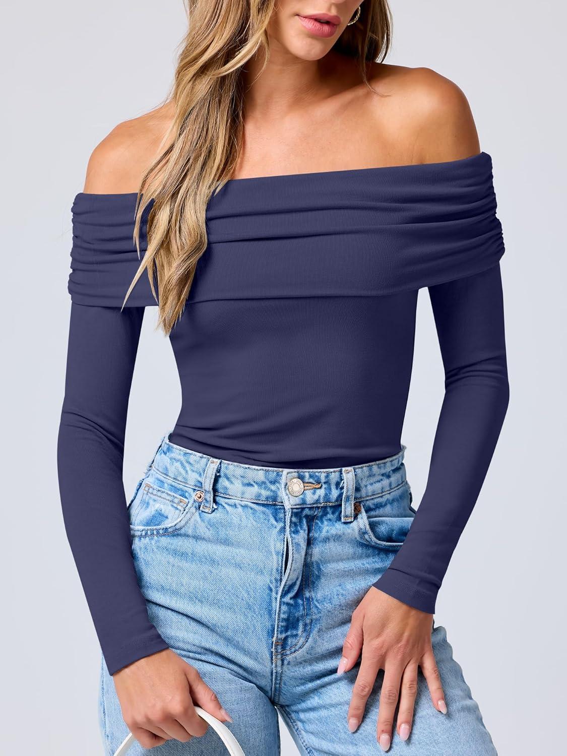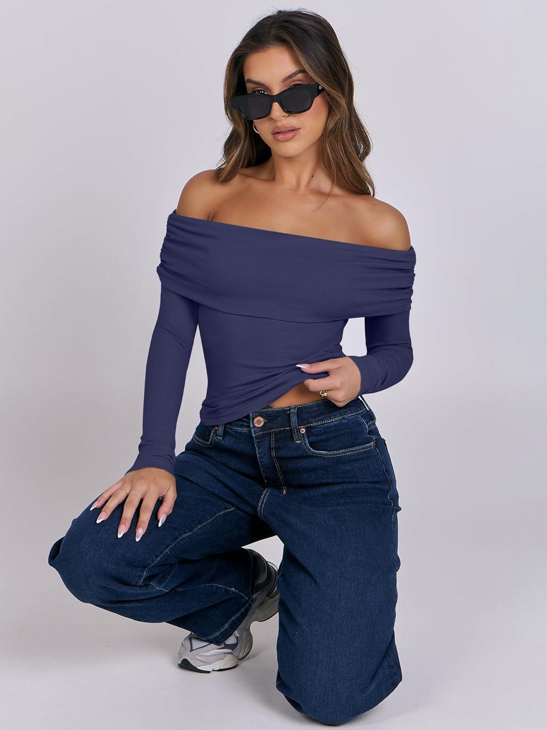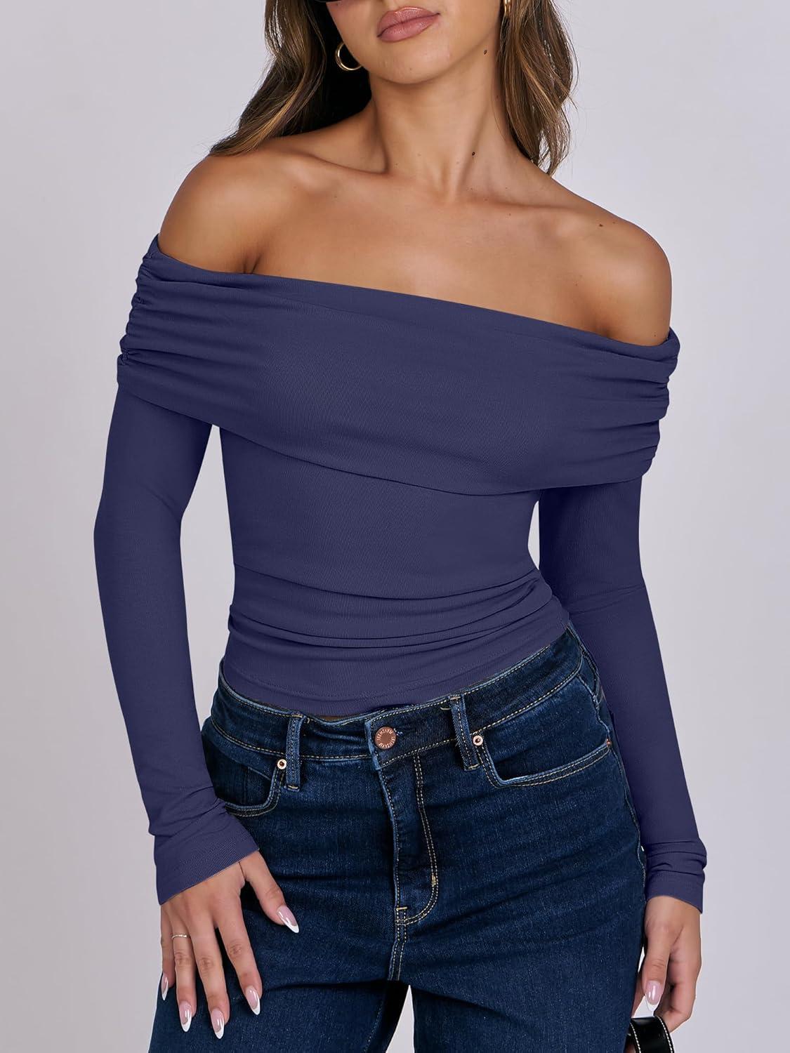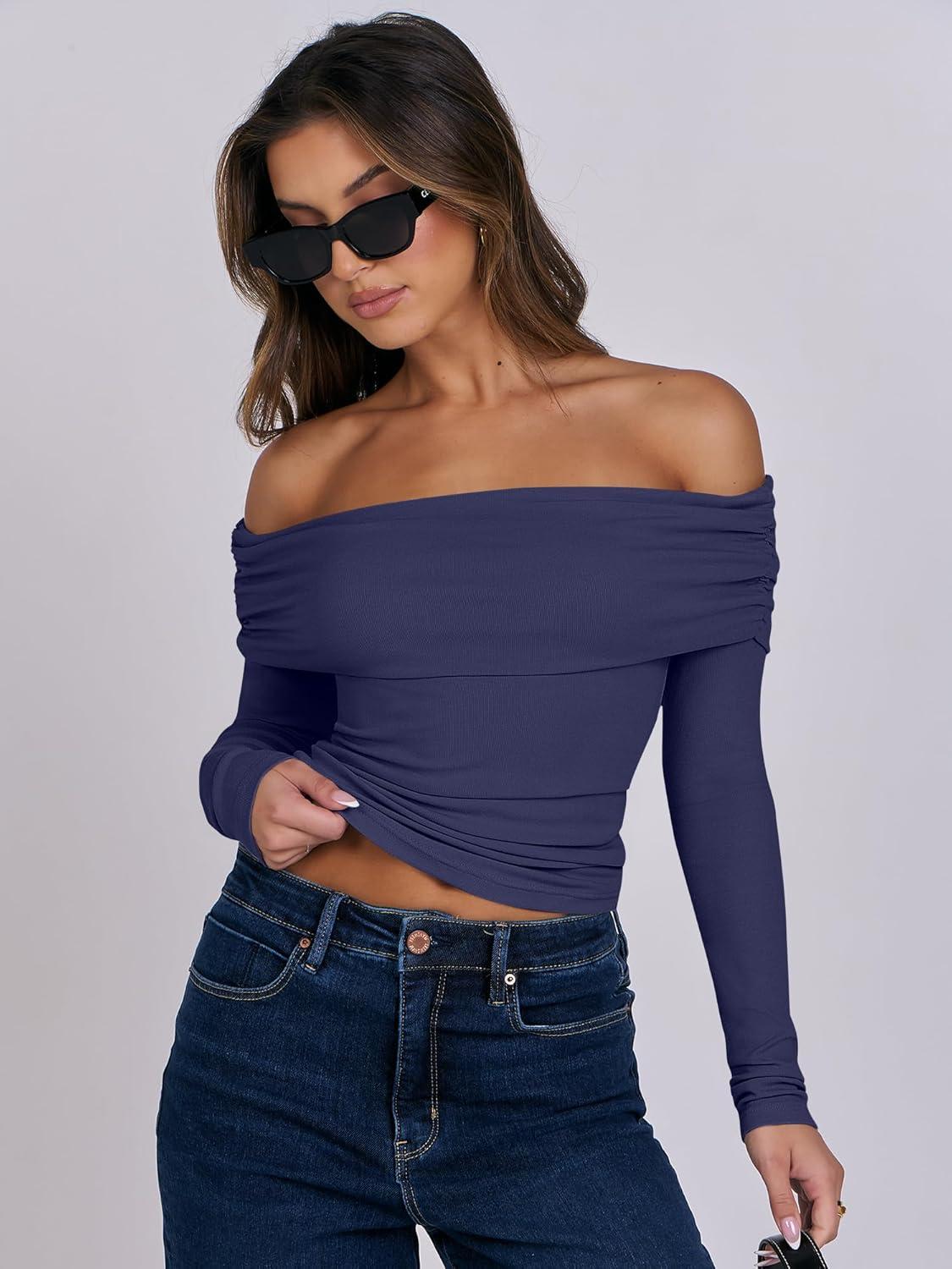 ANRABESS Long Sleeve Shirt for Women 2025 Fall Off Shoulder Slim Fit Tee Top Sexy Going Out Ruched Blouses Y2K Trendy Clothes(Navy Blue)