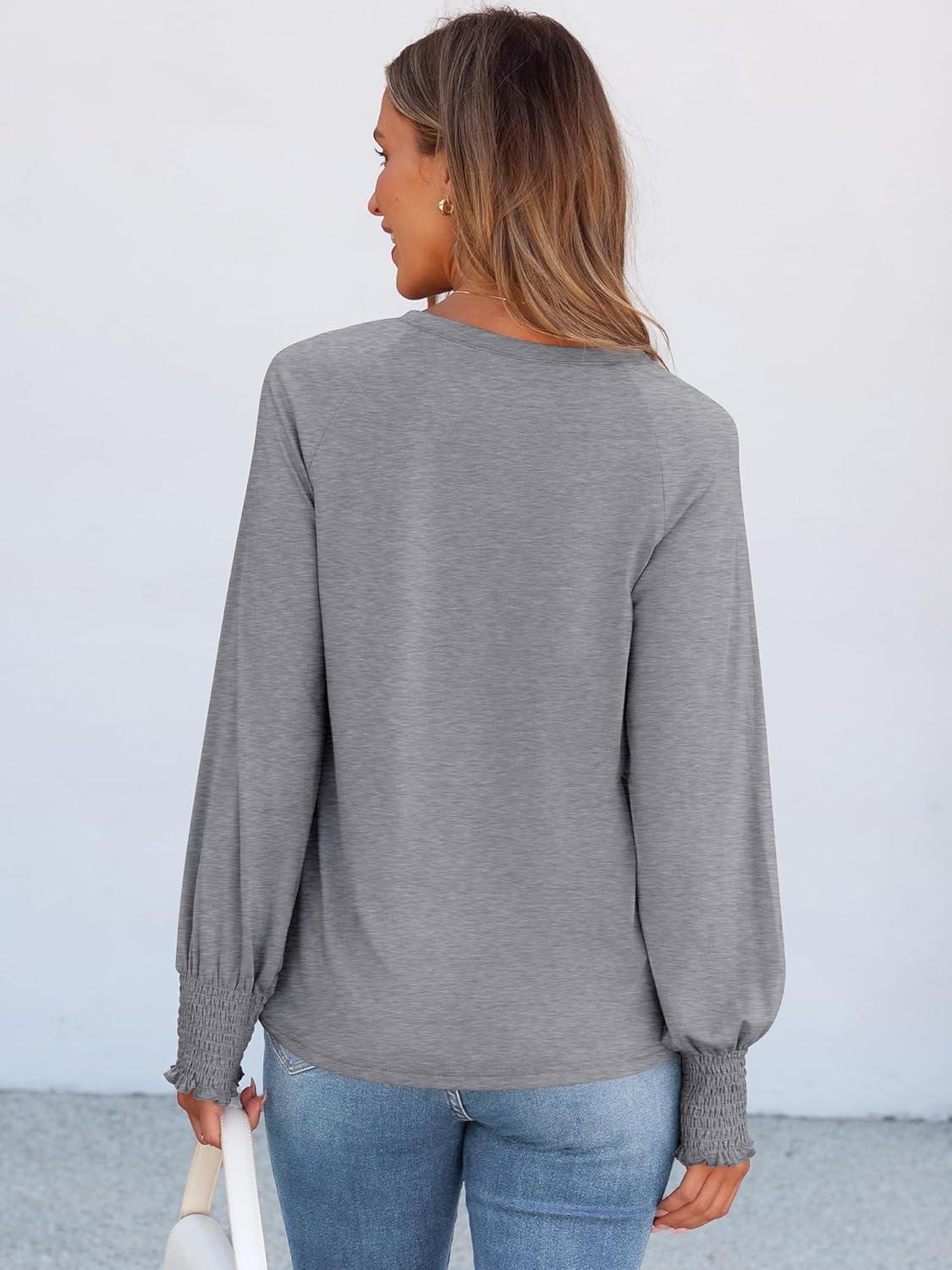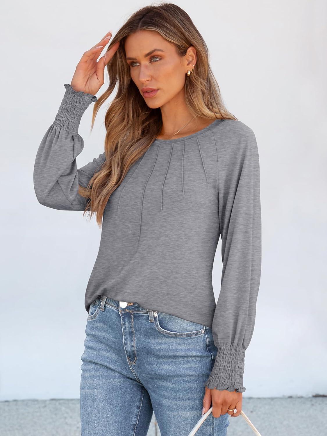 ANRABESS Long Sleeve Shirts for Women 2025 Fall Dressy Casual Tops Pleated Crewneck Loose Basic Blouses Fashion(Grey)