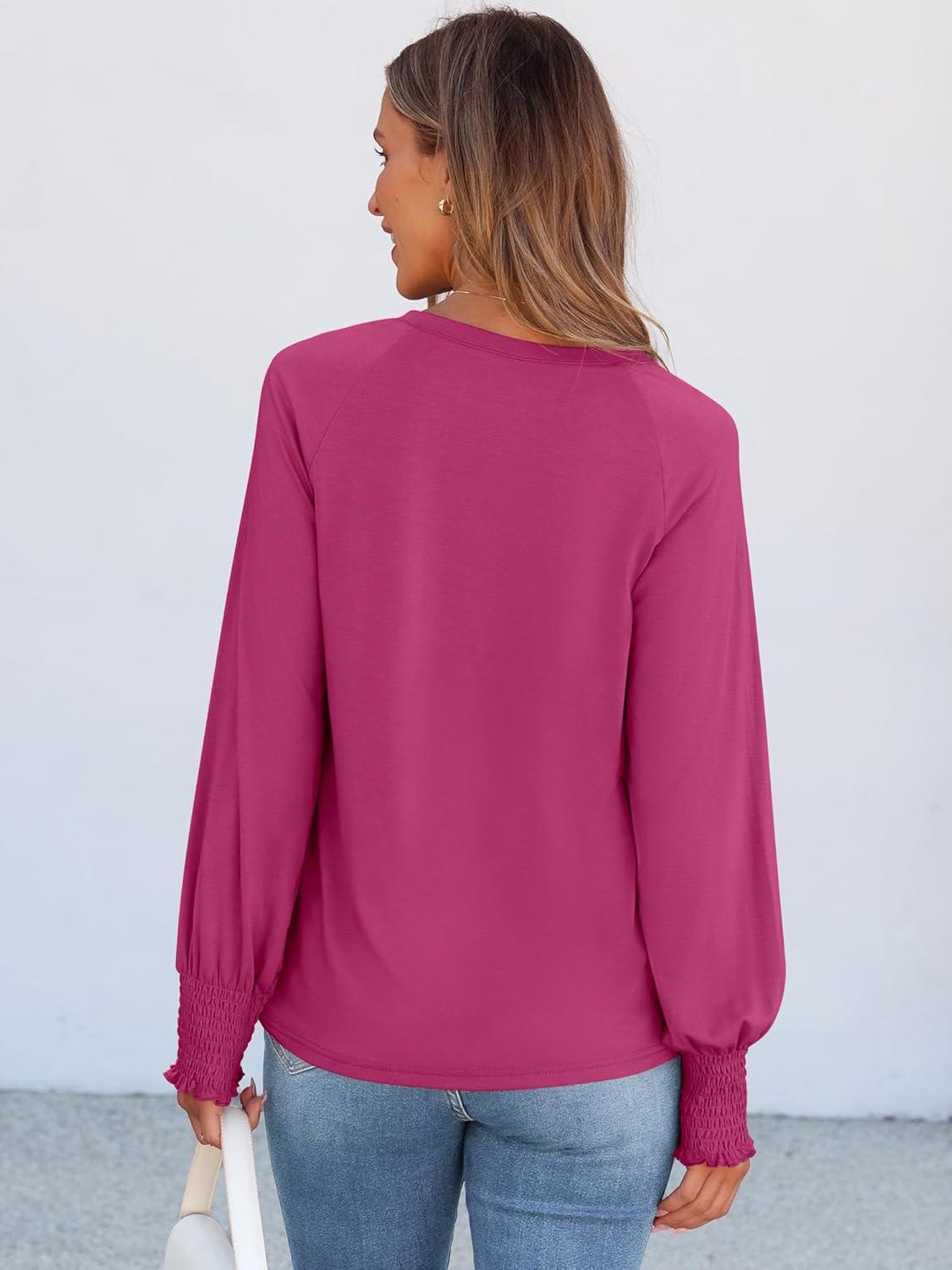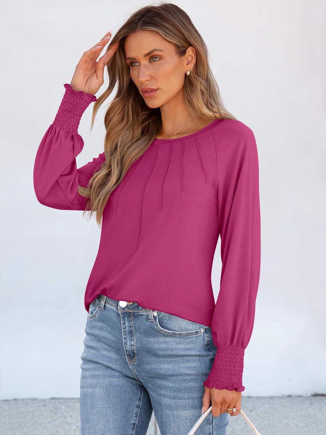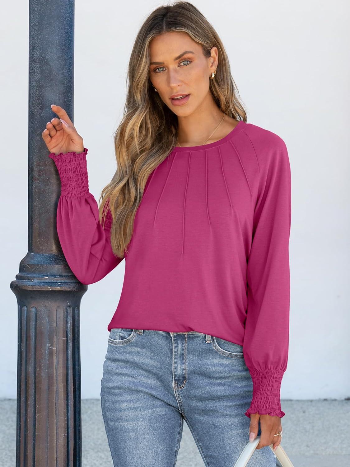 ANRABESS Long Sleeve Shirts for Women 2025 Fall Dressy Casual Tops Pleated Crewneck Loose Basic Blouses Fashion(Hot Pink)