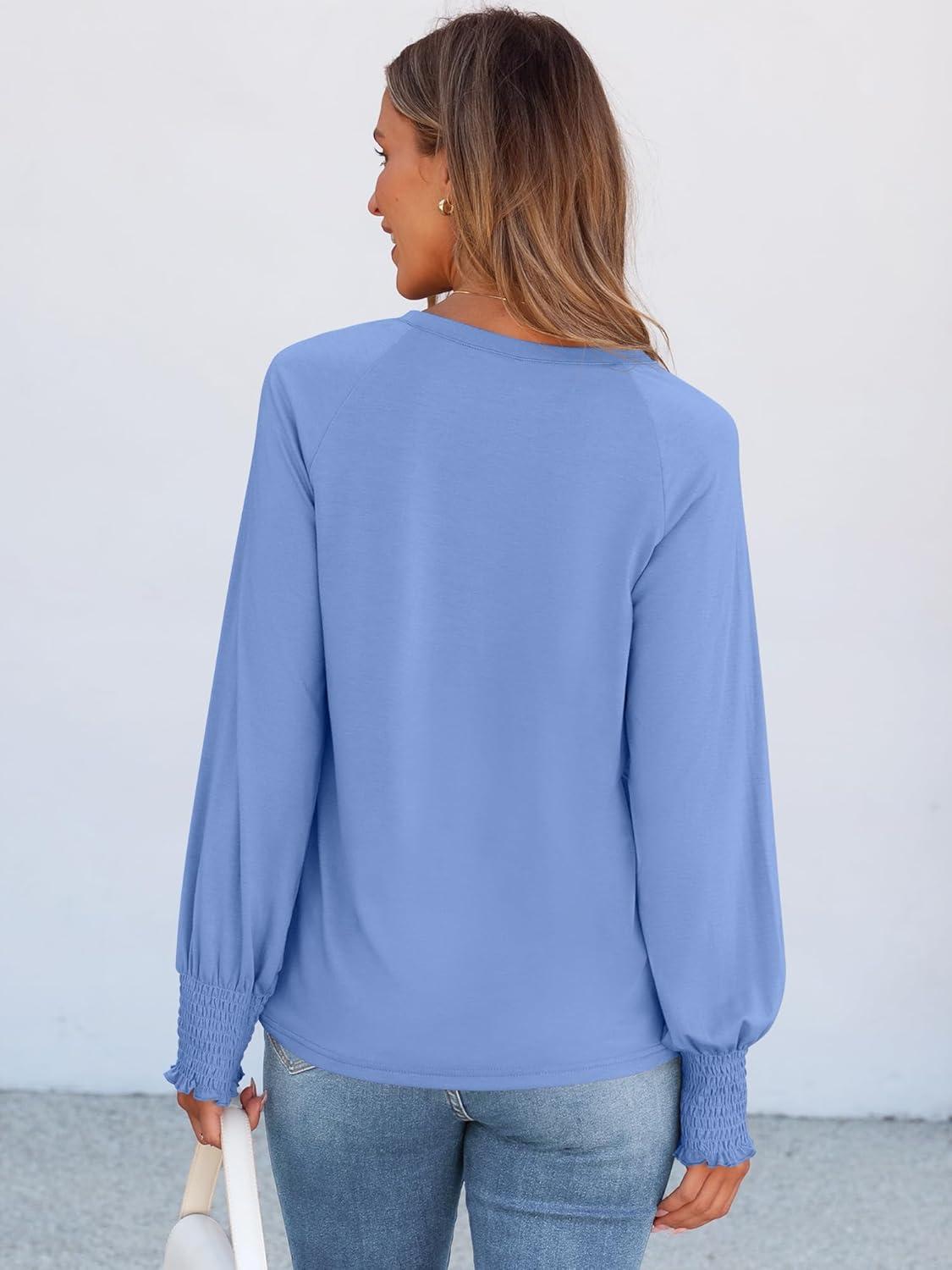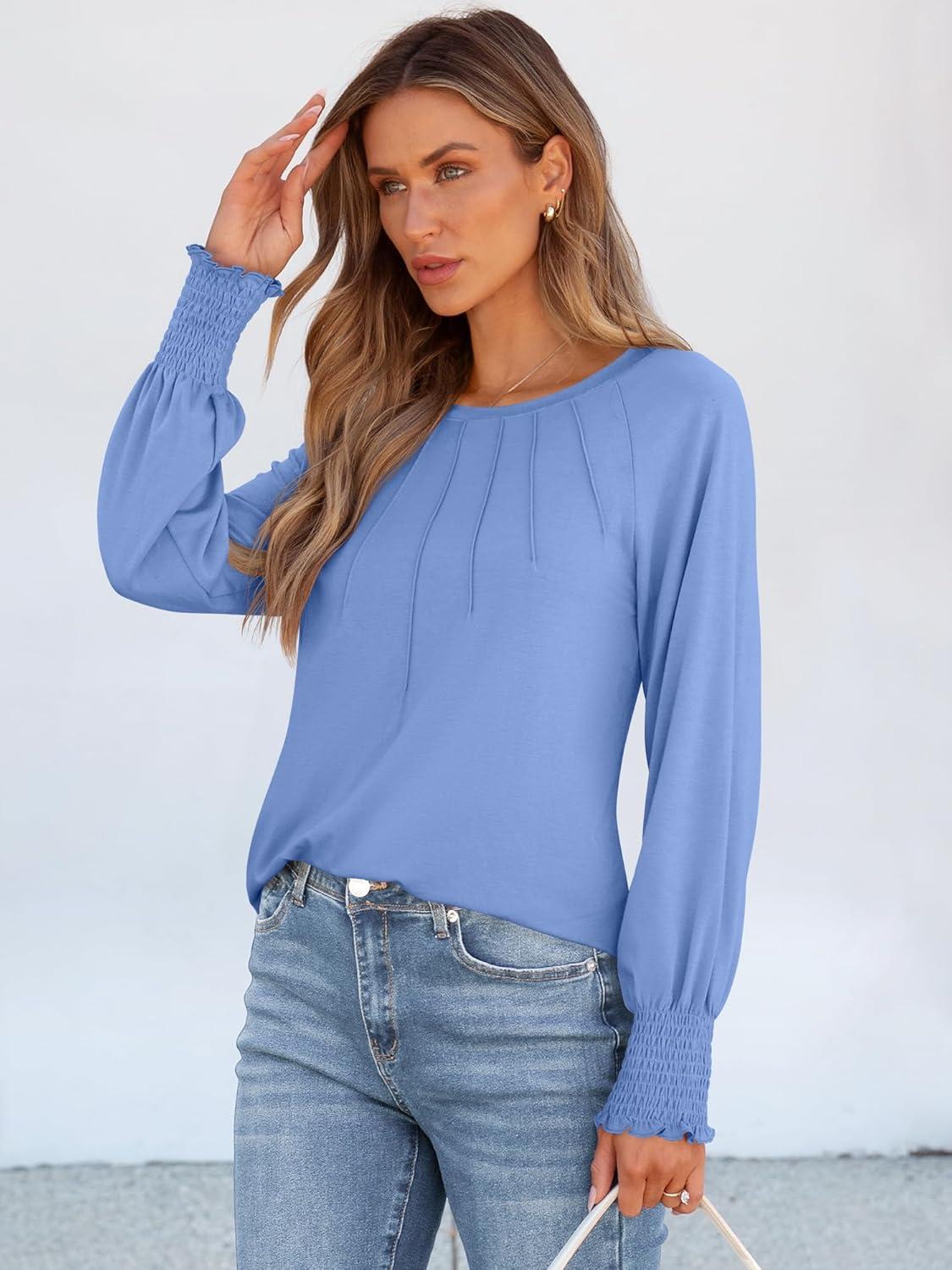ANRABESS Long Sleeve Shirts for Women 2025 Fall Dressy Casual Tops Pleated Crewneck Loose Basic Blouses Fashion(Light Blue)
