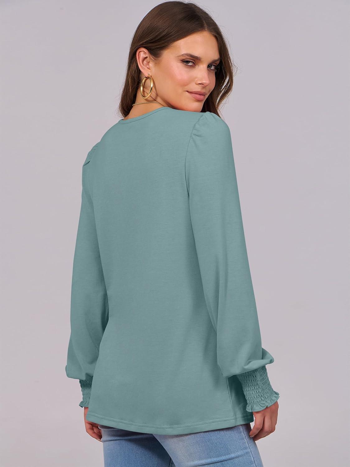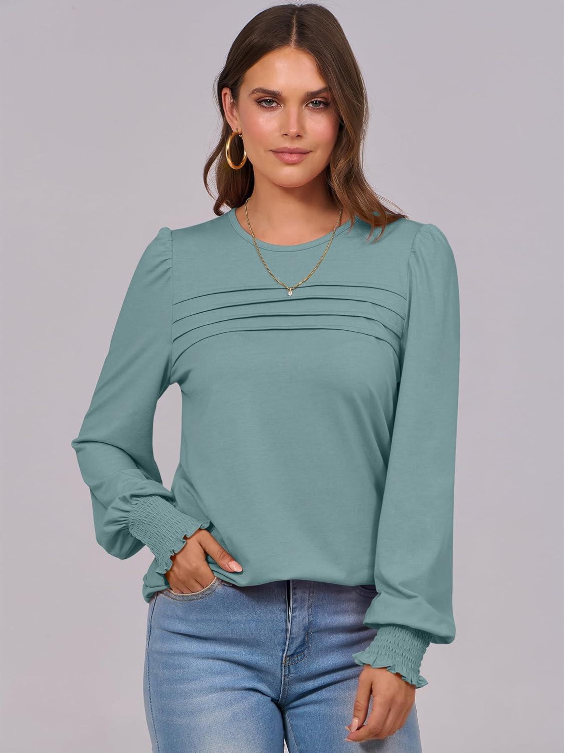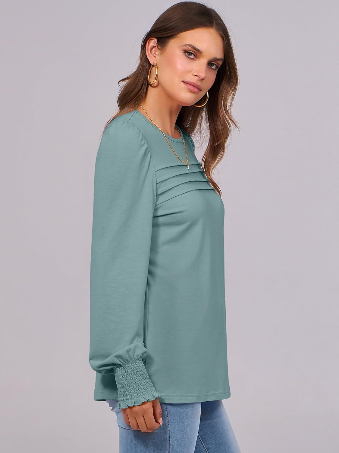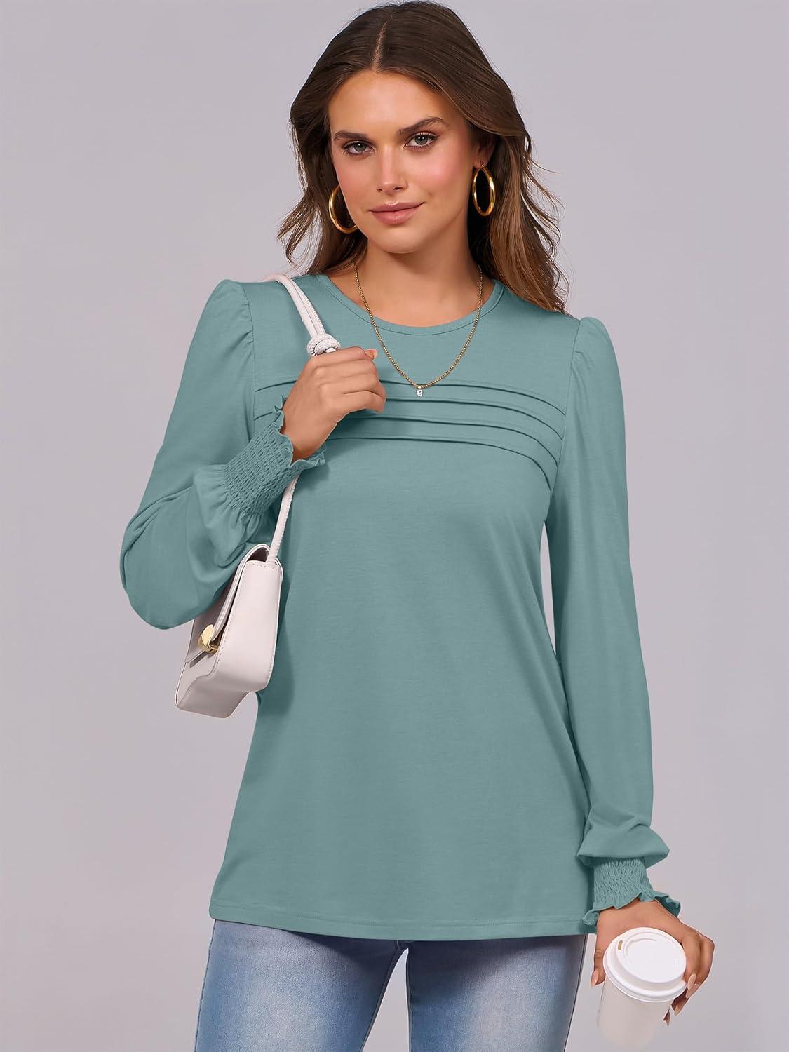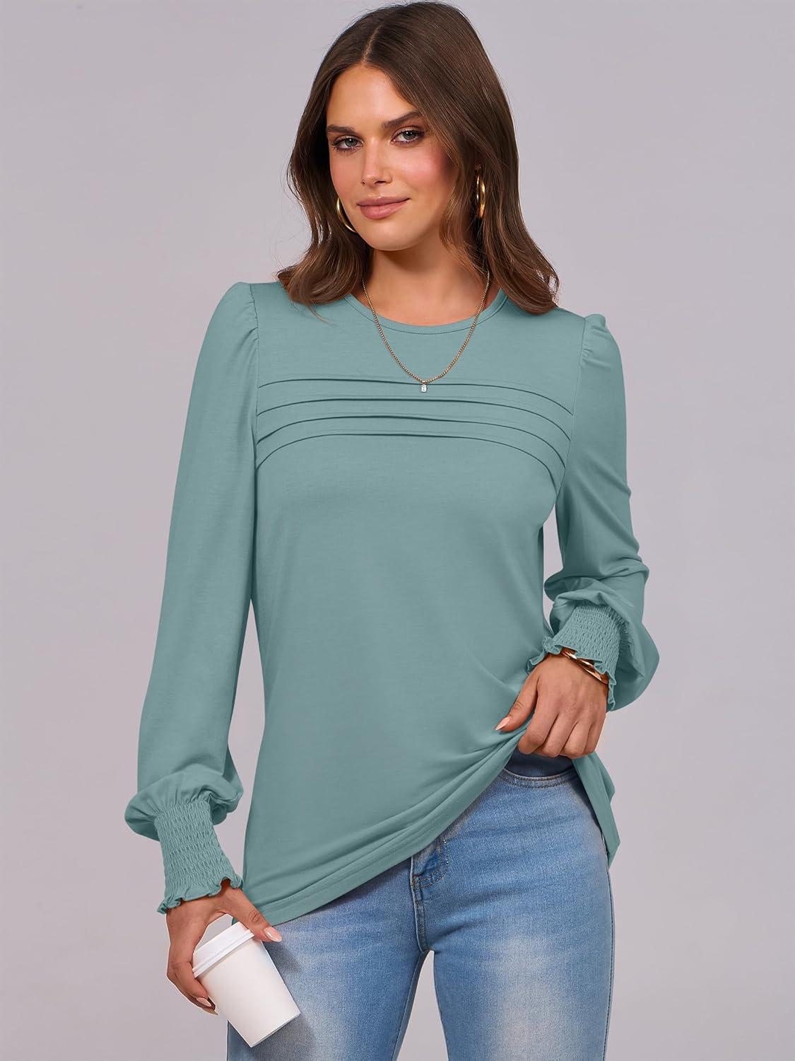 ANRABESS Long Sleeve Shirts for Women Fall Fashion 2025 Dressy Casual Blouses Trendy Pleated Tunic Tops Outfits(Green Blue)