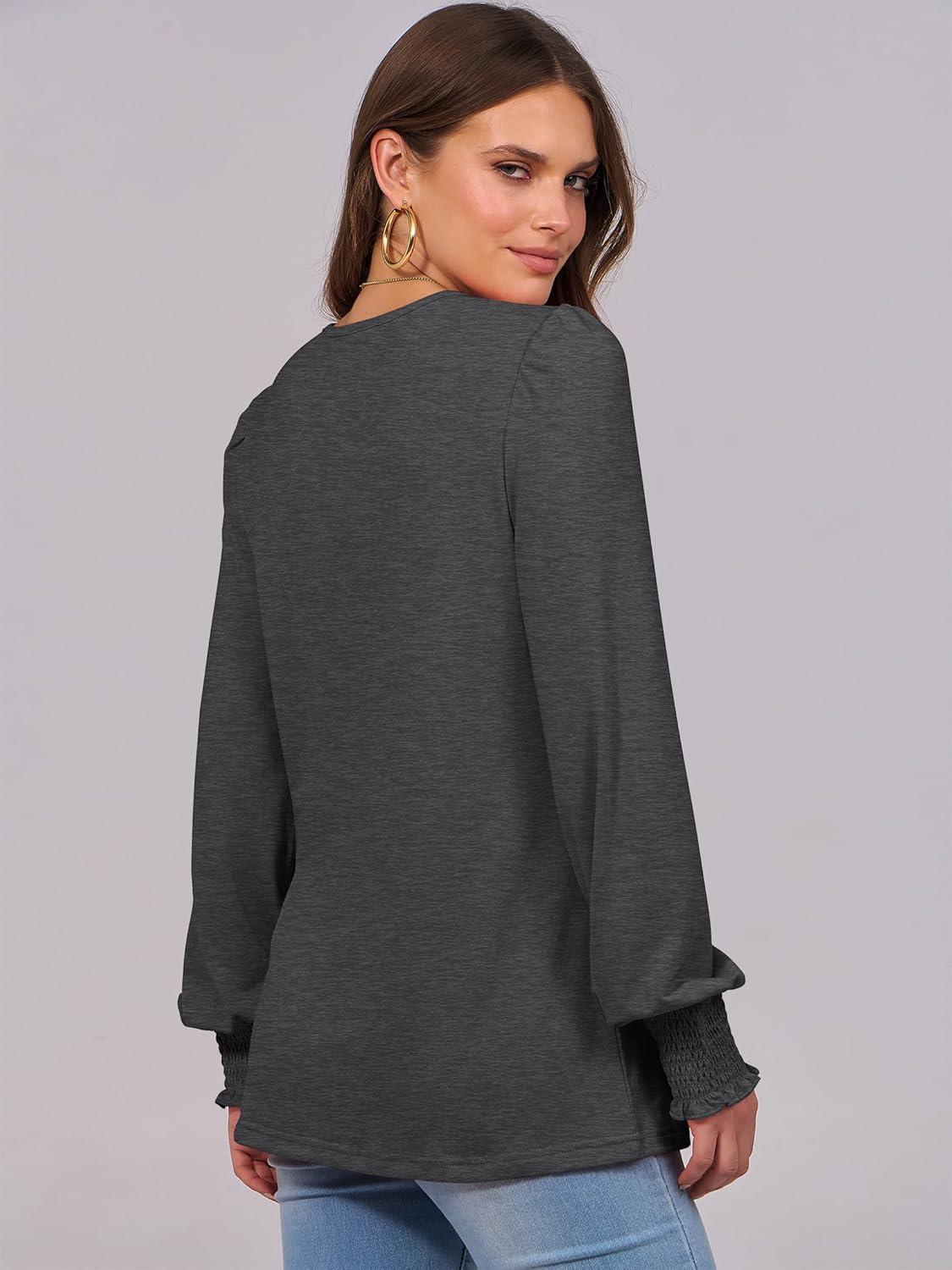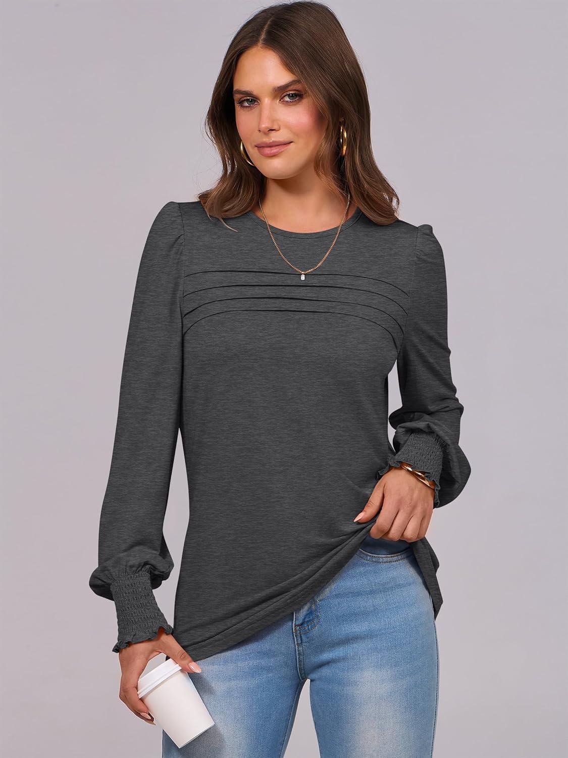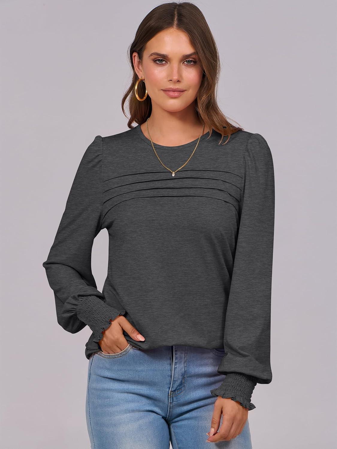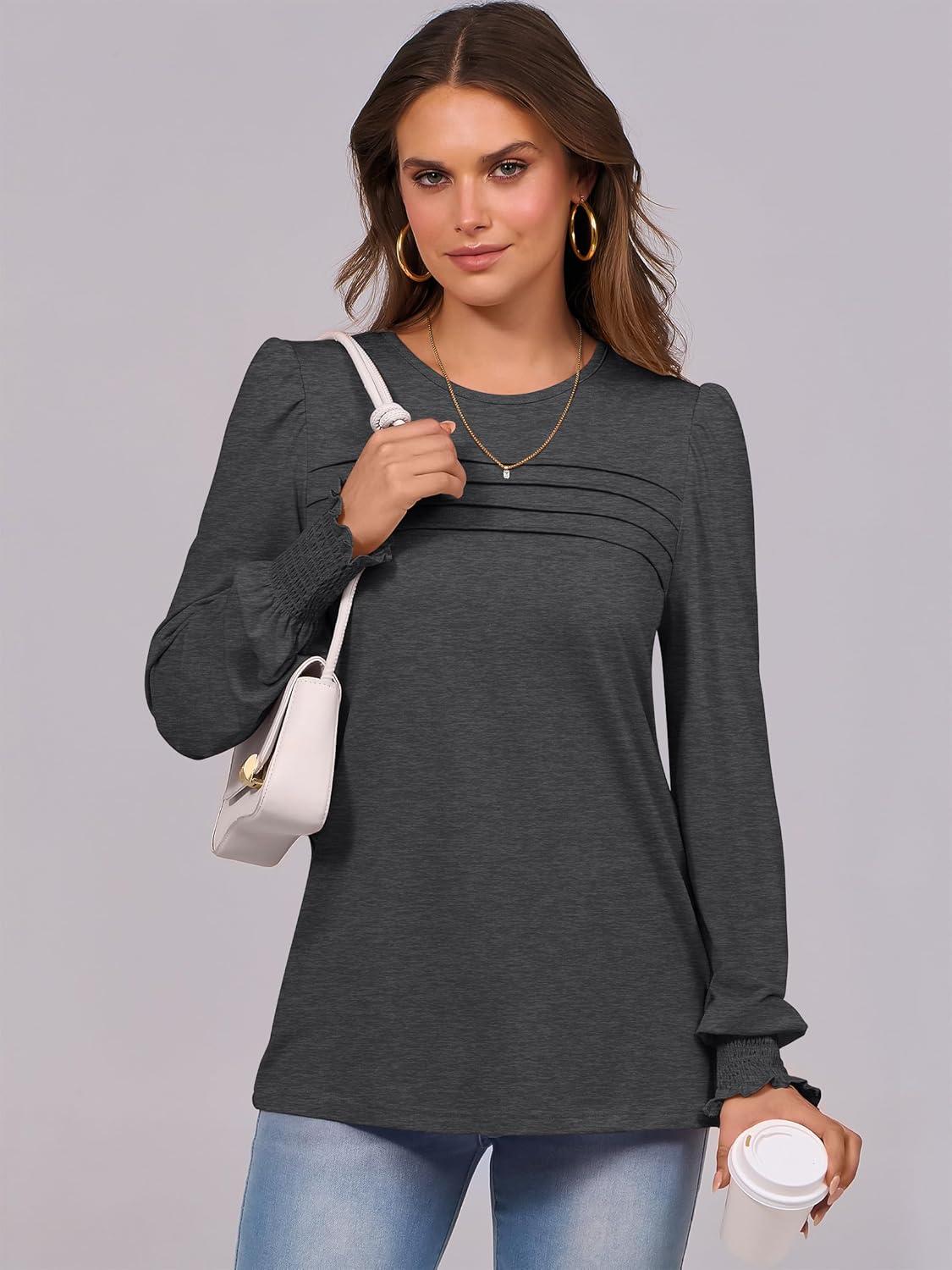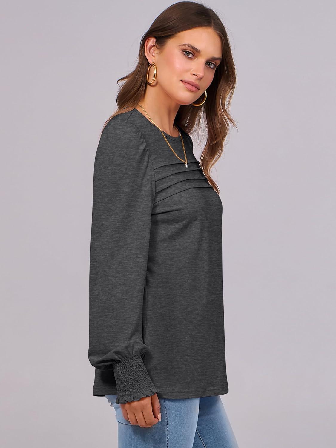 ANRABESS Long Sleeve Shirts for Women Fall Fashion 2025 Dressy Casual Blouses Trendy Pleated Tunic Tops Outfits(Grey)