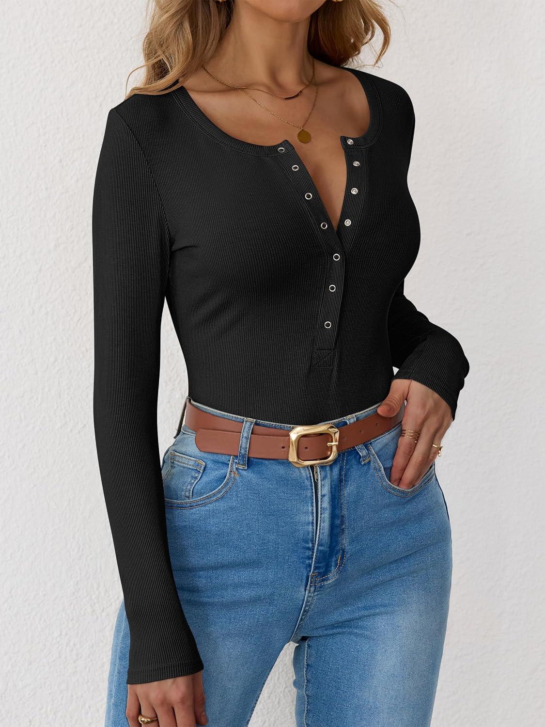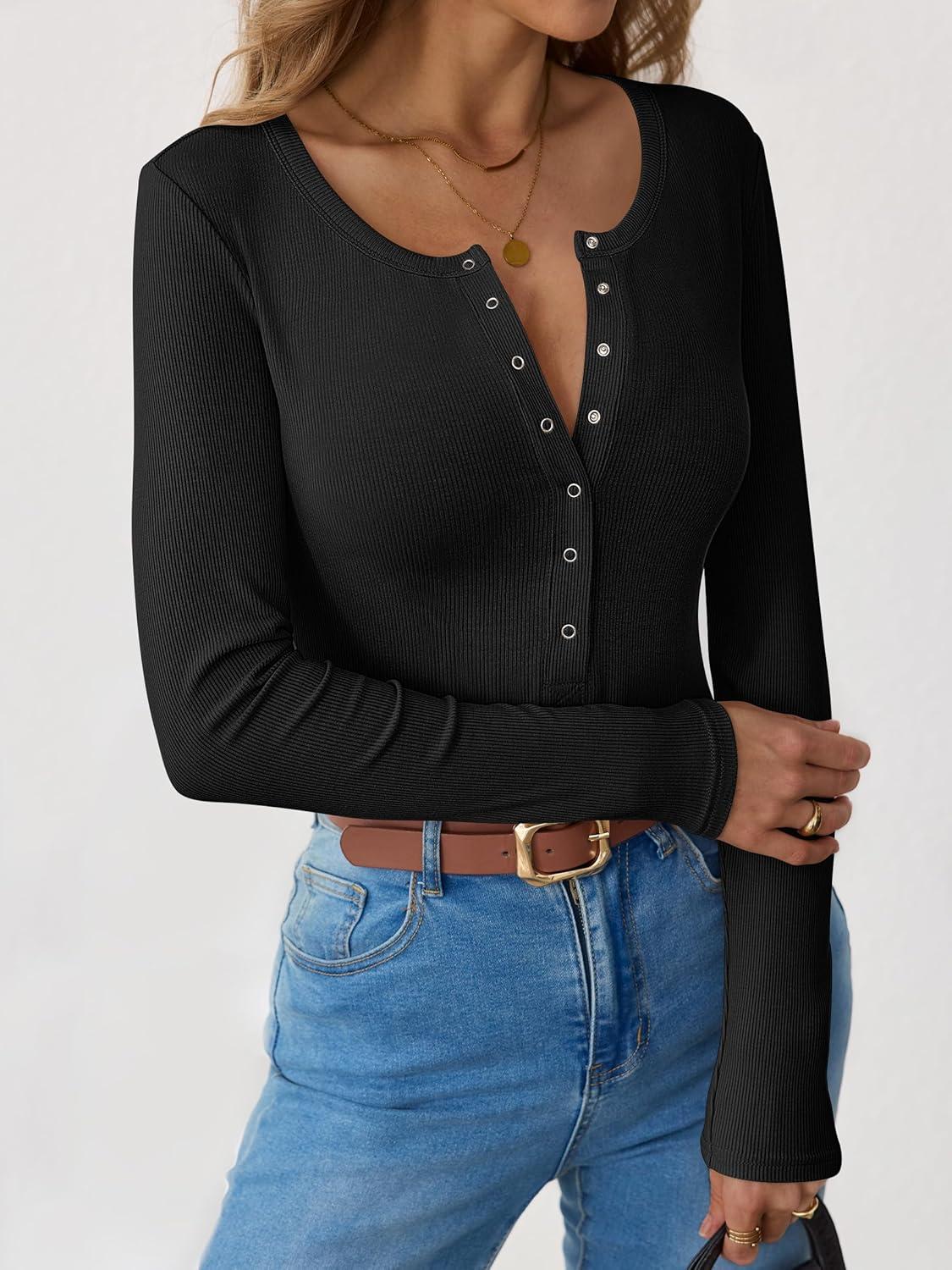 ANRABESS Long Sleeve Shirts for Women Henley Button Down Tops Ribbed Knit Slim Fit Fall Basic Tee 2025 Casual Trendy Clothes(Black)