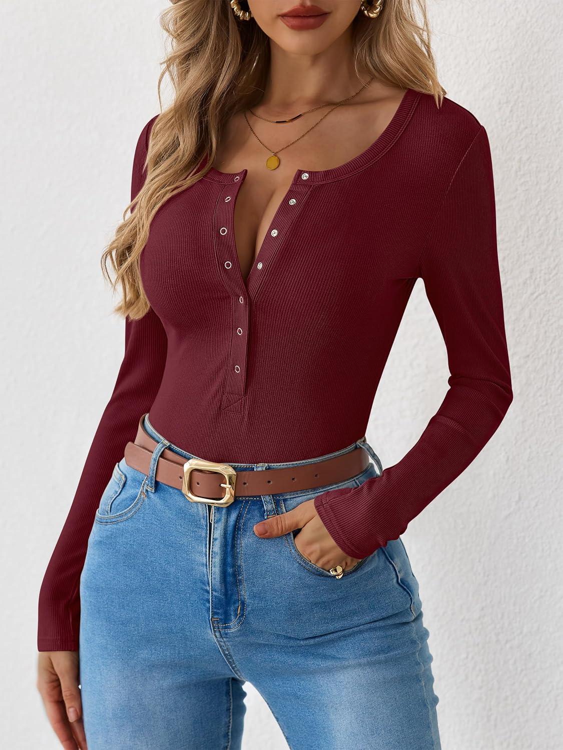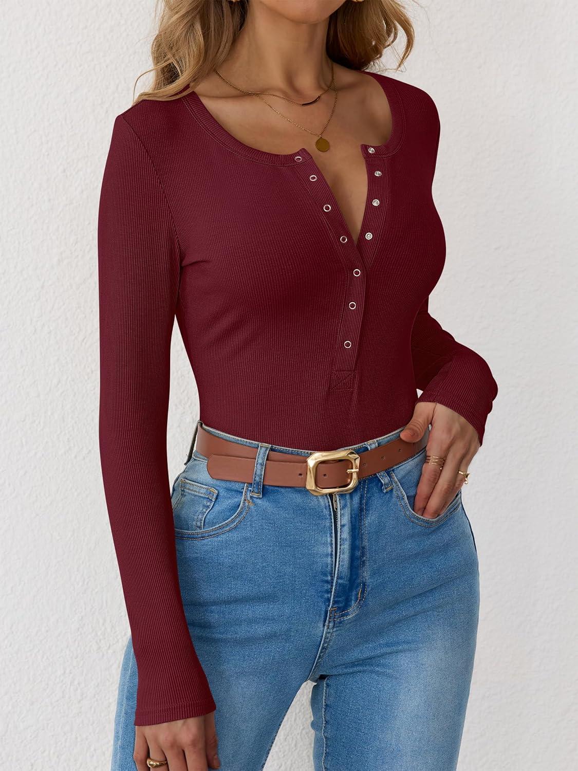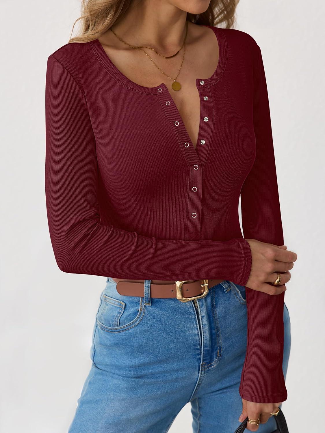 ANRABESS Long Sleeve Shirts for Women Henley Button Down Tops Ribbed Knit Slim Fit Fall Basic Tee 2025 Casual Trendy Clothes(Burgundy)