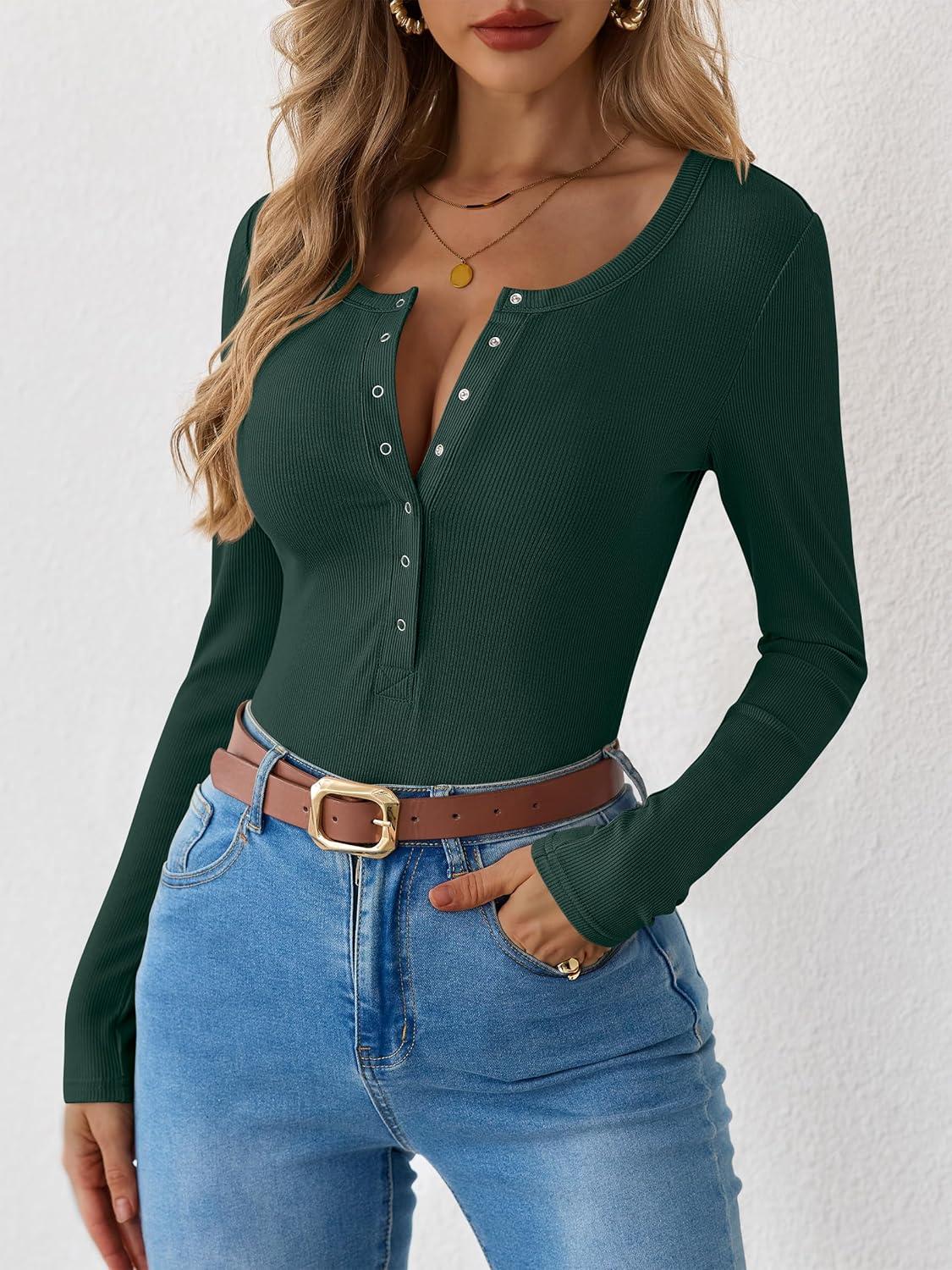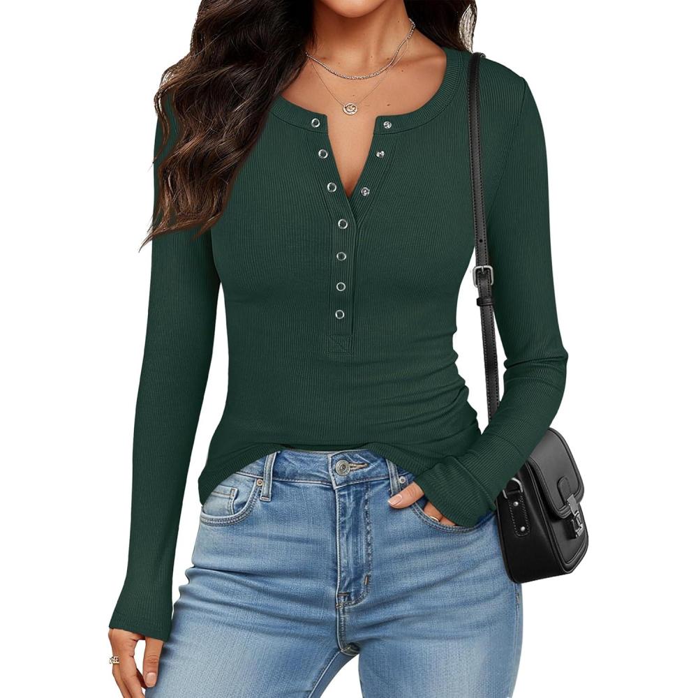ANRABESS Long Sleeve Shirts for Women Henley Button Down Tops Ribbed Knit Slim Fit Fall Basic Tee 2025 Casual Trendy Clothes(Forest Green)