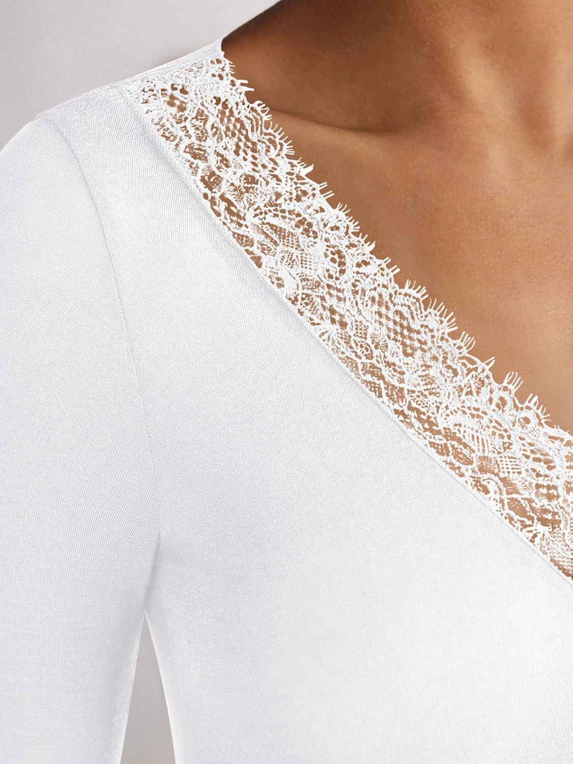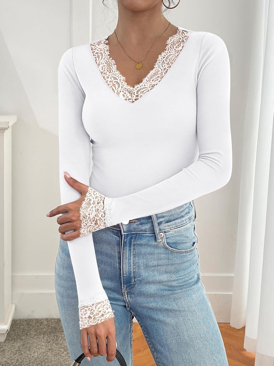 ANRABESS Long Sleeve Shirts for Women Lace V Neck Slim Fit Basic T-Shirt Dressy Casual Blouses 2025 Trendy Fall Going Out Top(White)