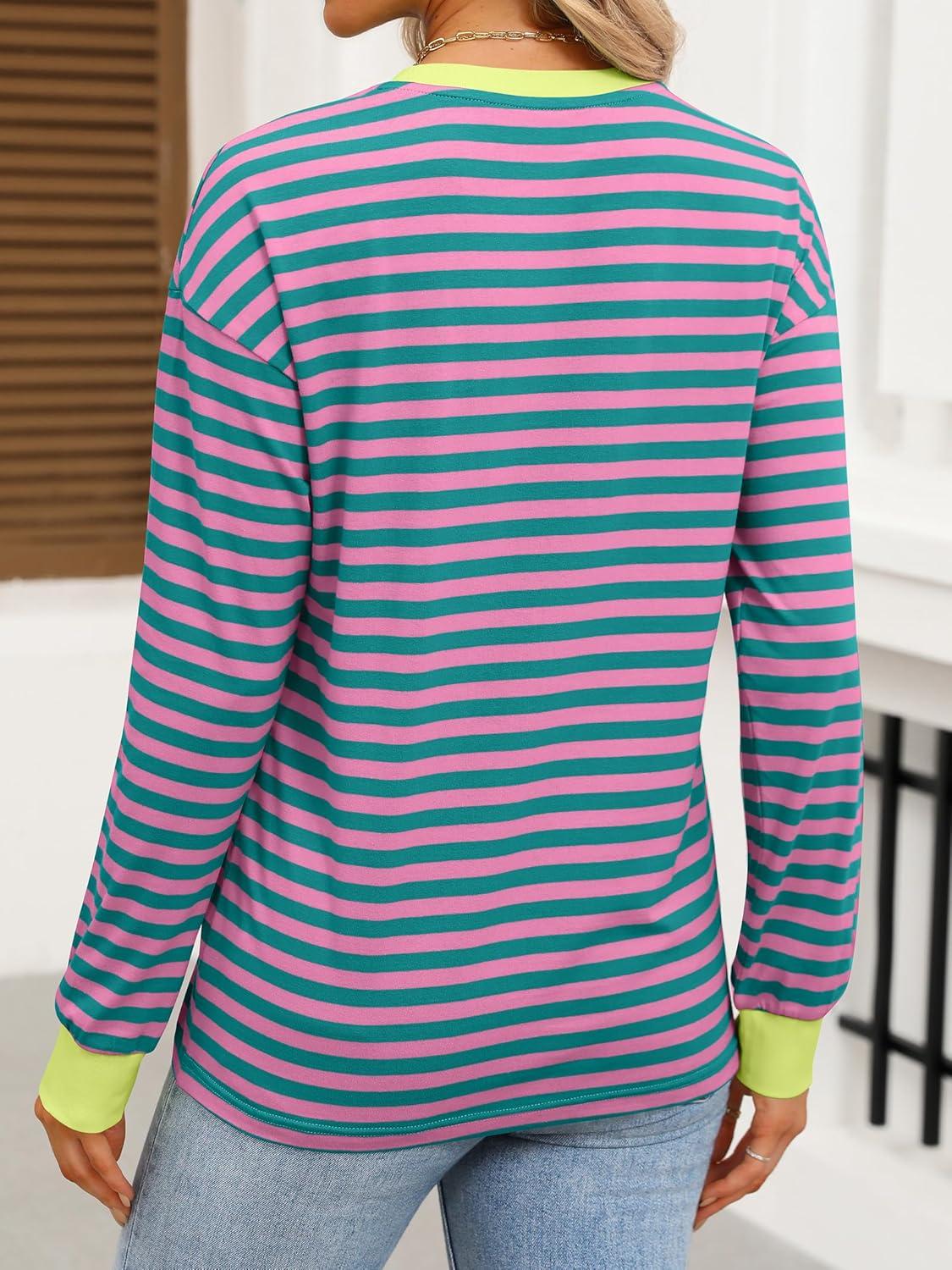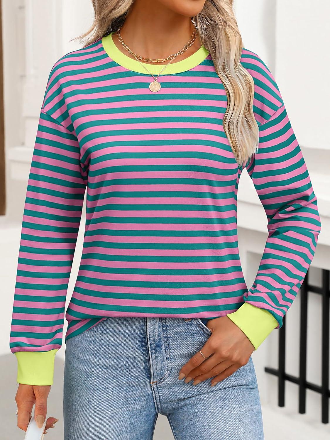 ANRABESS Long Sleeve Shirts for Women Striped Crewneck Loose Fit Tunic Tops 2025 Fall Color Block T-Shirt(Pink Stripes Combo)