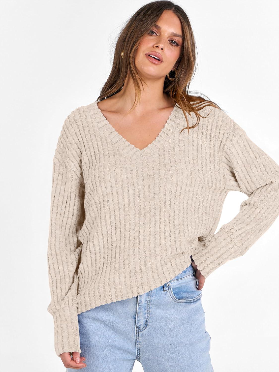ANRABESS Long Sleeve Shirts for Women V Neck Casual Fall Tops Loose Fit Lightweight Sweaters Tunic Fashion 2025 Clothes(Beige)